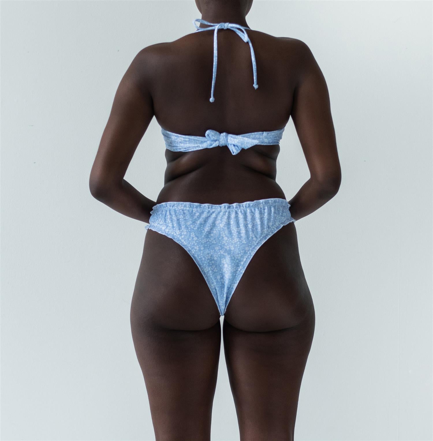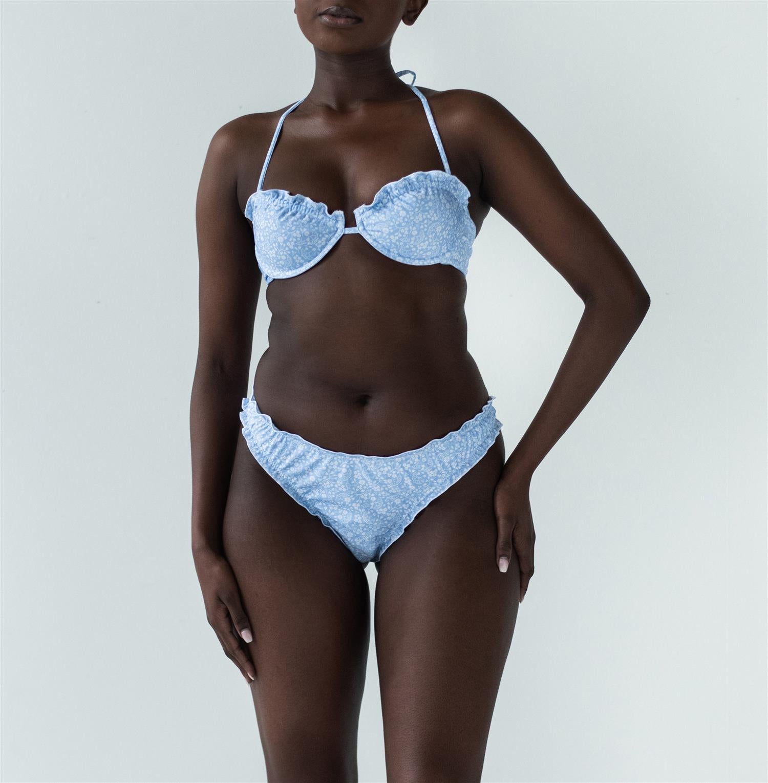 Sea Bikini Bottom Light Blue Print fra Seaquelle er bikini truser med rysjekant på sidene og høy benskjæring. Trusen gir moderat dekning. Sea Bikini bottom er håndlaget og begrenset antall kassert havmateriale.