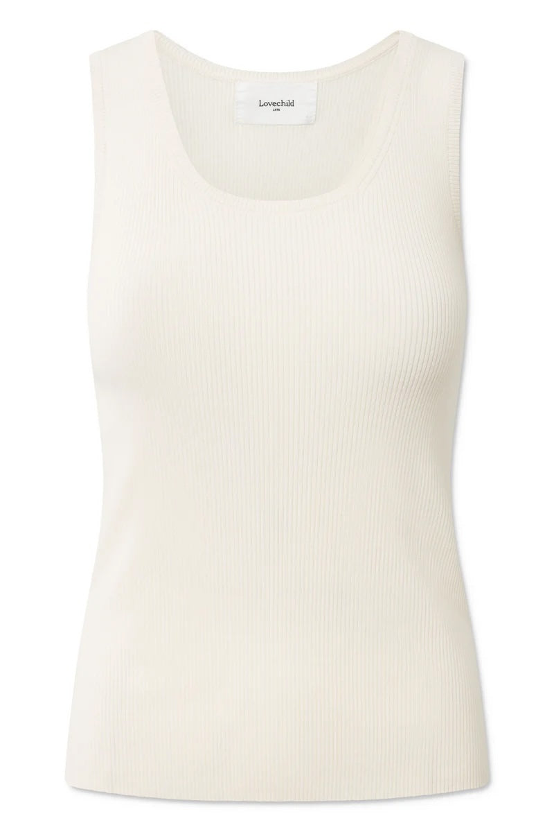 Karla Top Egret fra Lovechild. Klassisk singlett i deilig merinoull. Singletten har en dyp rund hals og brede stropper. Passformen er kroppsnær og avslappet. Et perfekt baseplagg til garderoben, som kan brukes året rundt. Alene, under en blazer eller strikk.