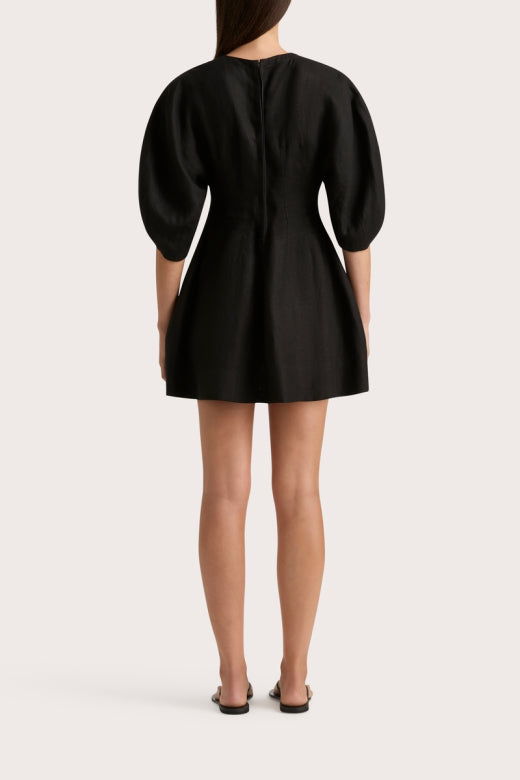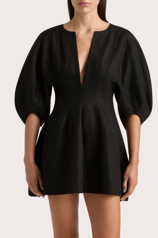 Soleil Mini Dress Black fra Faithfull the Brand. En minikjole med lav splitt i halsen og overdimensjonerte avrundede ermer som når ned til albuen. Den er forestilt i sort 100 % europeisk Flax®-lin, og smyger seg inn i midjen før den faller inn i et mykt A-skjørt med plisserte detaljer. En klassisk kjole i behagelig lin du kan bruke år etter år.