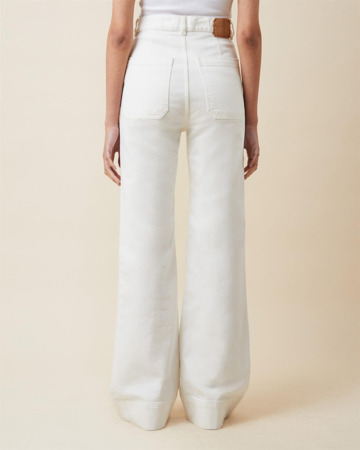 St Monica Jeans Natural White fra Jeanerica. Jeansen er inspirert fra sjømannsarkiver fra slutten av 1960-tallet med sine lappede lommer, flare og brede kantlinjer.