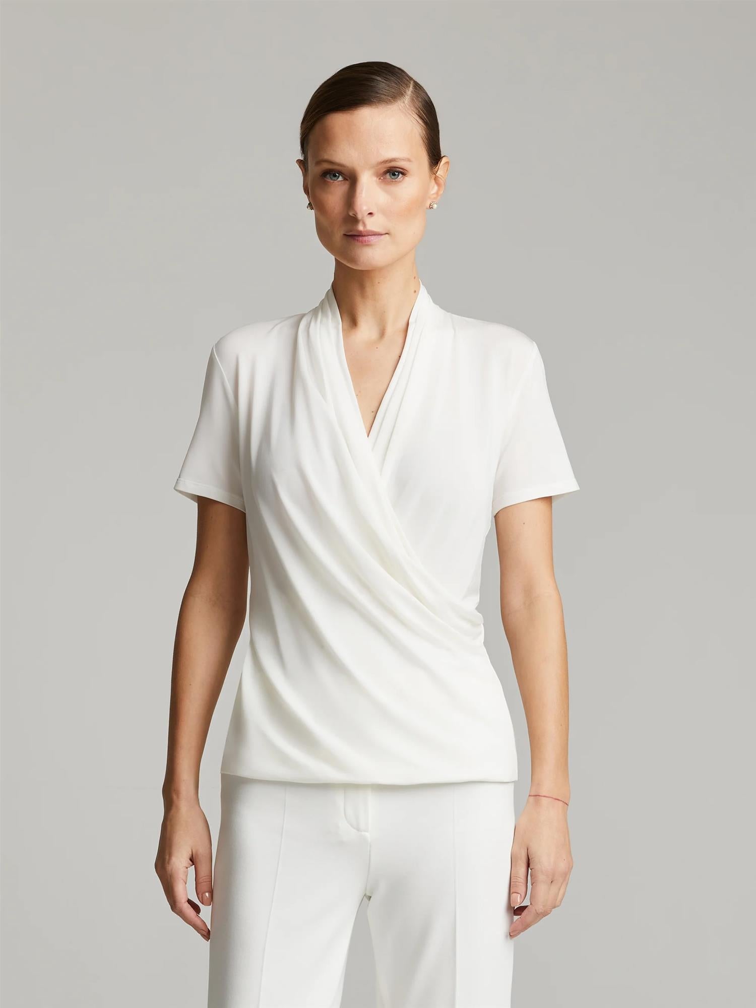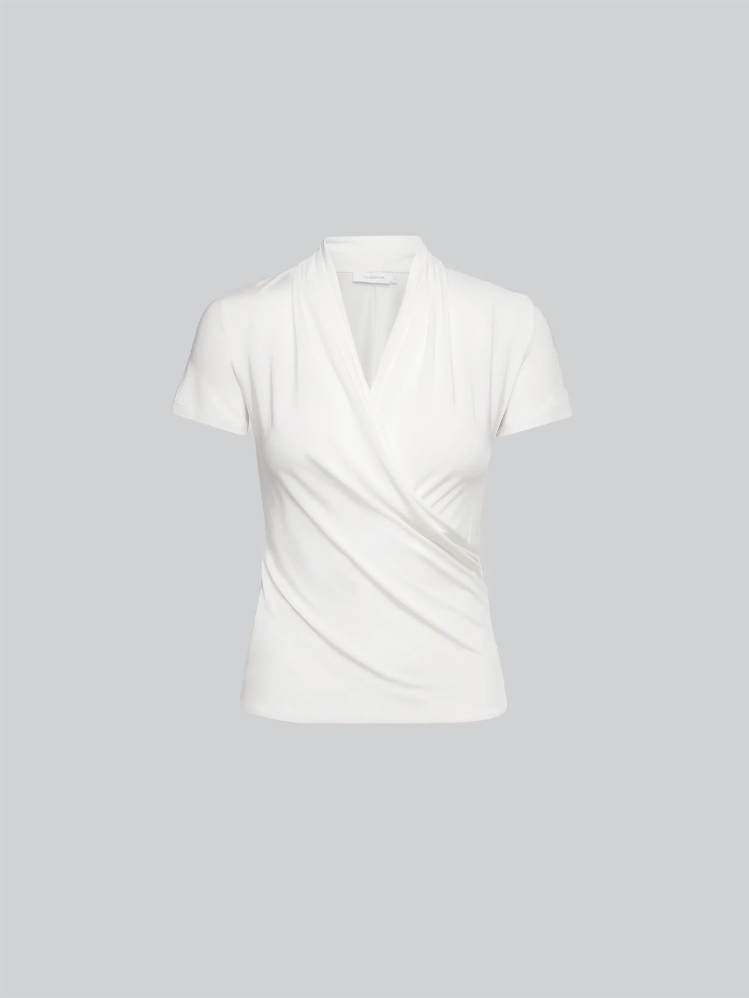 Fifi Top White fra Andiata. En wrap-style topp med detaljer foran. Toppen har t-skjorteermer og har en smal passform. En topp til basegarderoben som kan styles opp og ned etter anledning.