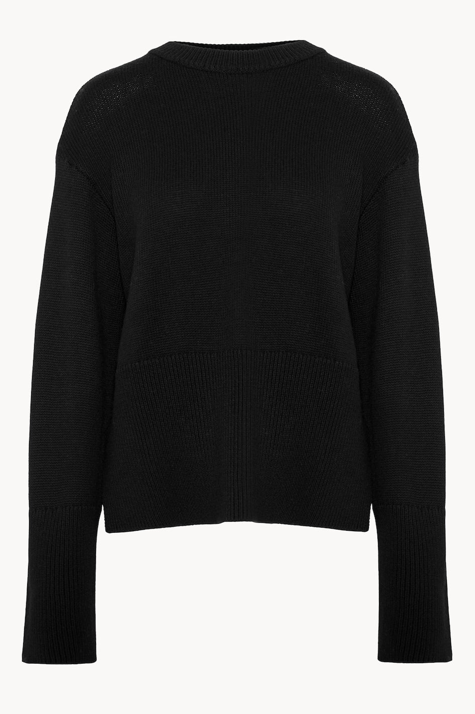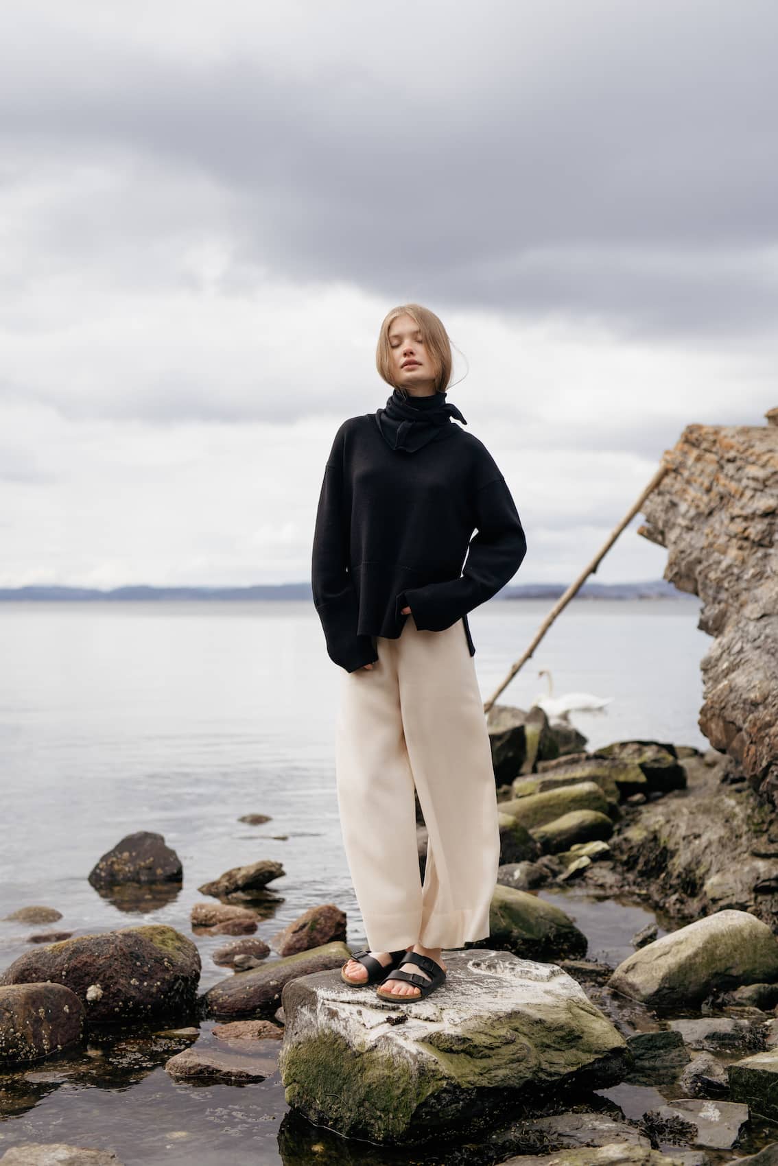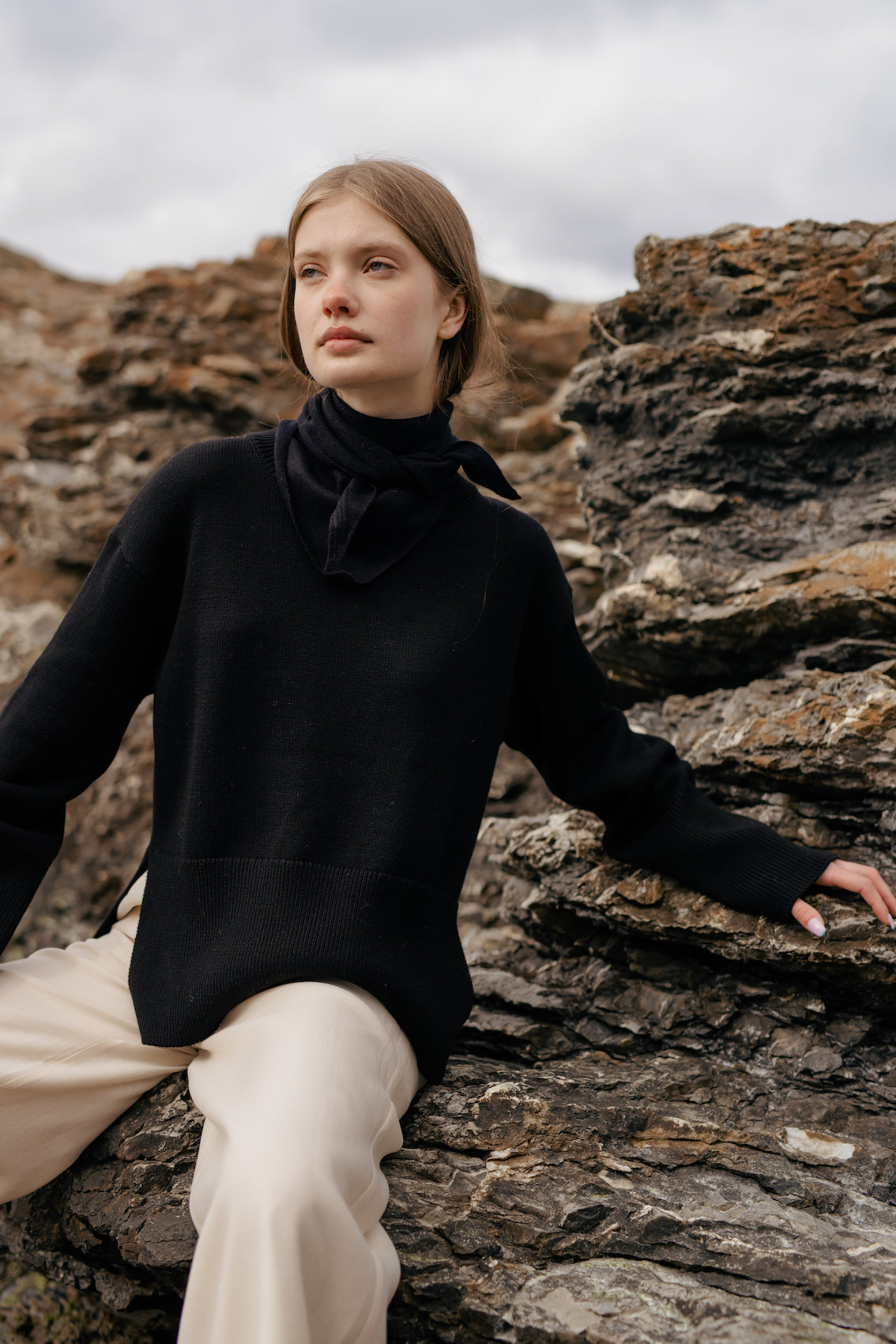 Henny Merino Sweater Black fra Christian Aks. Henny genser har en løs og boxy passform med senkede skuldre. Stor vrangbord på mansjetten og nederst, splitt i sidene. En enkel start for den perfekte høststemningen.