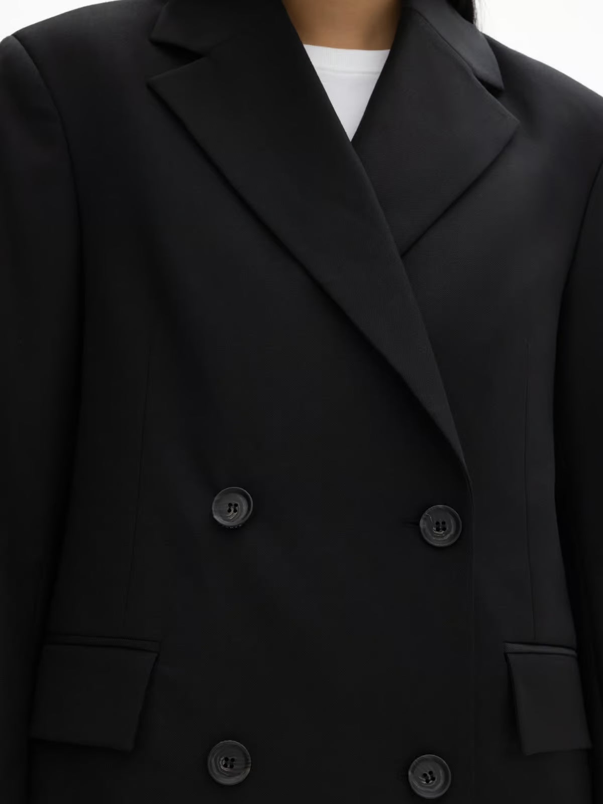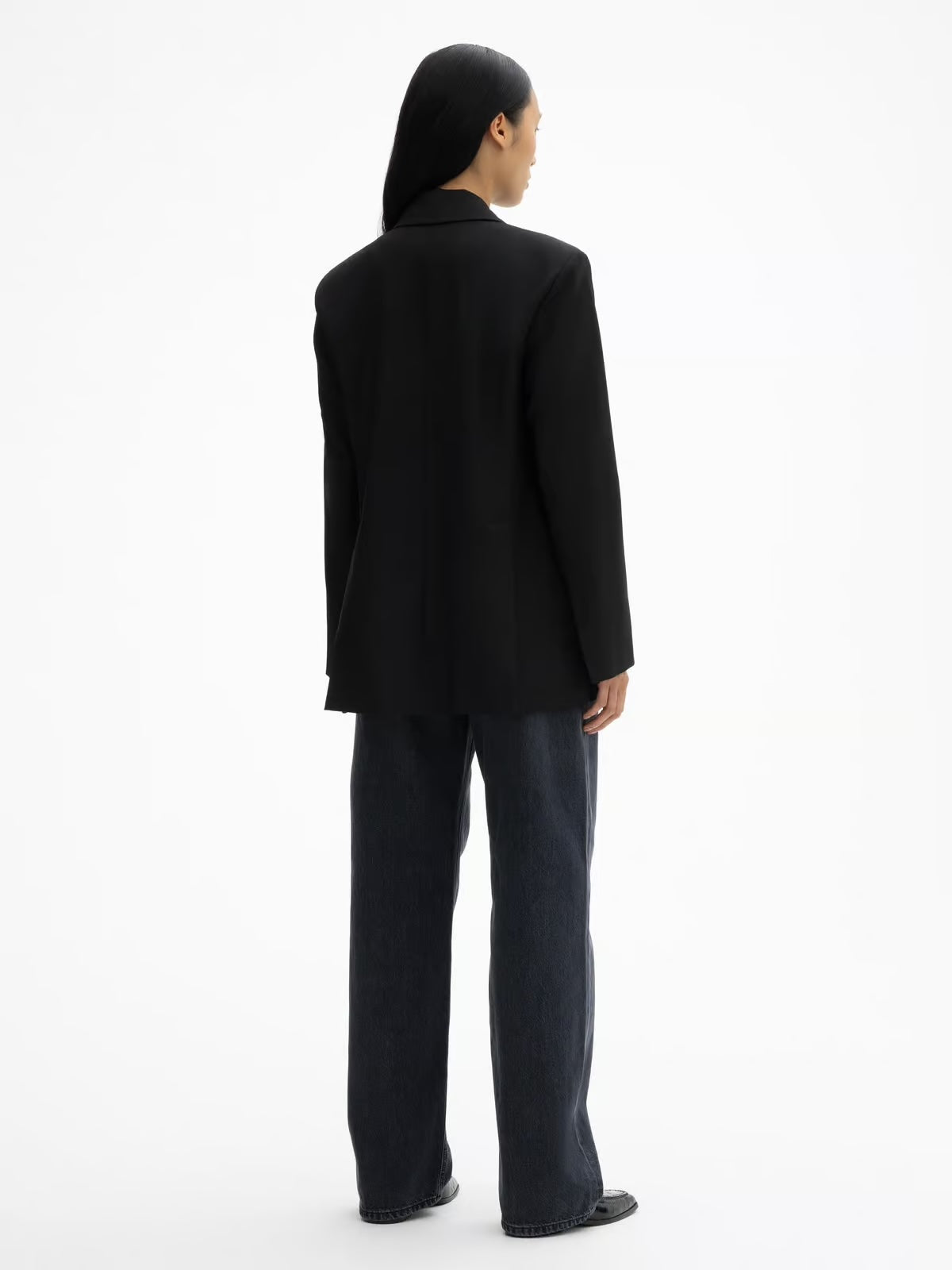 Classic Wool Blazer Black fra Dagmar. Classic Wool Blazer er laget i dressstoffet i ullblanding, og er en skarpt skreddersydd jakke med en uanstrengt flyt. Dobbeltspent, denne sofistikerte Dagmar-klassikeren er et garderobeikon komplett med skjulte trykknapper, et jakkeslag, en splitt bak og klafflommer på sidene.