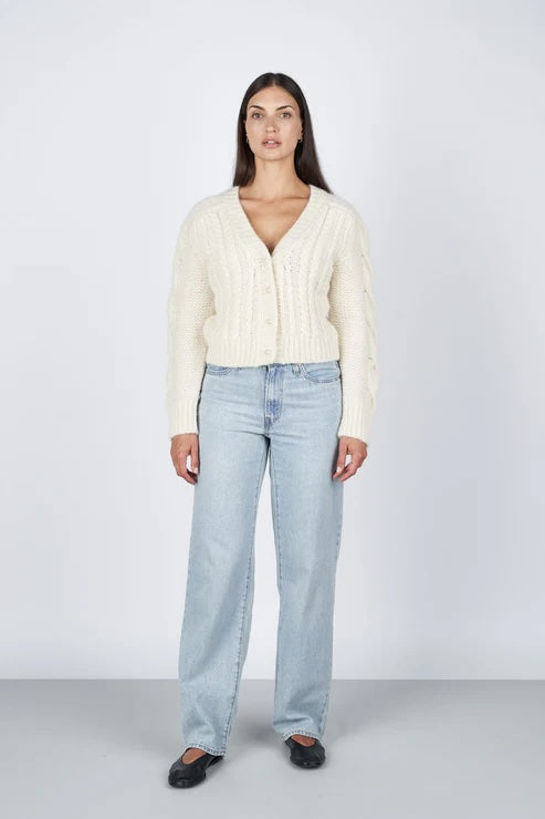 Elma Cardigan Off White fra O'tay. Elma er en av våre mest luksuriøse cardigans fra Italia. Cardiganen er laget i et bedårende mønster i den ultramyke babyalpakka/merinoullkvaliteten. Vi elsker det feminine og detaljerte utseendet cardiganen har, hvor perleknappene gir den siste touchen. Stilen har en kul look, hvor skulderen "starter" lenger ned på overarmen, som også er kjent fra deres populære Merle Jumper. Cardiganen er normal i størrelsen, modellen har på seg størrelse M.