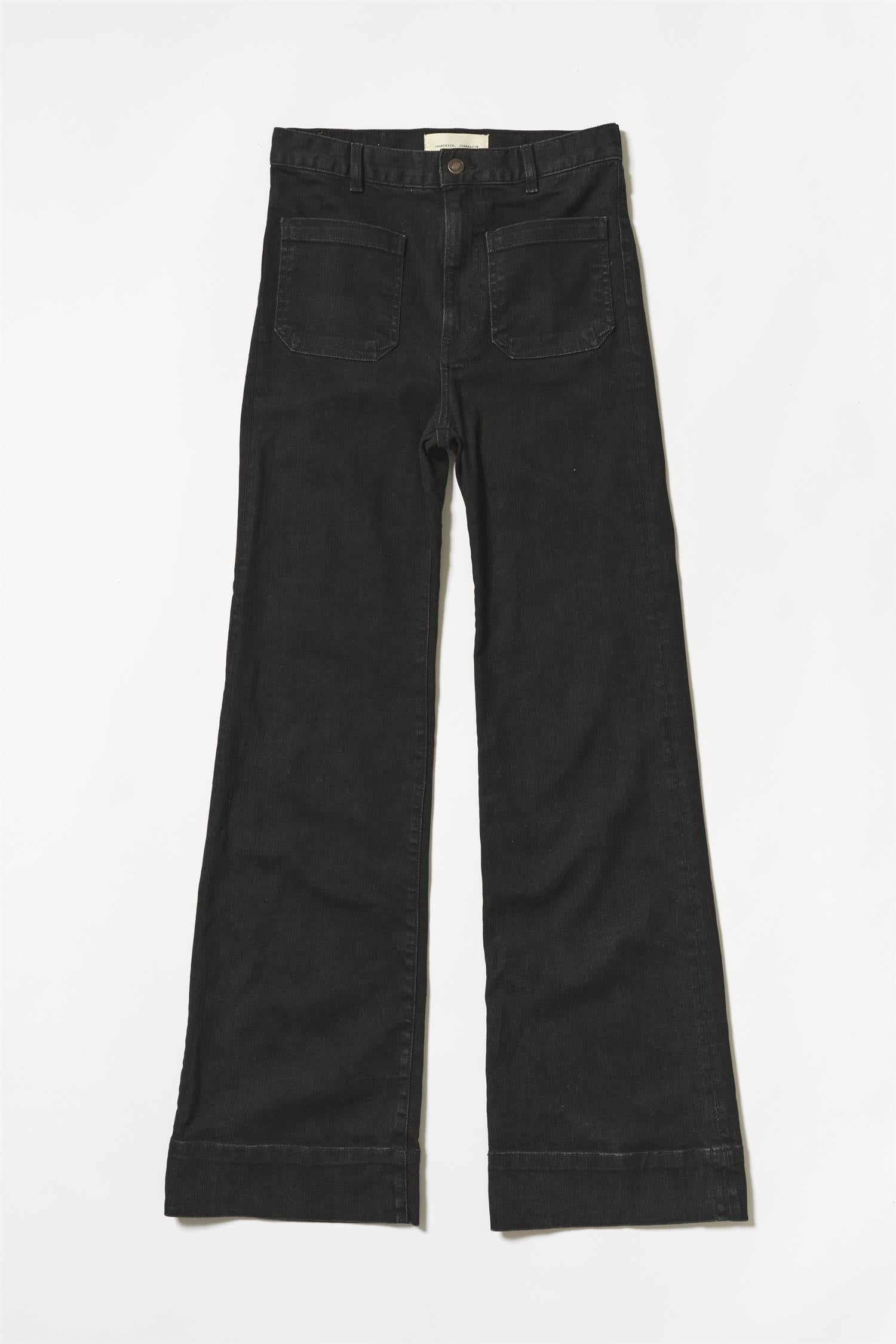 St Monica Jeans Black 2 Weeks fra Jeanerica. Jeansen er inspirert fra sjømannsarkiver fra slutten av 1960-tallet med sine lappede lommer, flare og brede kantlinjer.