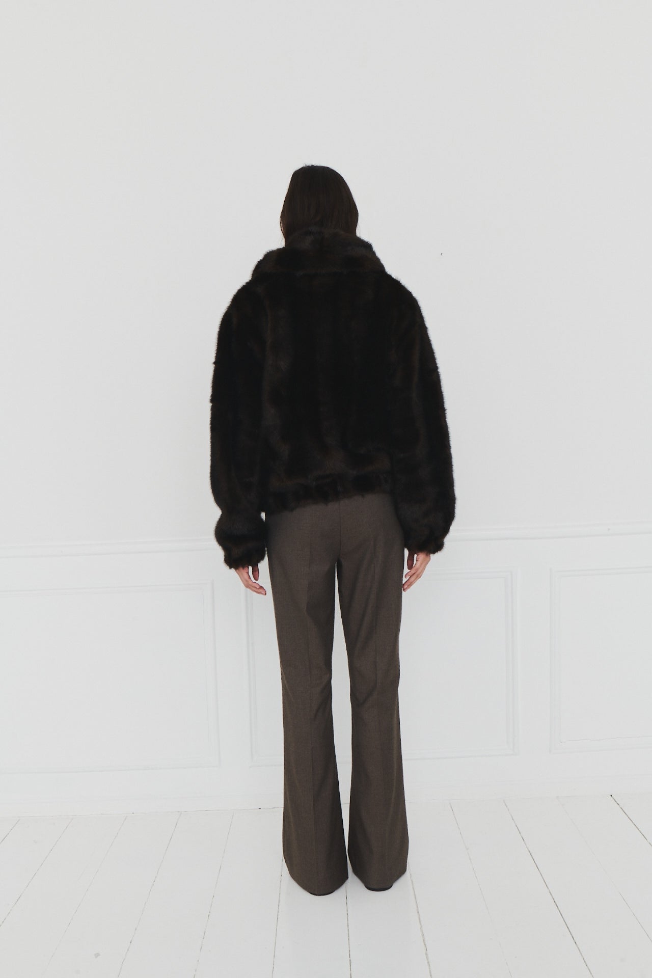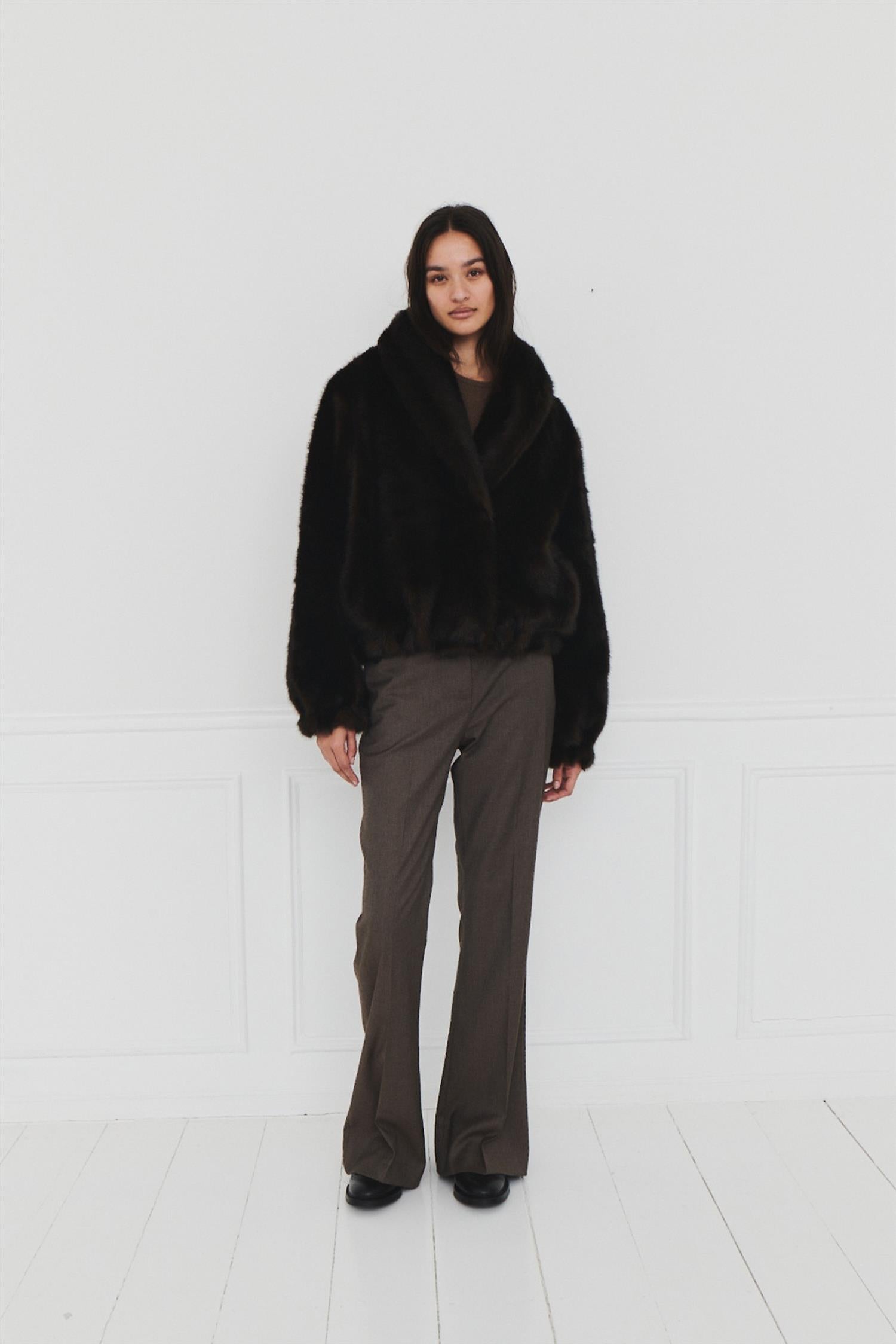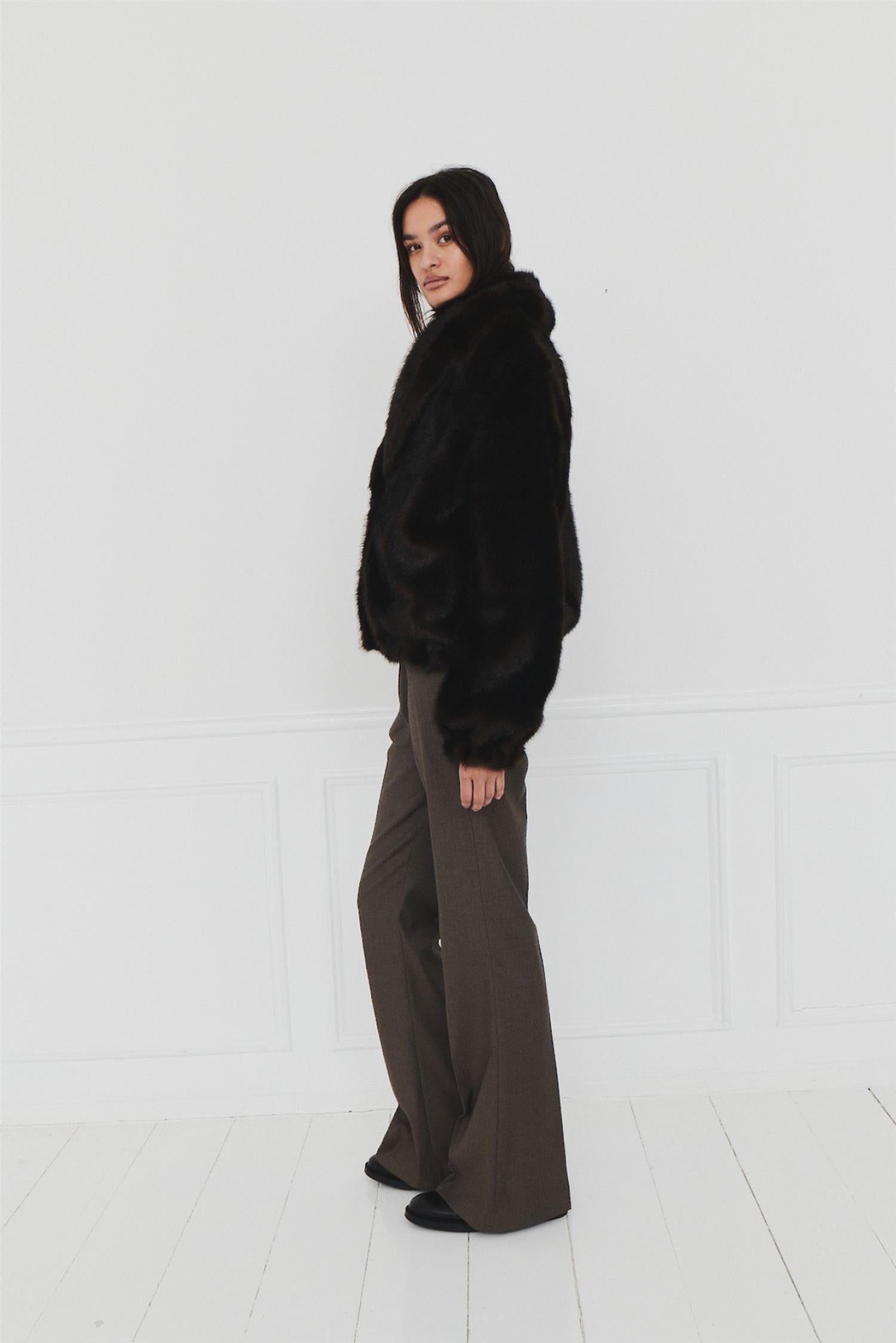 Dixie Coat Espresso fra The Garment. Dixie Coat er en vegansk pels i en varm brun nyanse, noe som gjør den til det perfekte valget for de kaldere månedene. Dens luksuriøse tekstur og koselige design tilbyr både stil og komfort, ideelt for å holde seg elegant og varm om vinteren. Jakken har en oversized passform med stor krage.