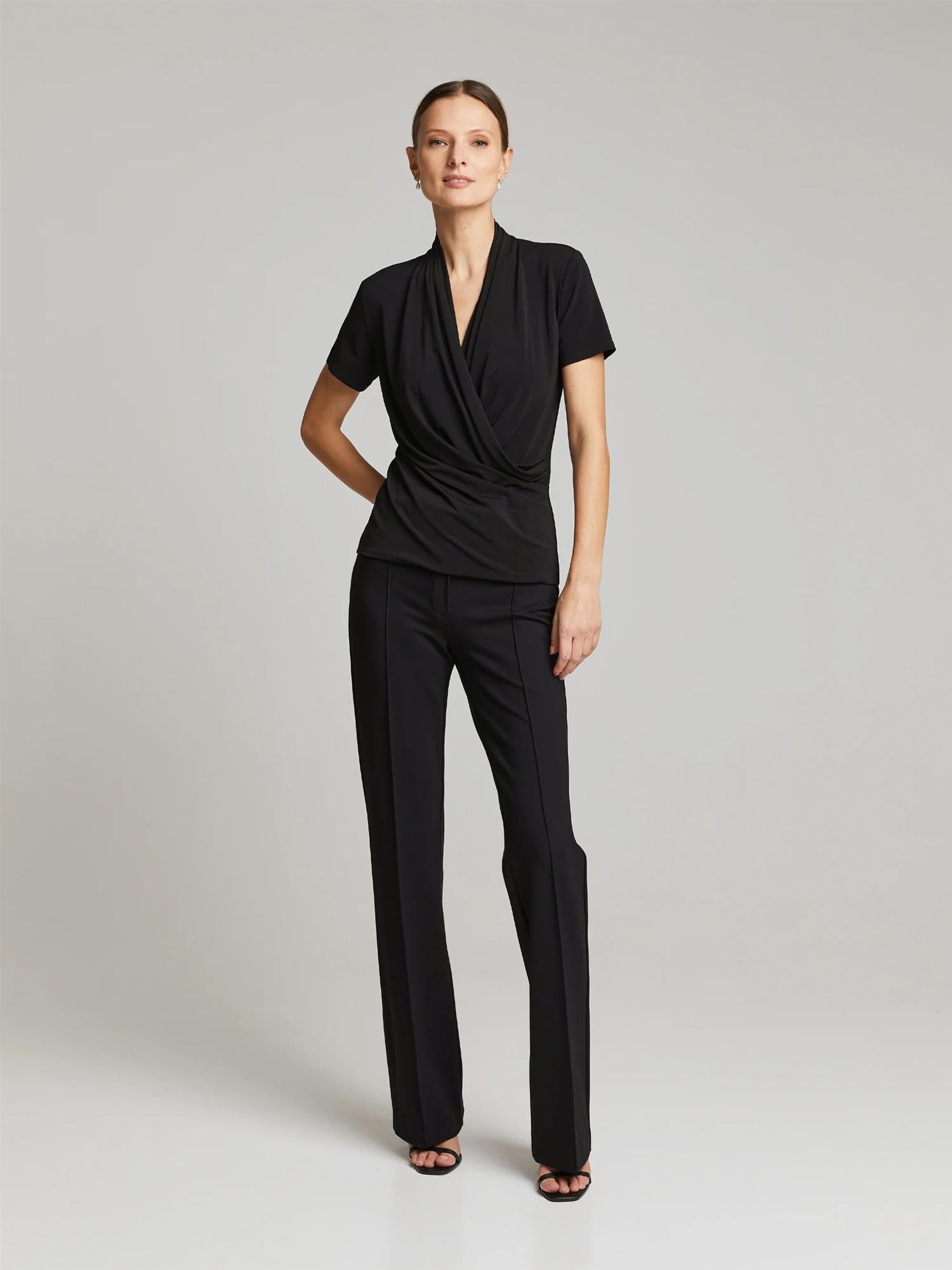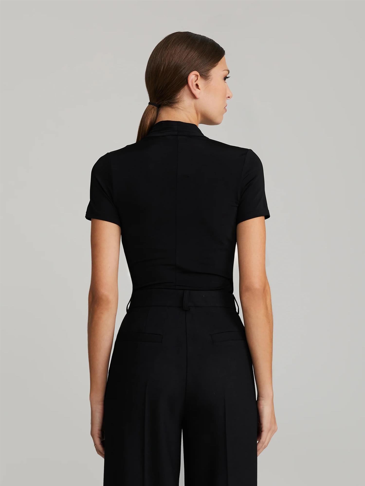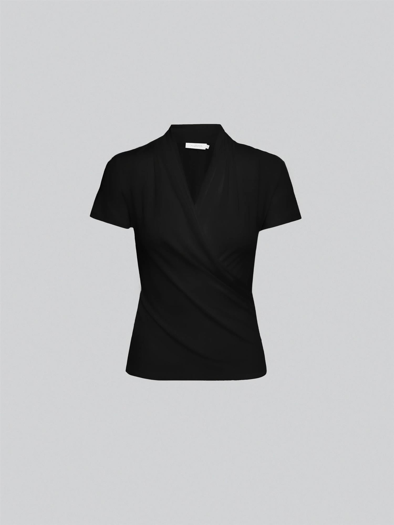 Fifi Top Black fra Andiata. En wrap-style topp med detaljer foran. Toppen har t-skjorteermer og har en smal passform. En topp til basegarderoben som kan styles opp og ned etter anledning.