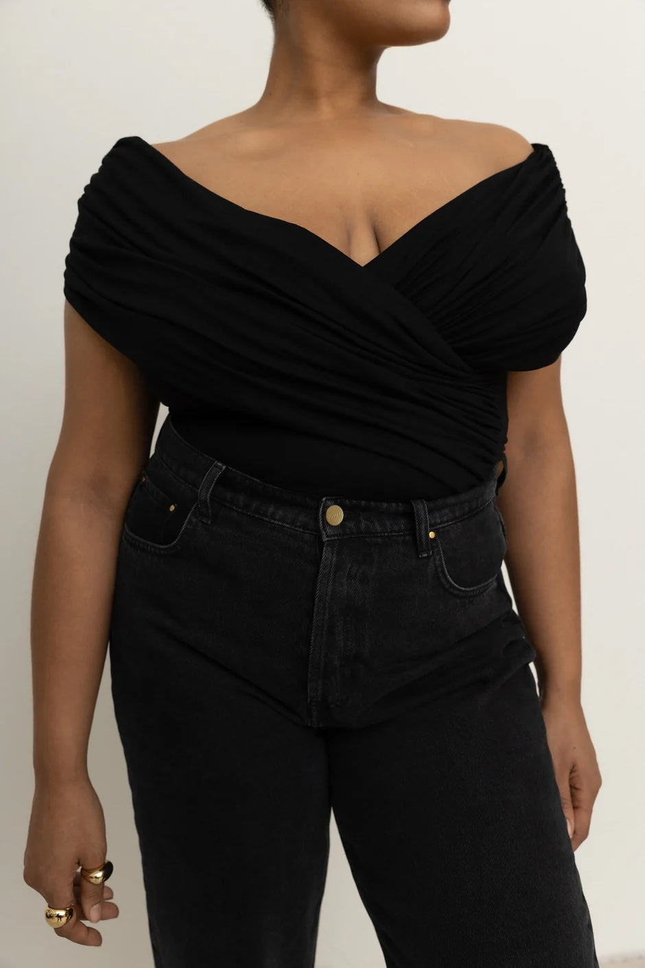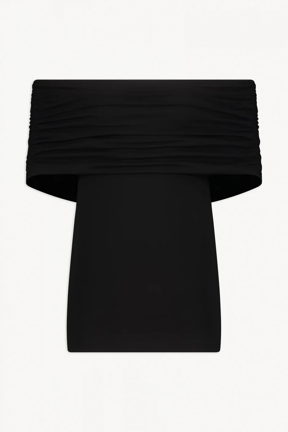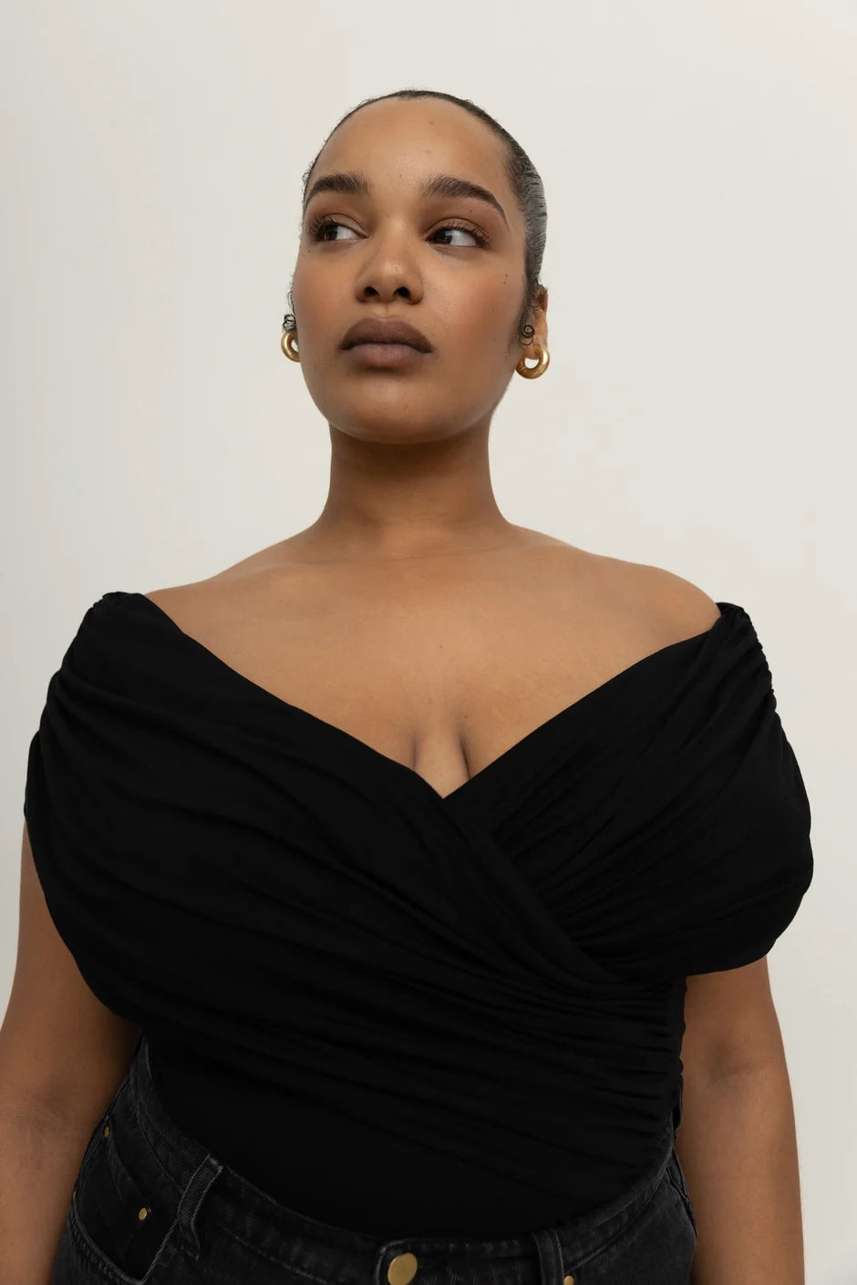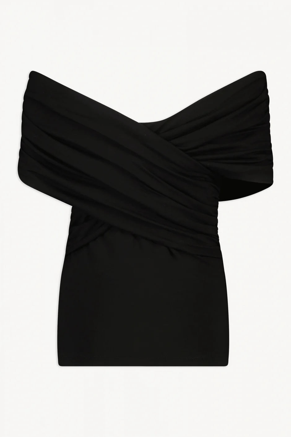 Giada Top Black fra Viveh. Giada har et rynket, off-the-skulder snitt som skaper et vakkert omslag over brystet, noe som gjør den til den perfekte kveldstoppen som også kan styles for dagen. Laget av deres signatur ECOVERO™ viskosejersey-stoff, den bæres stramt og klemmer kroppen elegant. Giadaen kan vendes og gir deg muligheten til to forskjellige utringninger. Kroppen er dobbeltfôret for ekstra støtte.