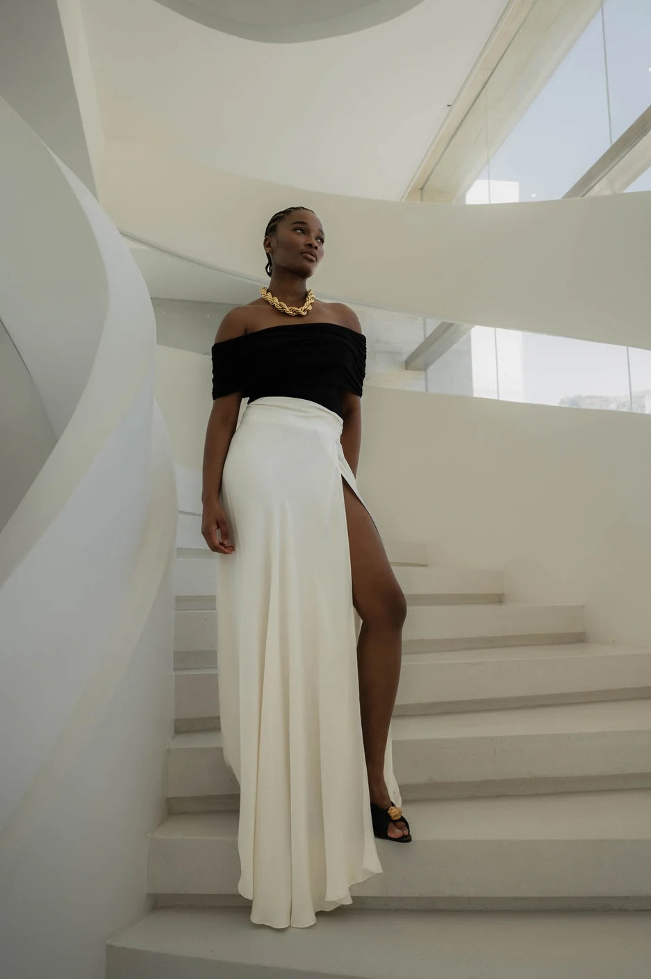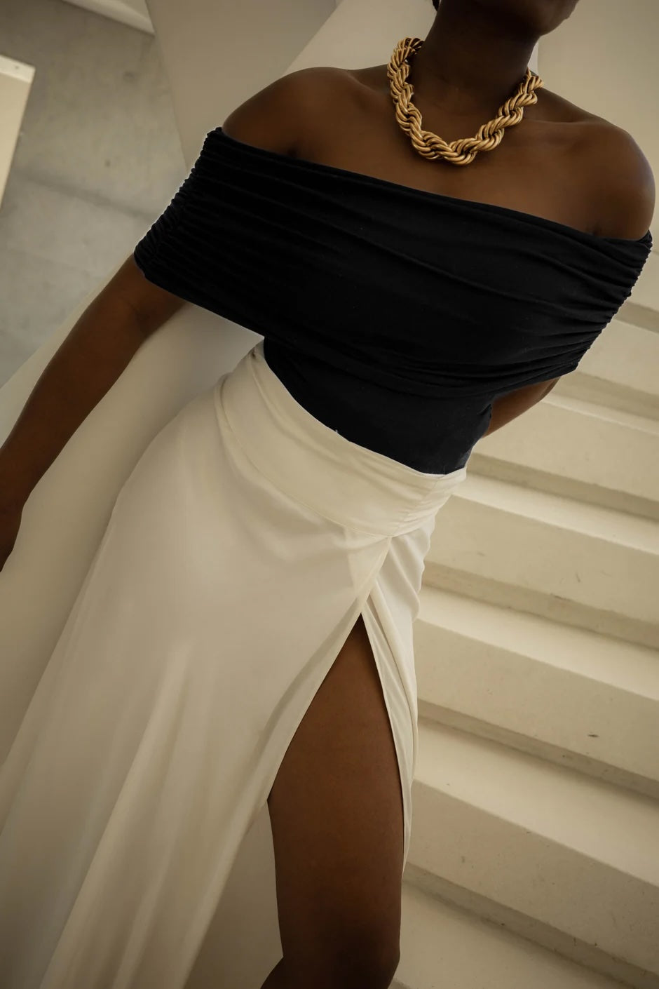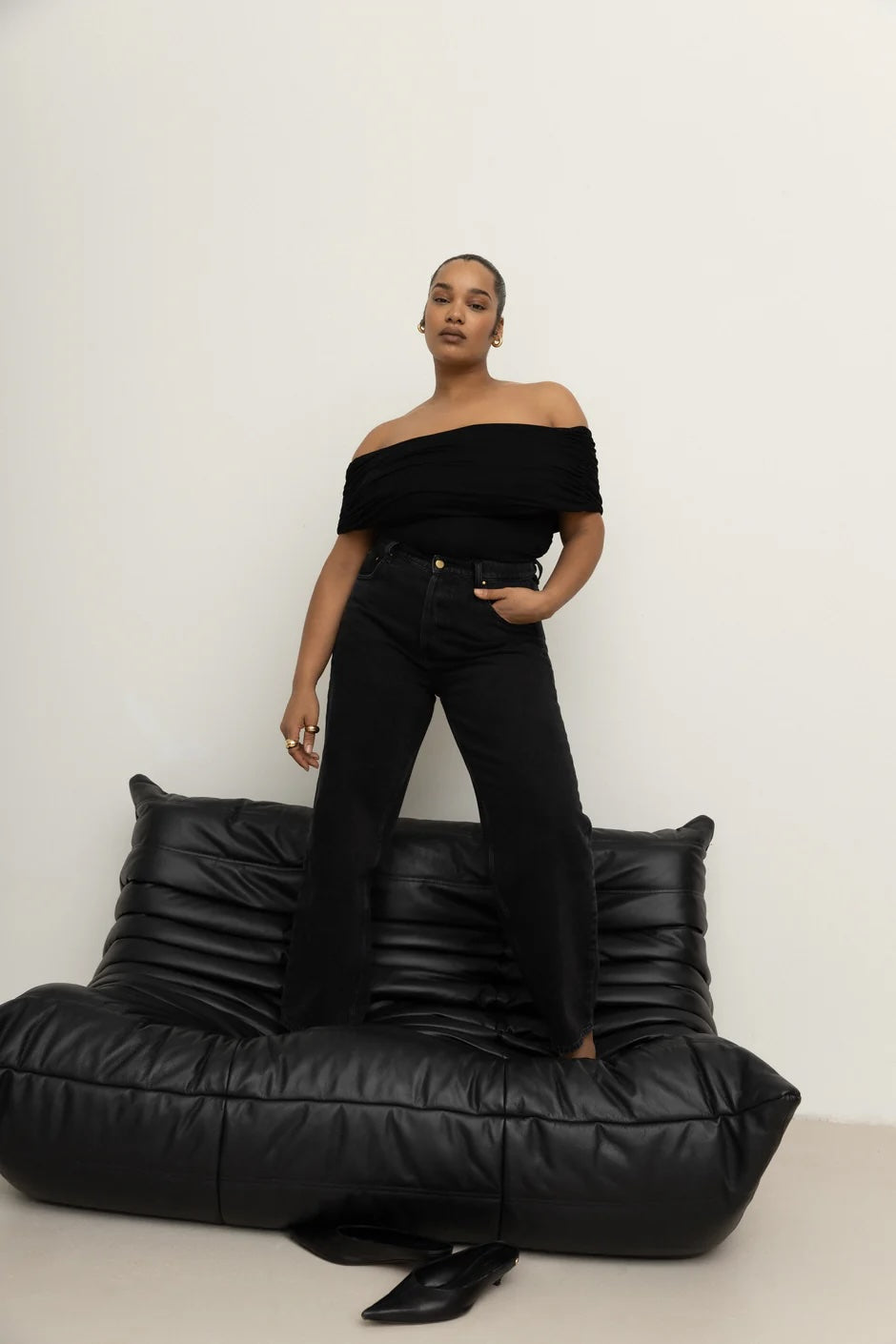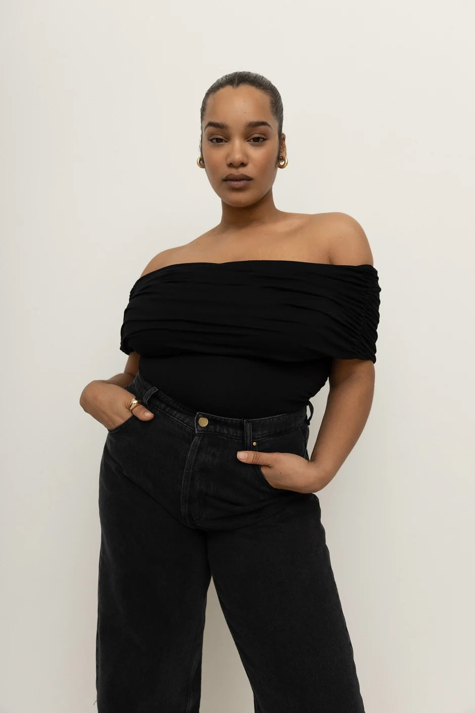 Giada Top Black fra Viveh. Giada har et rynket, off-the-skulder snitt som skaper et vakkert omslag over brystet, noe som gjør den til den perfekte kveldstoppen som også kan styles for dagen. Laget av deres signatur ECOVERO™ viskosejersey-stoff, den bæres stramt og klemmer kroppen elegant. Giadaen kan vendes og gir deg muligheten til to forskjellige utringninger. Kroppen er dobbeltfôret for ekstra støtte.