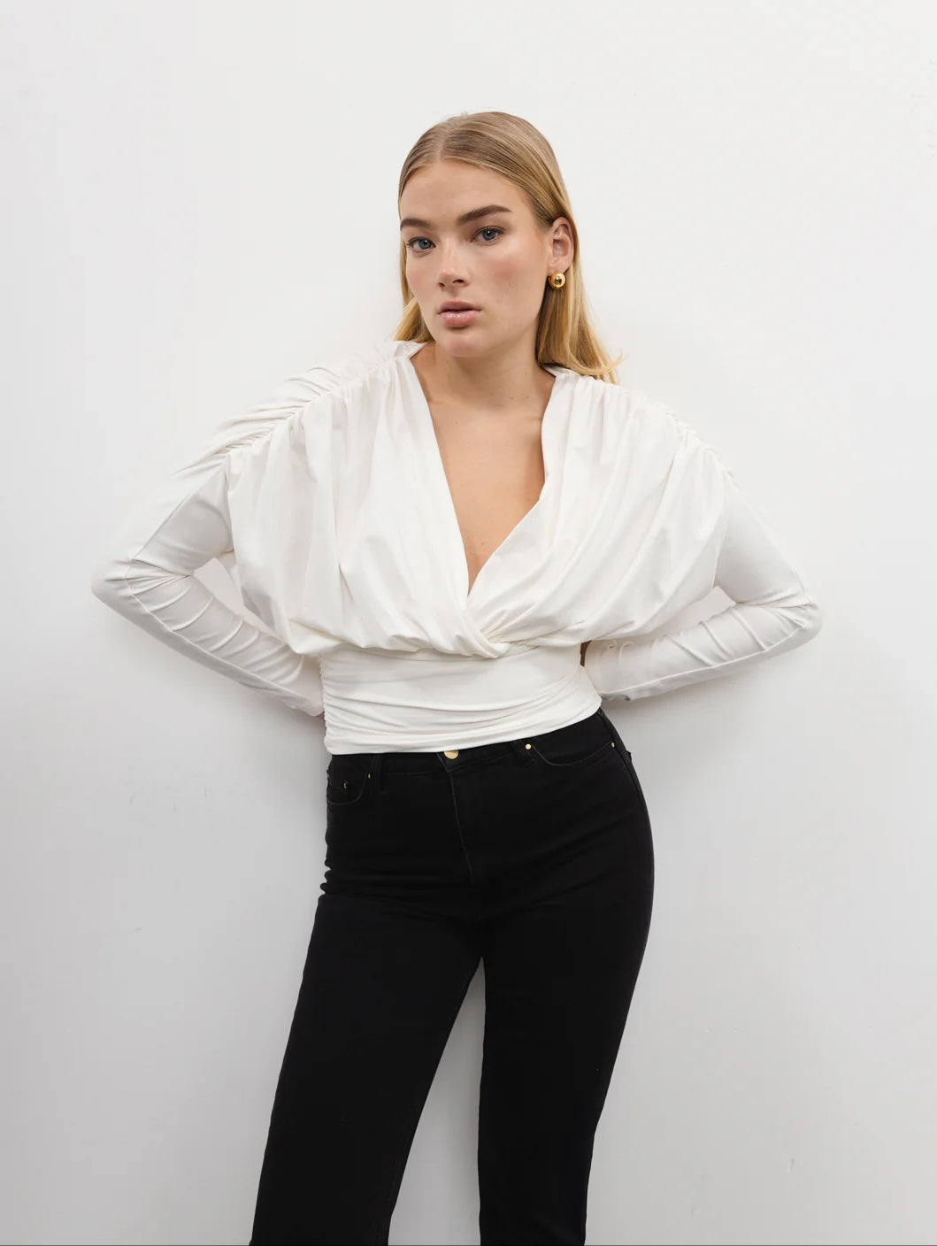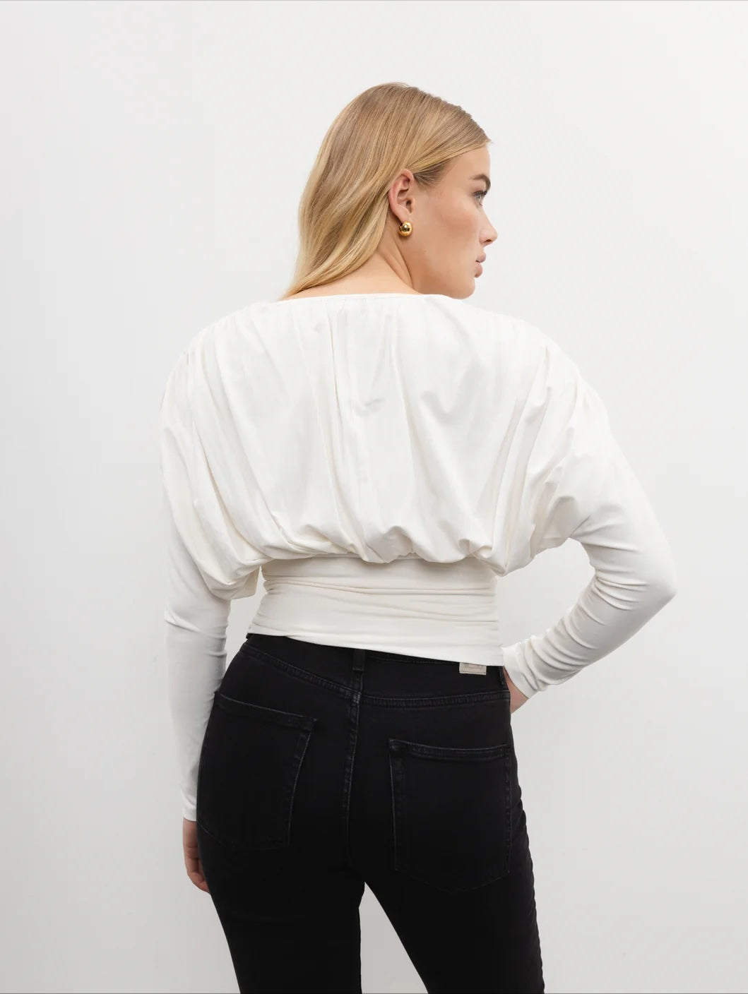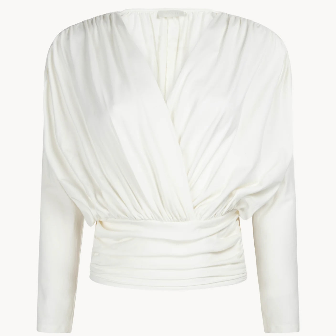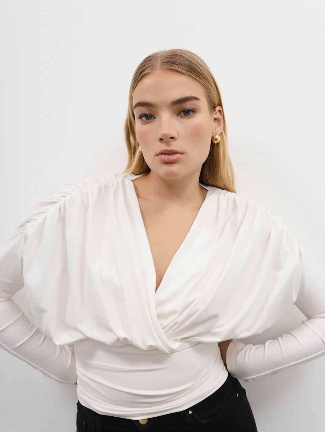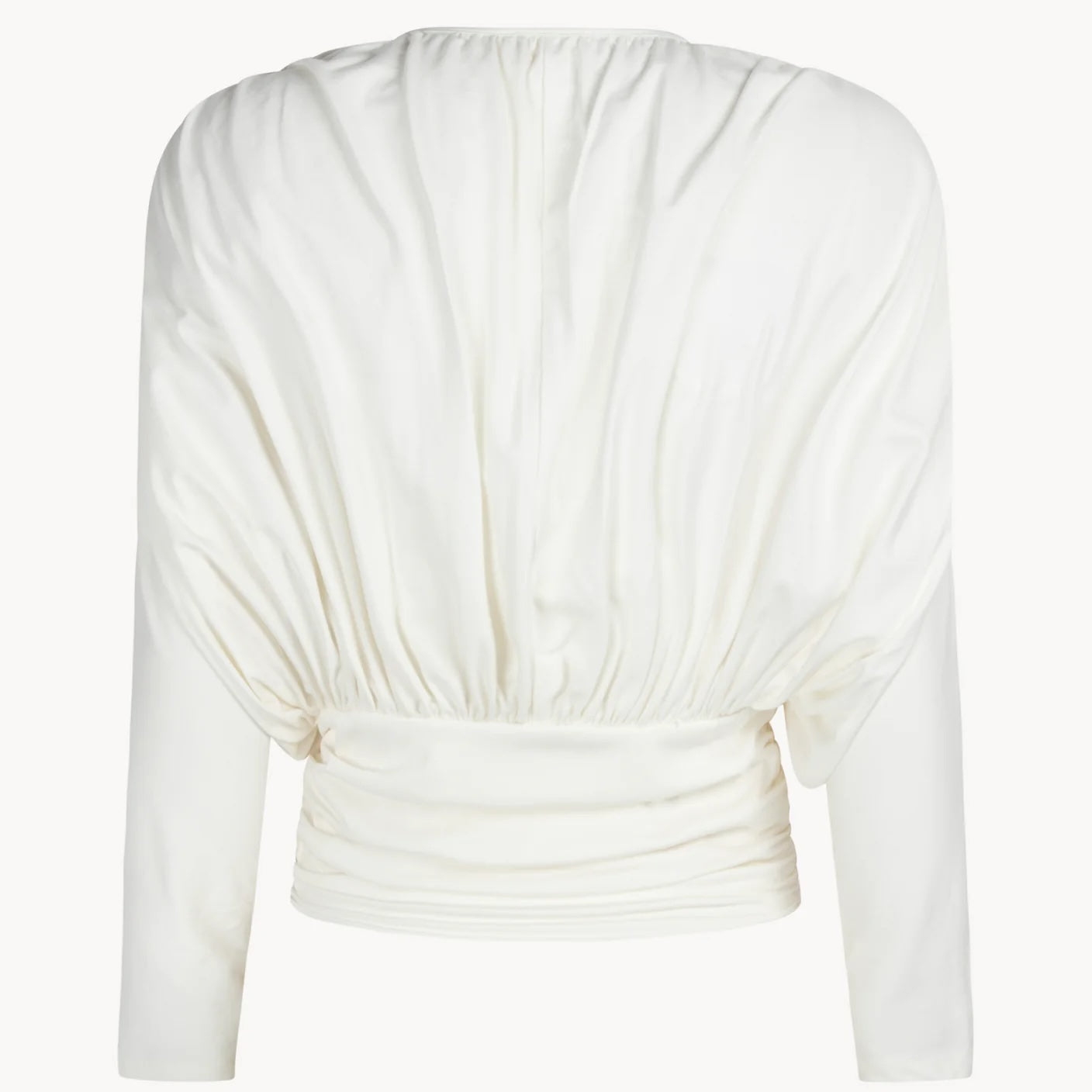 Salvia Top Coconut Milk fra Viveh. Salvia-toppen er laget med VIVEH-signaturstoffet, en ECOVERO™ viskosejersey som drapererer vakkert og sitter tett rundt kroppen. Smykket er langermet med løs passform på skuldrene og tettsittende midje. Salvia er allsidig ettersom den kan brukes på to måter, med en moderne, elegant høy utringning eller en V-hals for en mer klassisk, glamorøs look.