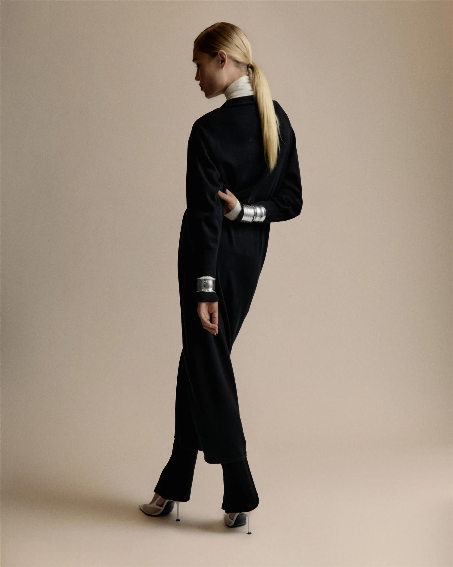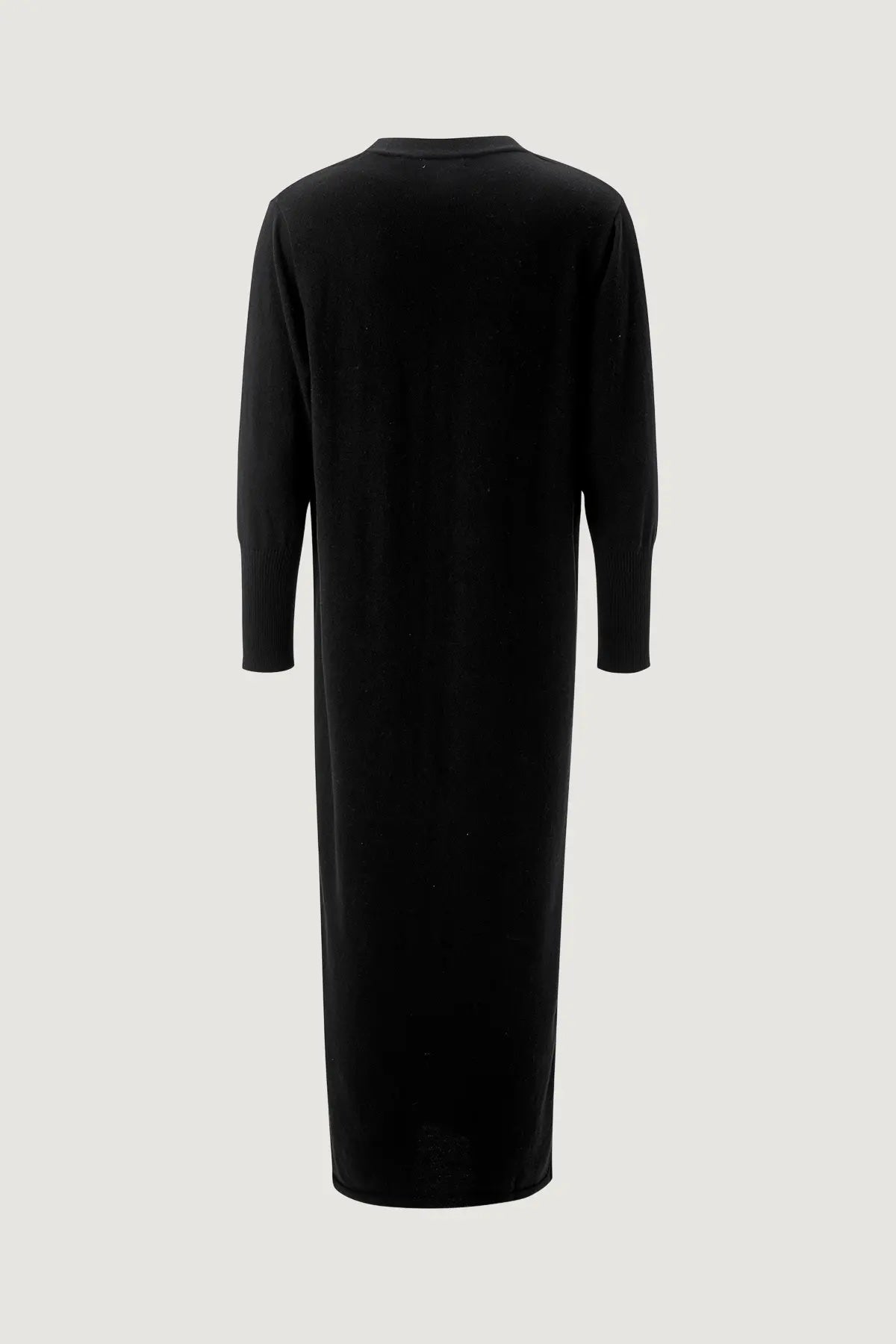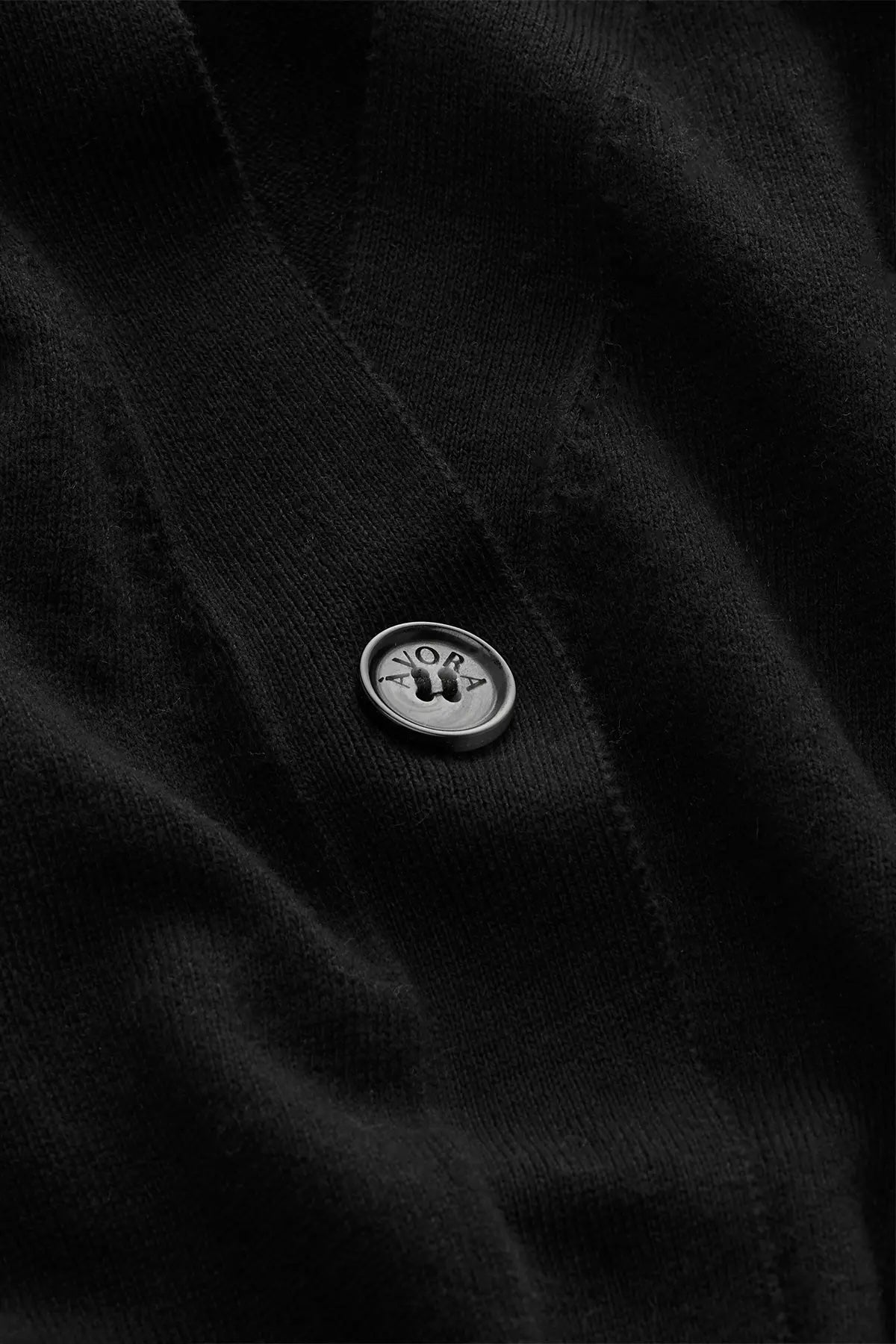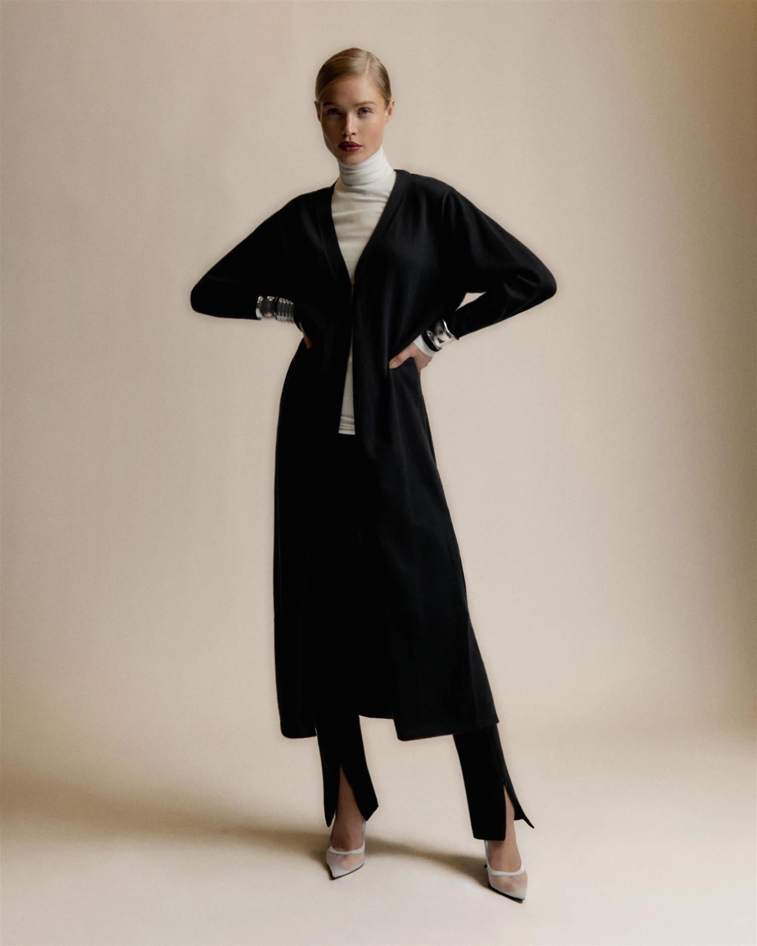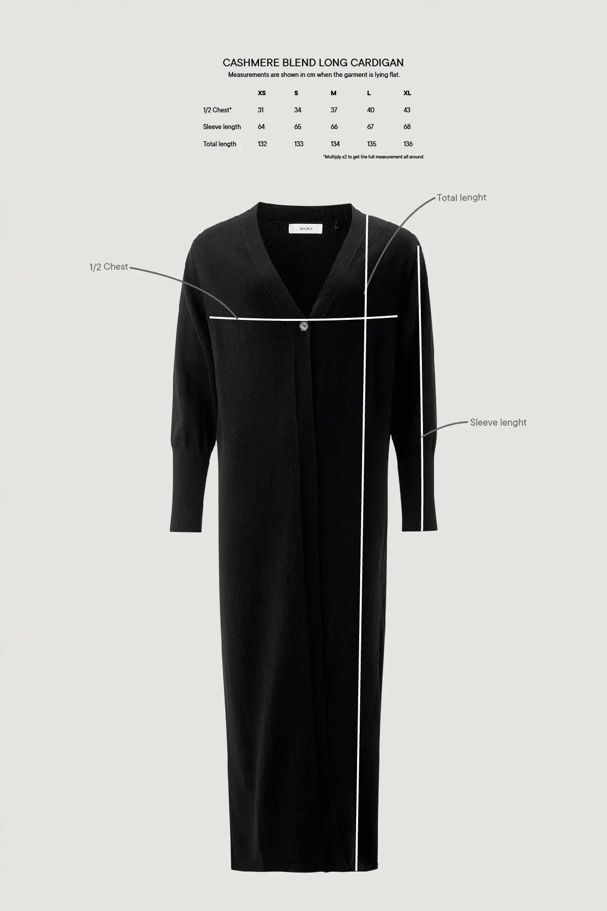 The Cahmere Blend Long Cardigan fra Avora. En behagelig cardigan i bomull, cashmereblanding. Den har en løs passform med én logoknapp på brystet. Den har en lang lengde med v-hals. Perfekt å slenge over antrekket på kjølige dager.