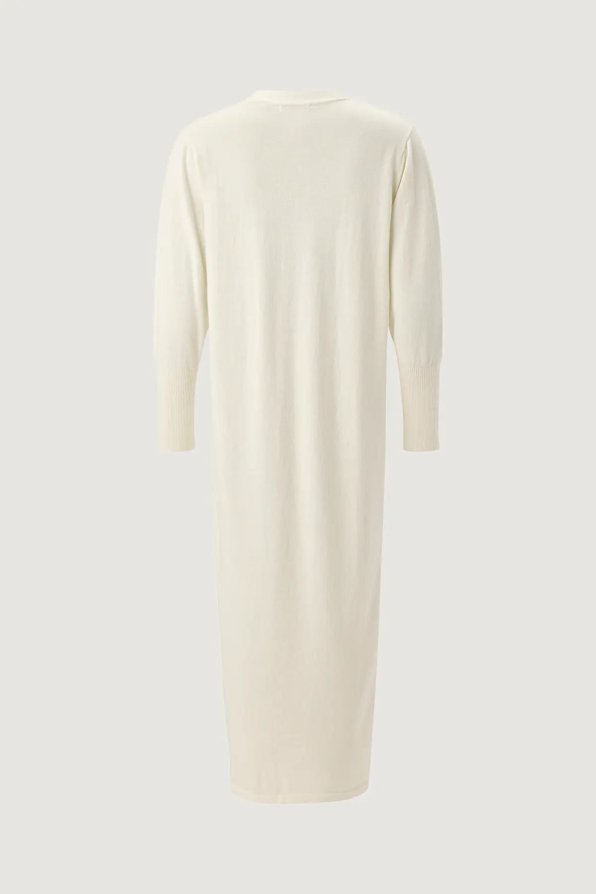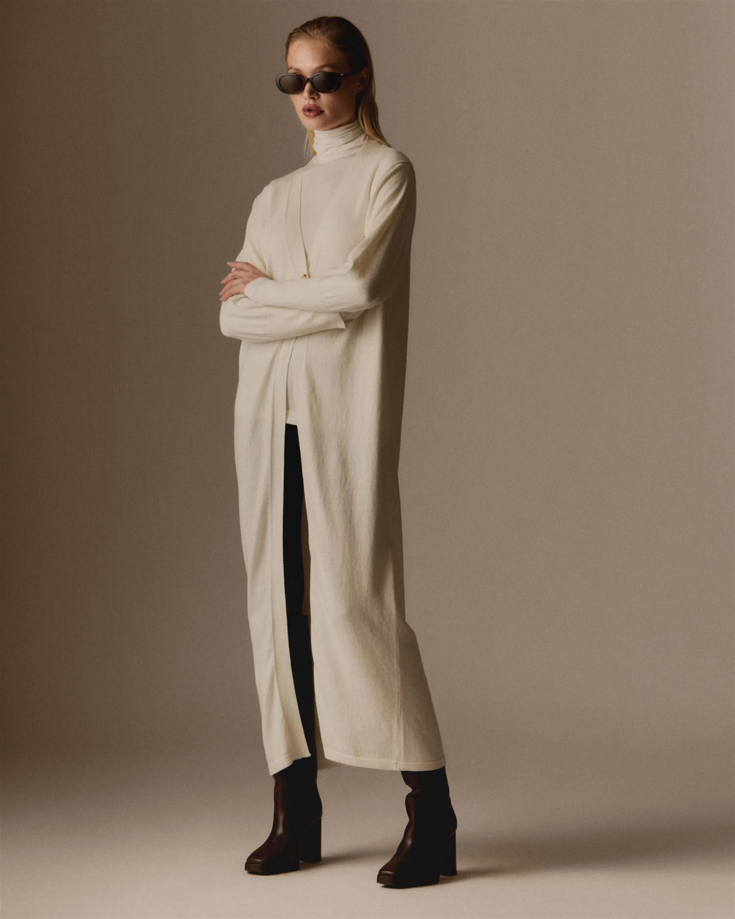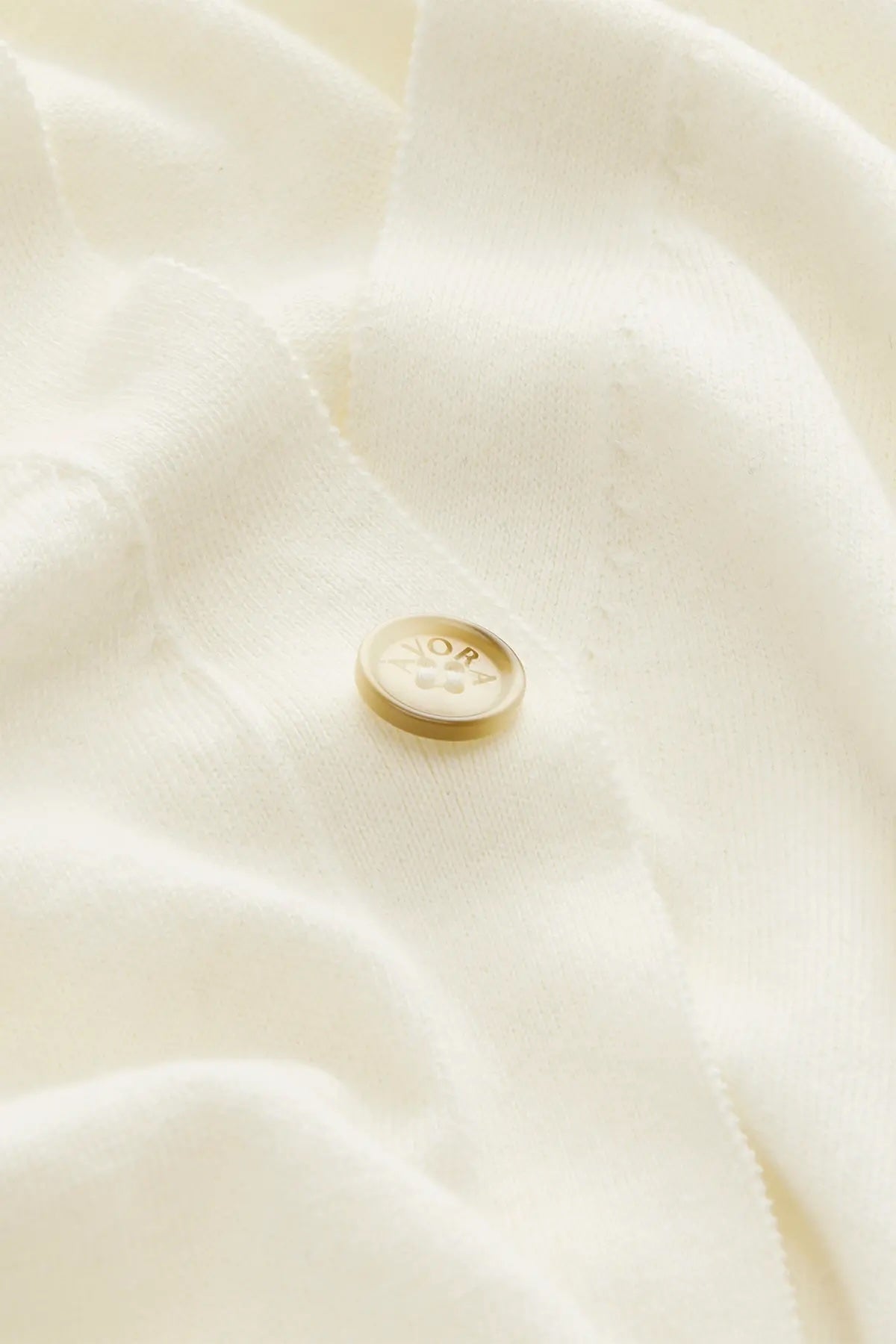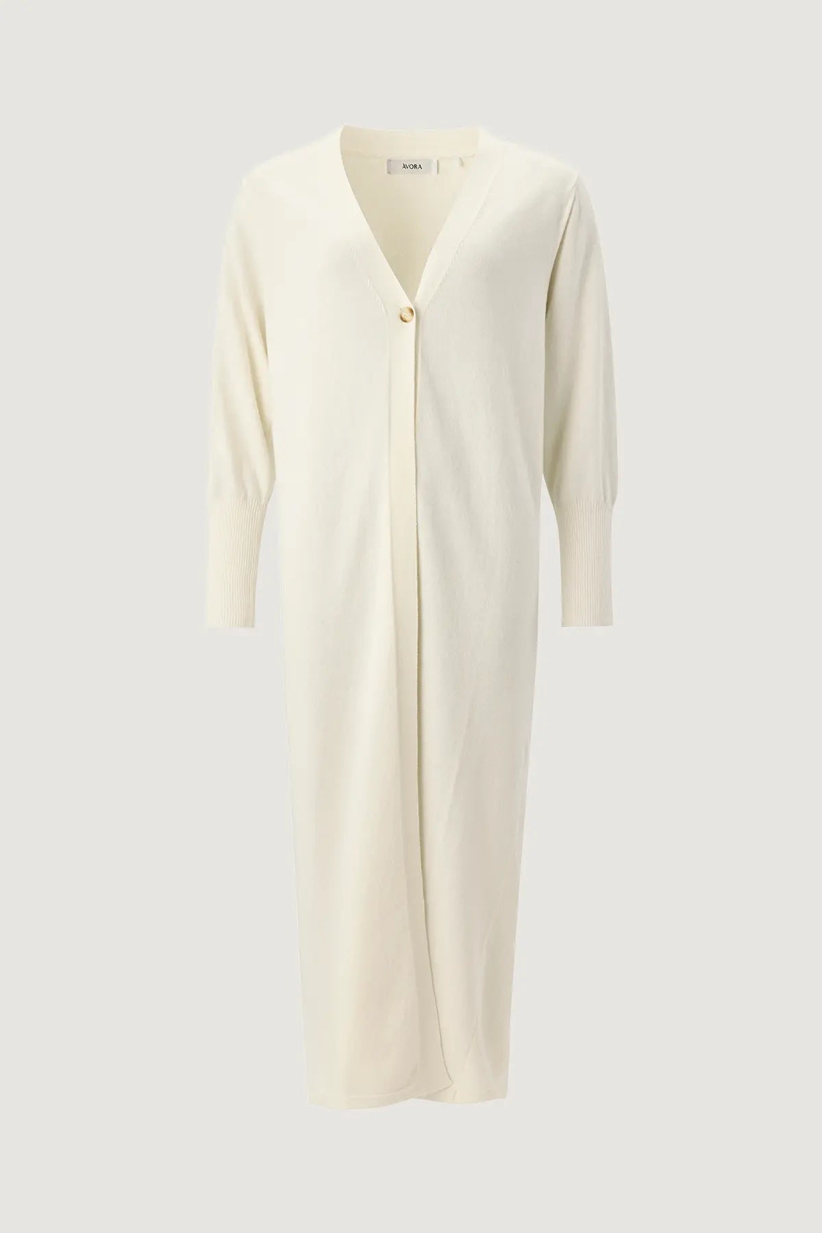 The Cahmere Blend Long Cardigan fra Avora. En behagelig cardigan i bomull, cashmereblanding. Den har en løs passform med én logoknapp på brystet. Den har en lang lengde med v-hals. Perfekt å slenge over antrekket på kjølige dager.