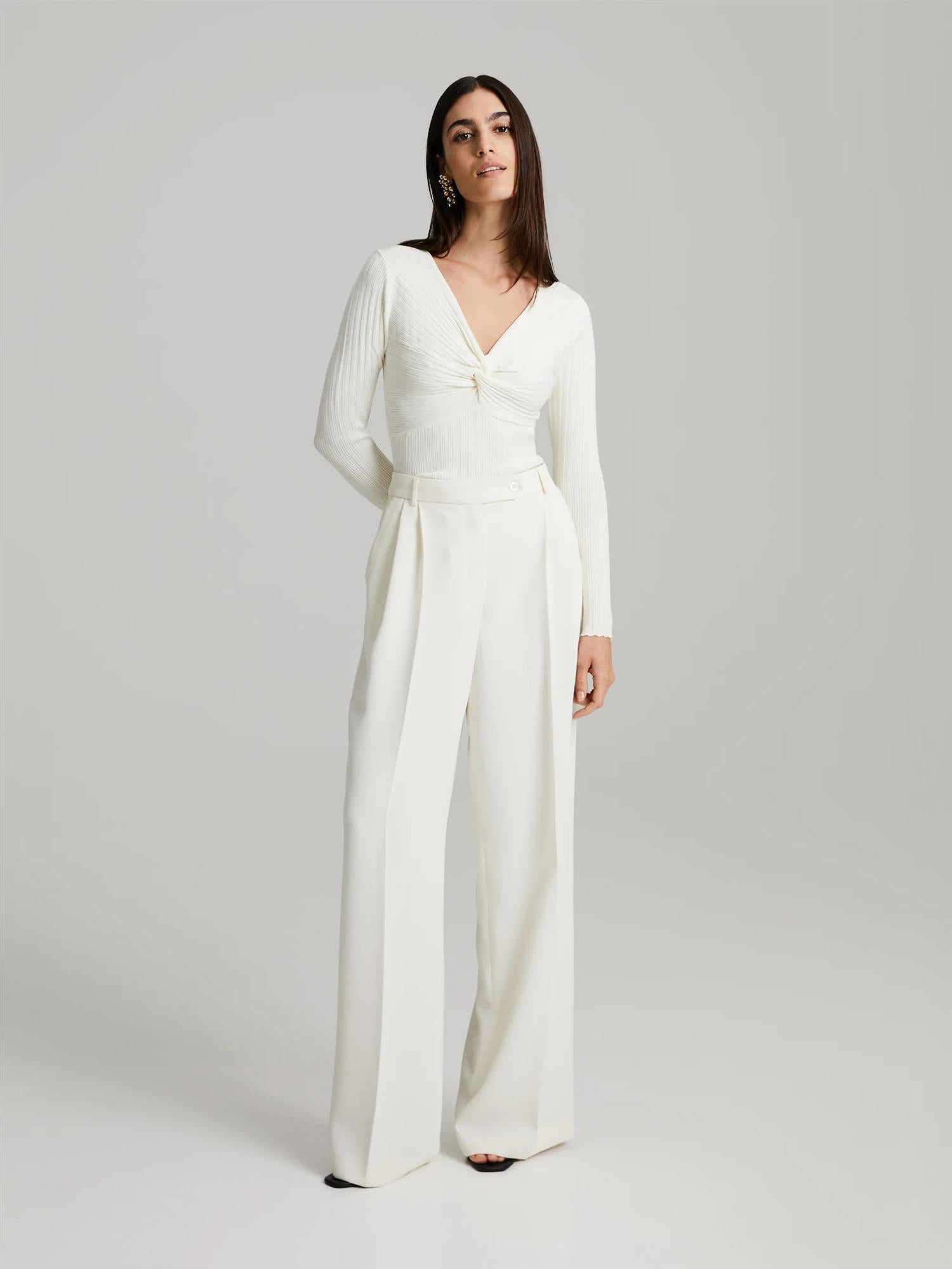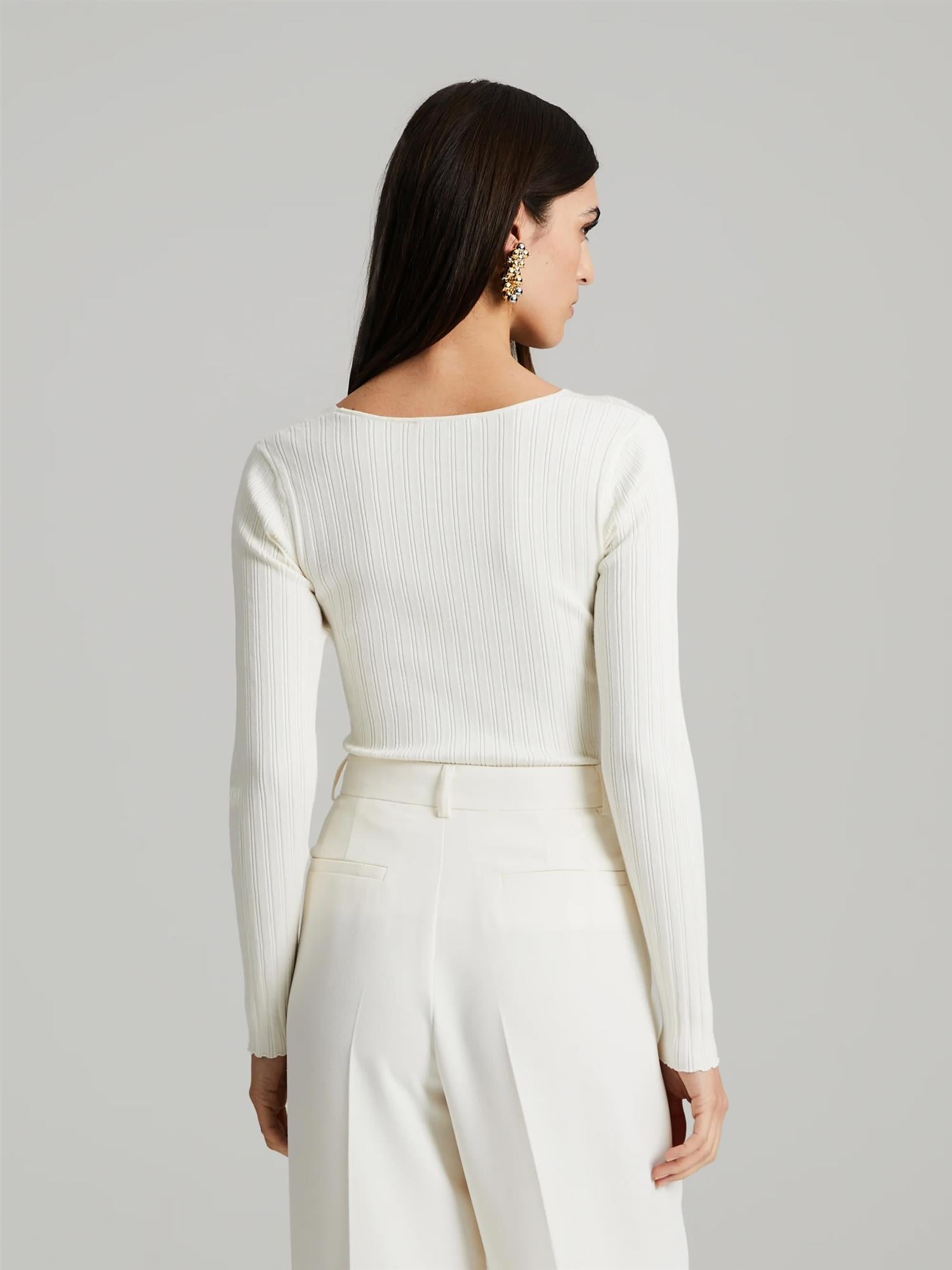 Polly Knit White fra Andiata. En ribbestrikket topp med kroppsnær passform. Den har v-hals med en knyting foran som gir en nydelig fasong på genseren. Den har lange ermer og søm under bysten. En genser med det lille ekstra som kan pyntes både opp og ned.