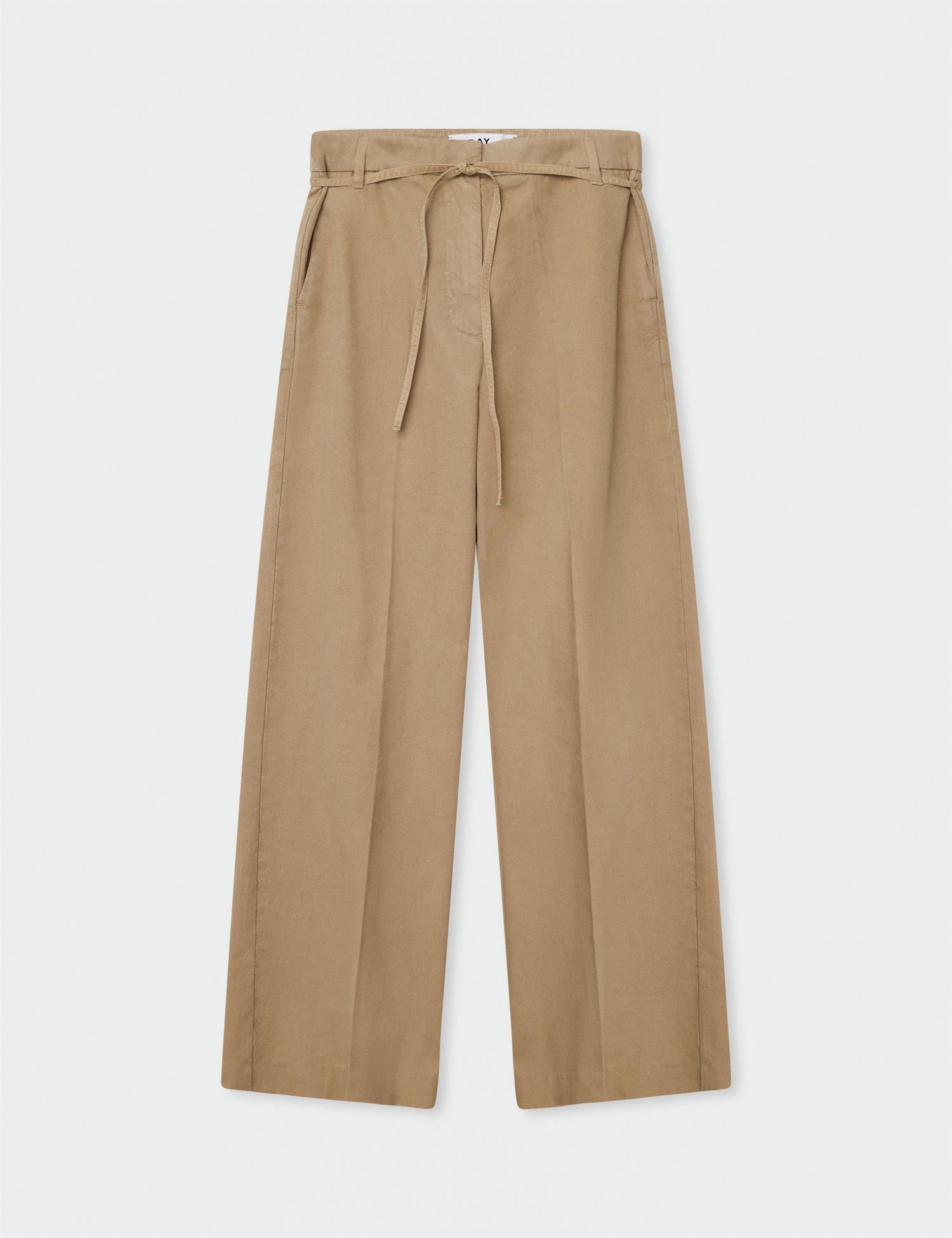 Jade - Modern Canvas Tree House fra DAY. Disse buksene har lavt liv med vide ben. Den har to sidelommer og en baklomme, en glidelåsgylf med kroklukking og et avtagbart knytebelte i midjen. Buksen har en løs passform.