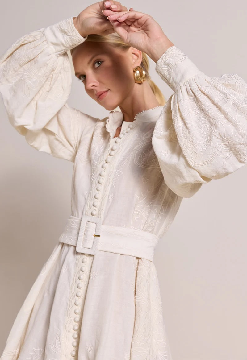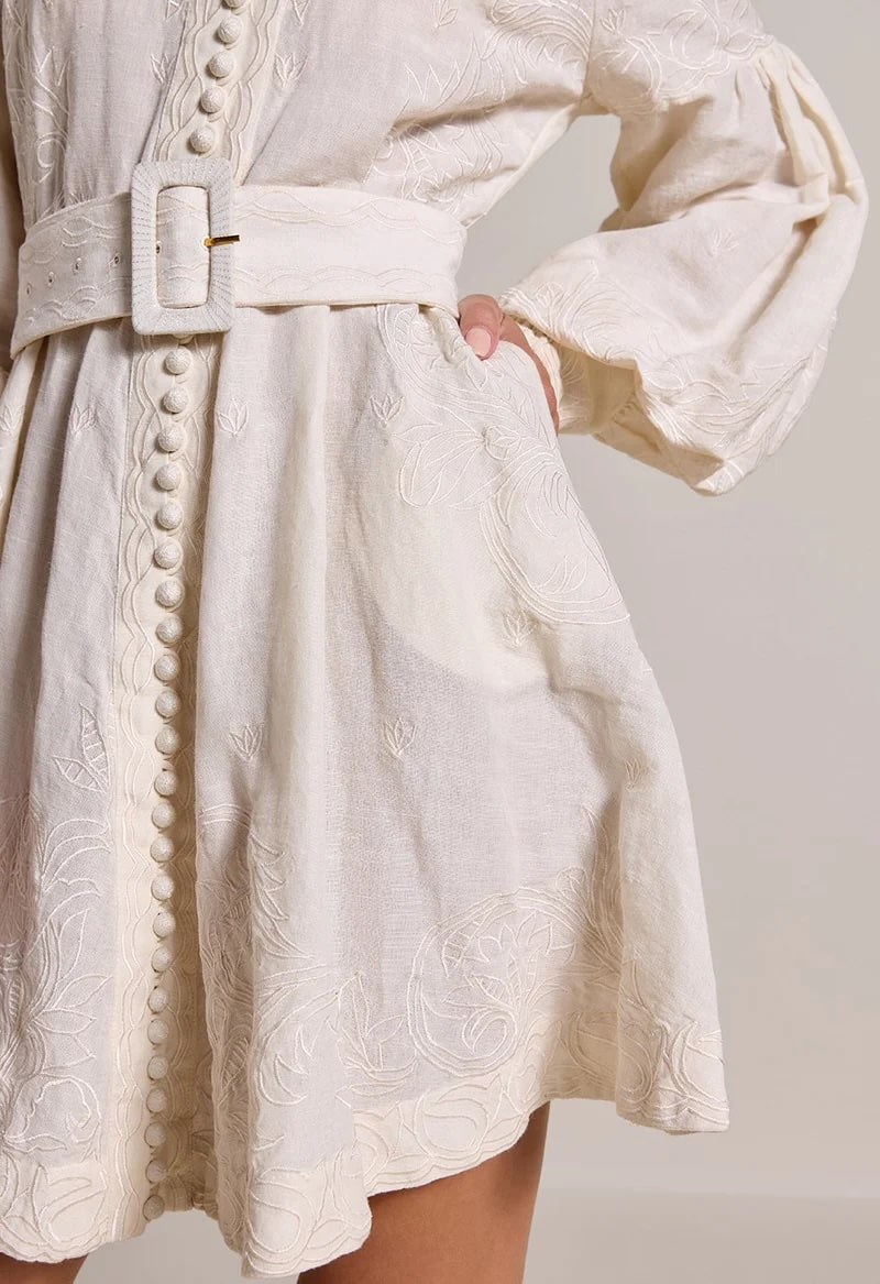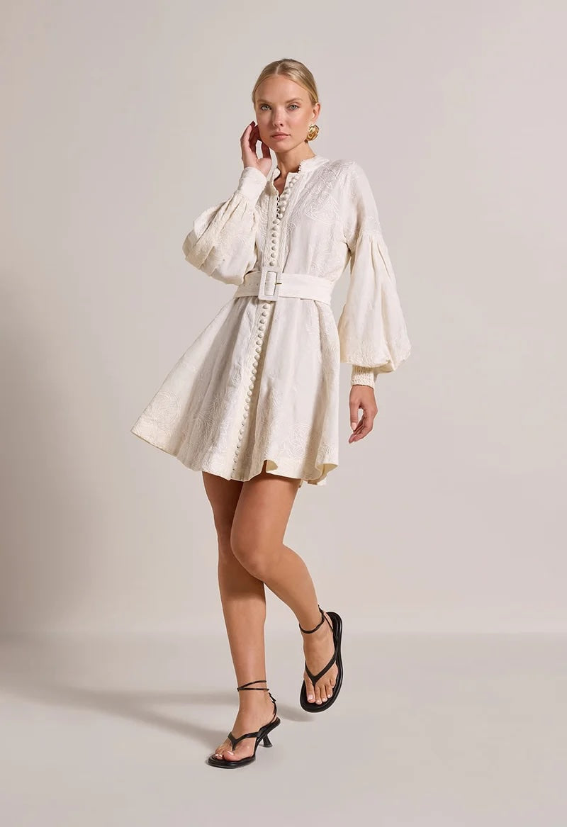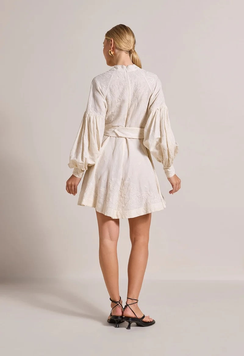 Berite Short Dress Antique White fra Scarlett Poppies. Kjolen har utsøkt plasseringsbroderi. Denne utsvingte kjolen har en figursydd passform, voluminøse raglanermer i full lengde med elastiske ender og en sjenerøs skjørtsvep. Den lukkes med glidelås i siden for enkelhets skyld.