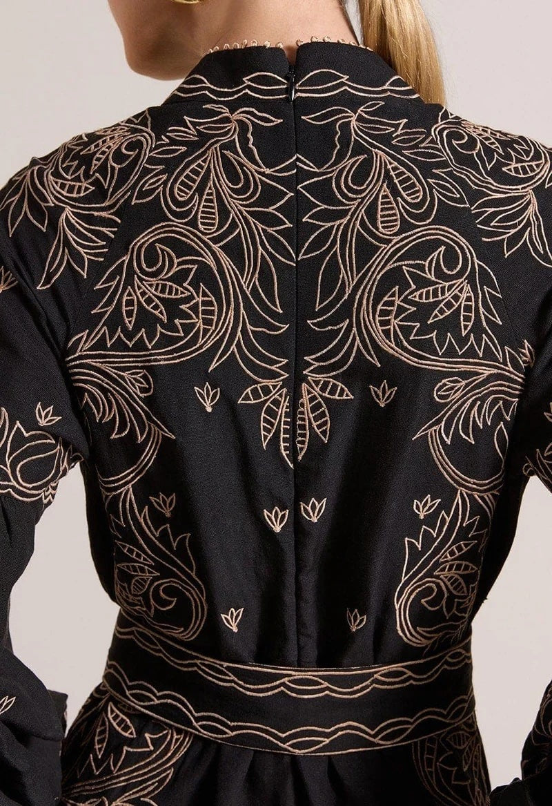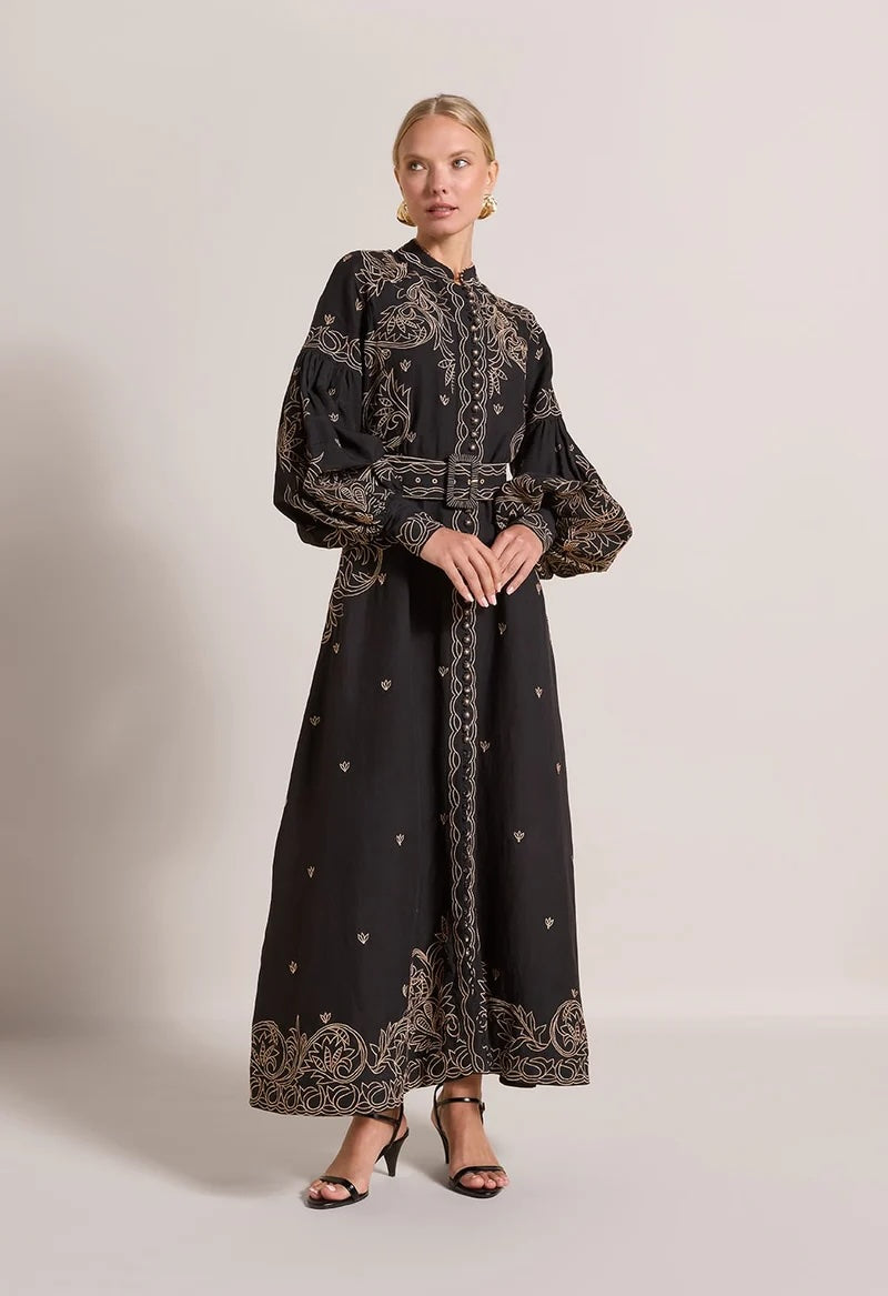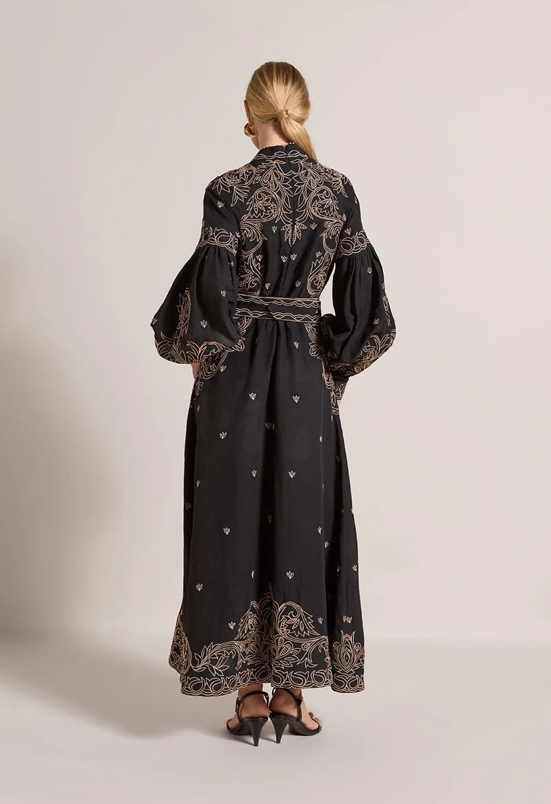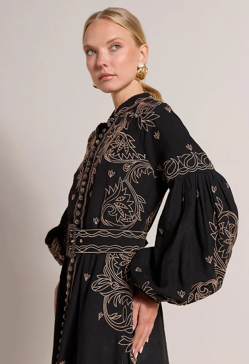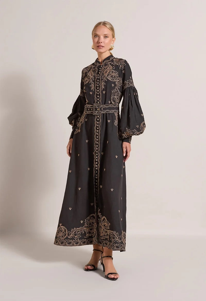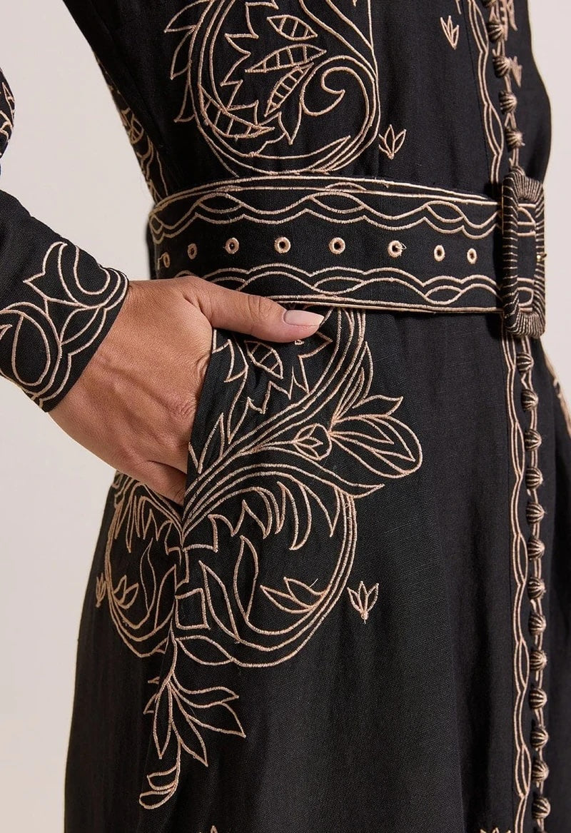 Beyonce Long Dress Onyx Black fra Scarlett Poppies. Kjolen er laget av vår elskede lin-viskoseblanding og har broderikunst.
