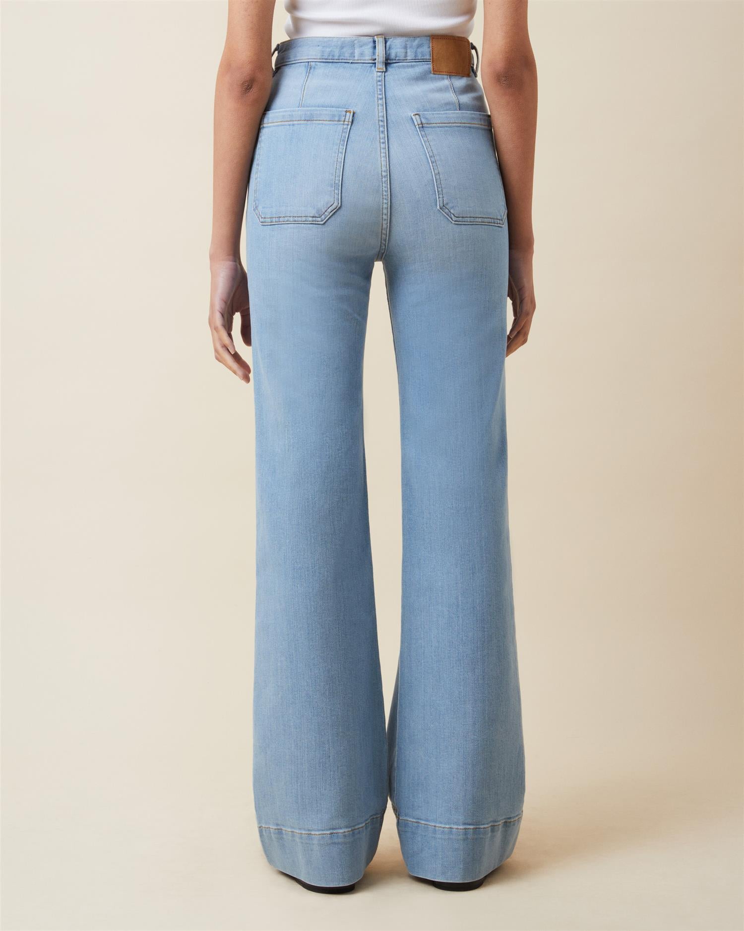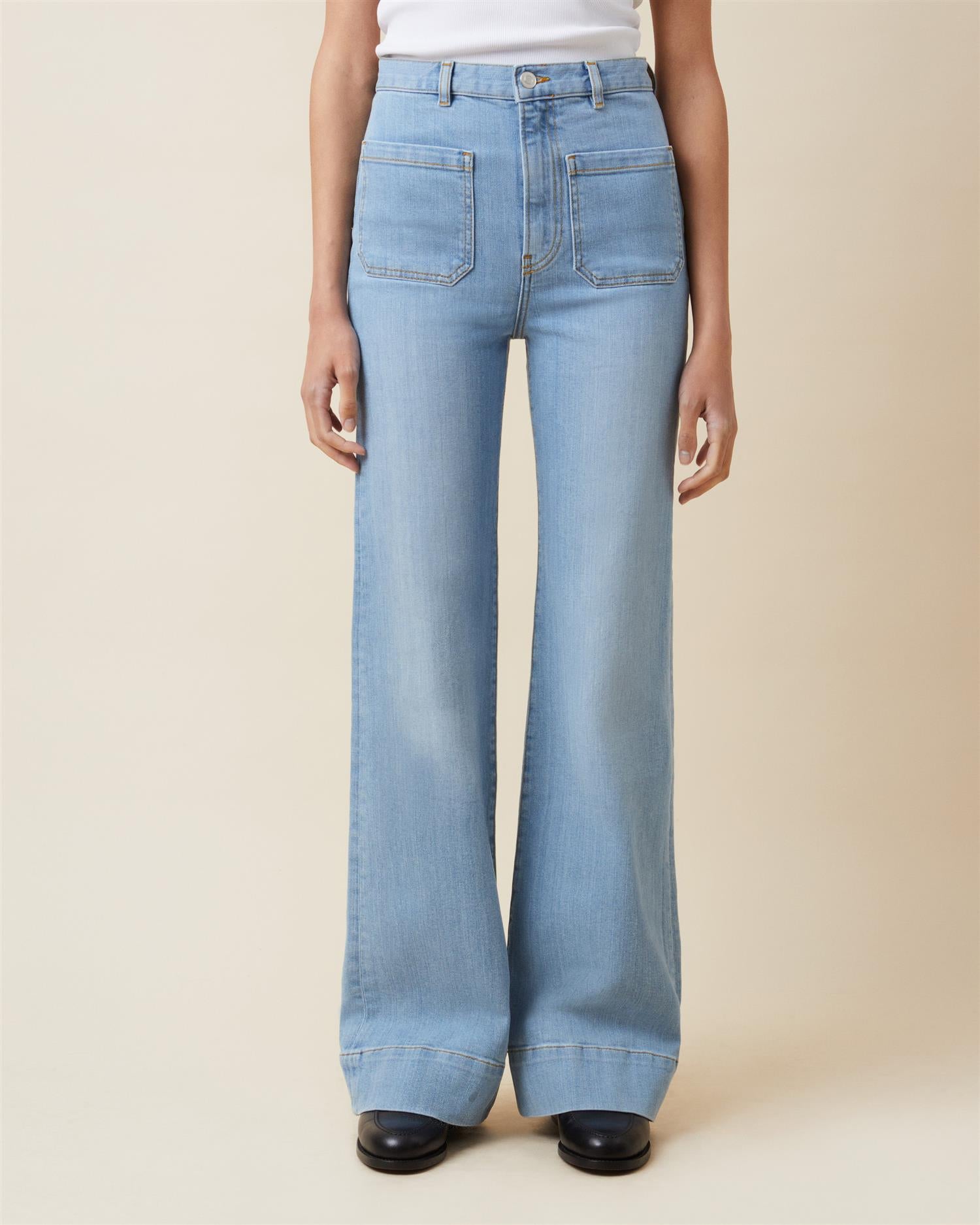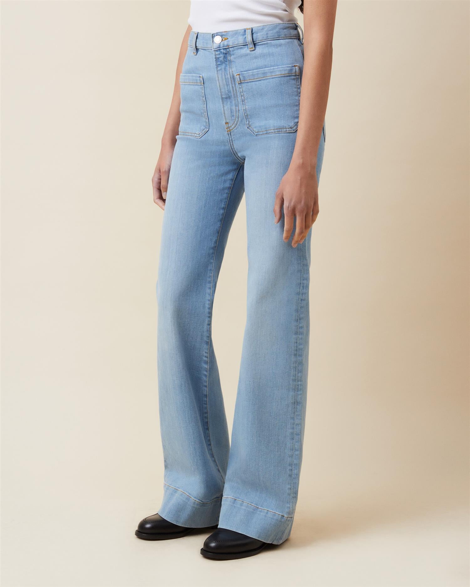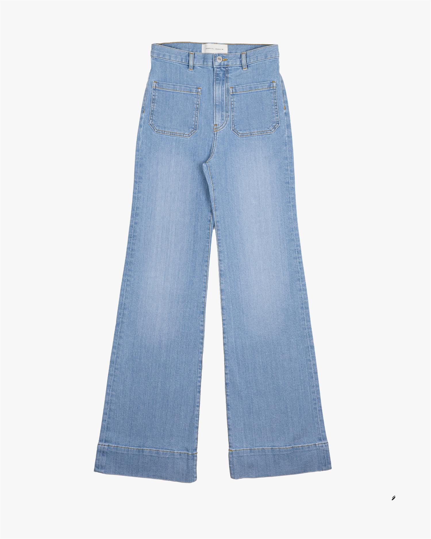 St Monica Jeans Azurina Blue fra Jeanerica. Jeansen er inspirert fra sjømannsarkiver fra slutten av 1960-tallet med sine lappede lommer, flare og brede kantlinjer.