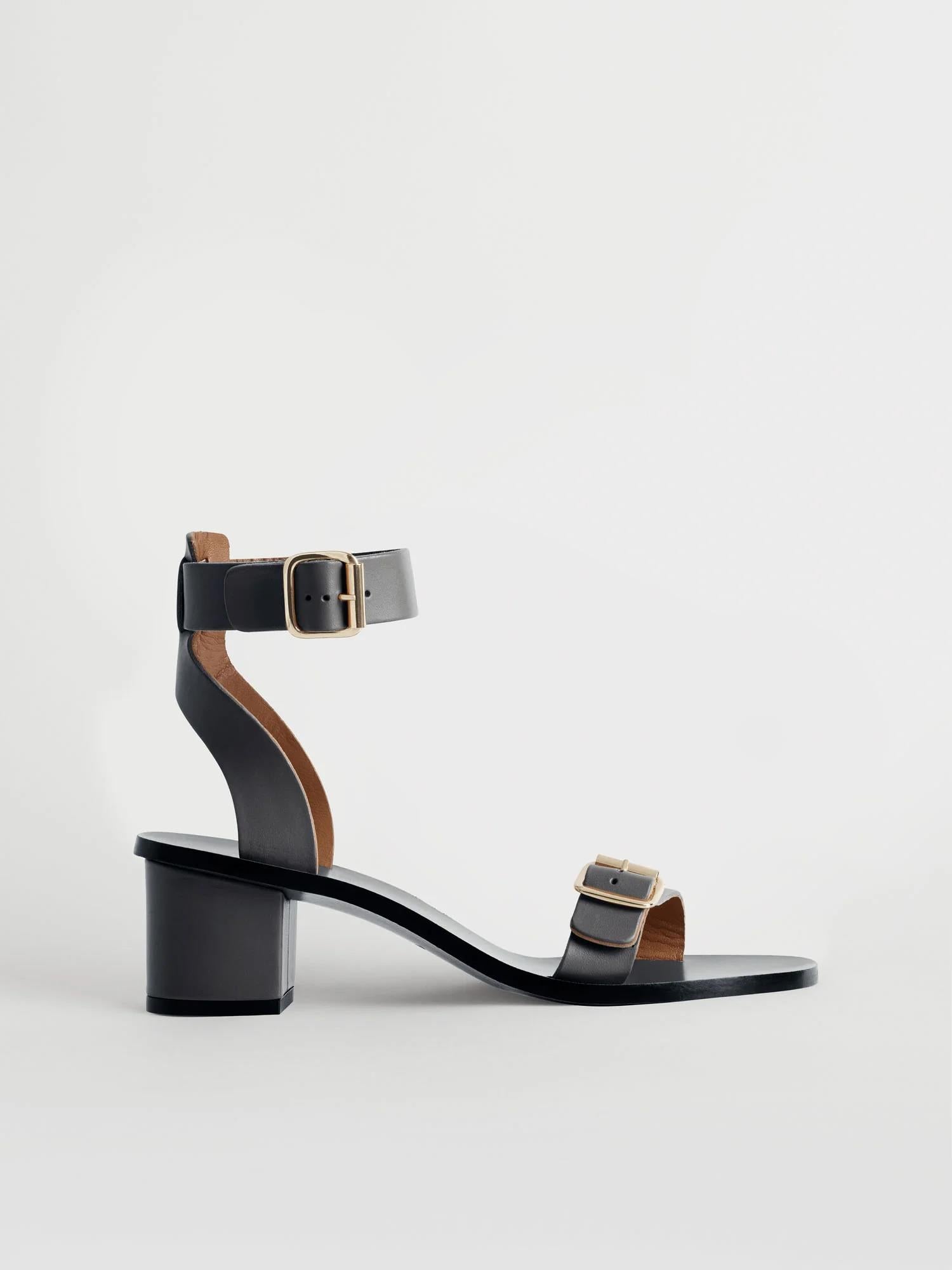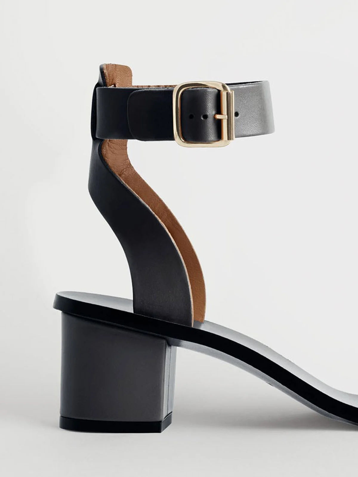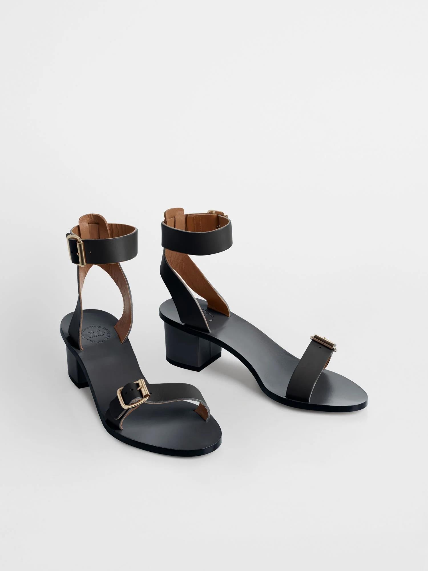 Carmen Black Leather Ankle Strap Heels fra Atp Atelier. Carmen er en sandal med blokkhæl, en klassisk sko som aldri går av moten. De gir høyde til antrekket ditt uten å gå på akkord med komforten. Sandalen har åpen hel med ankelrem, festet med en gullfarget nikkelfri spenne.