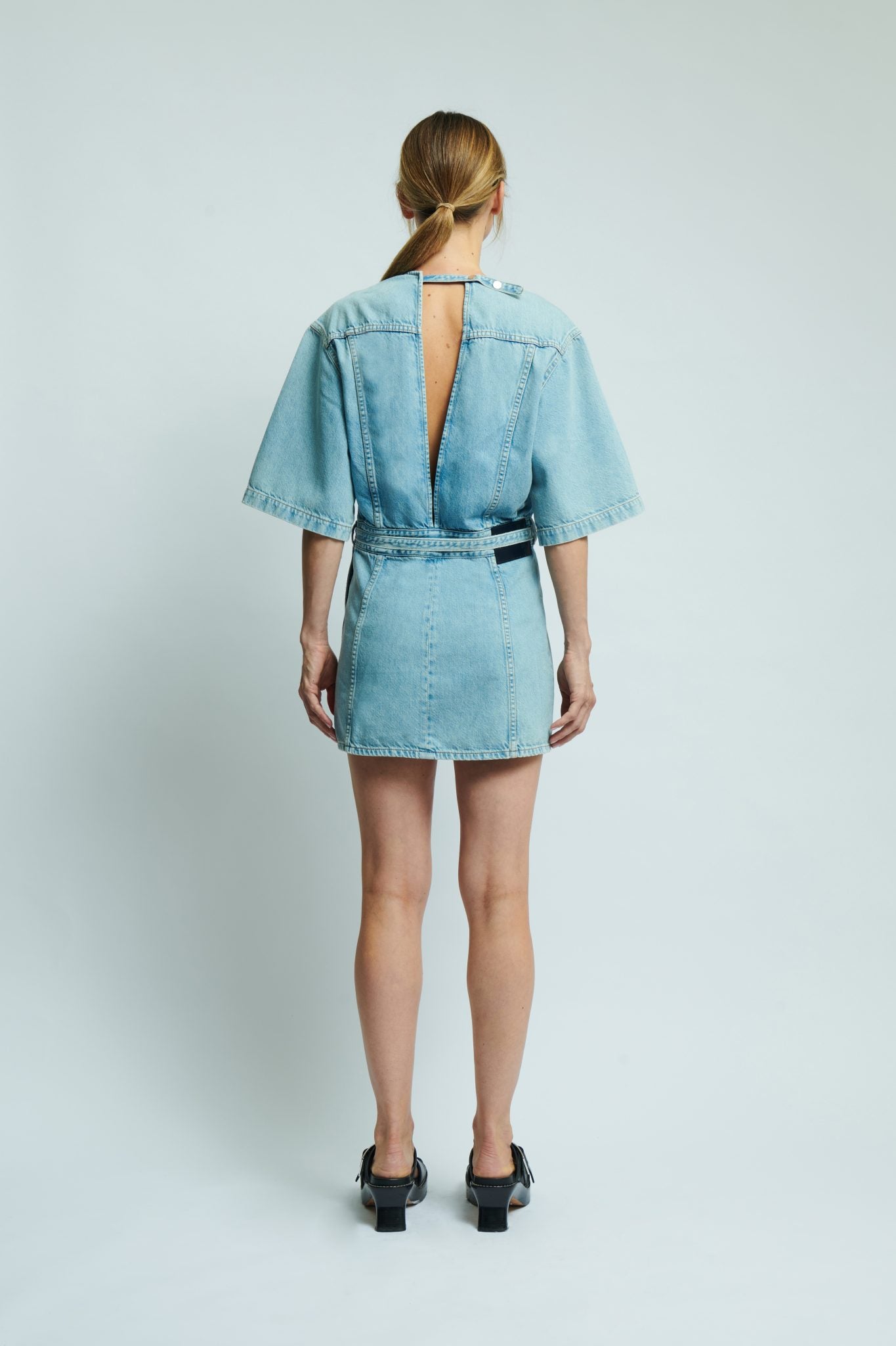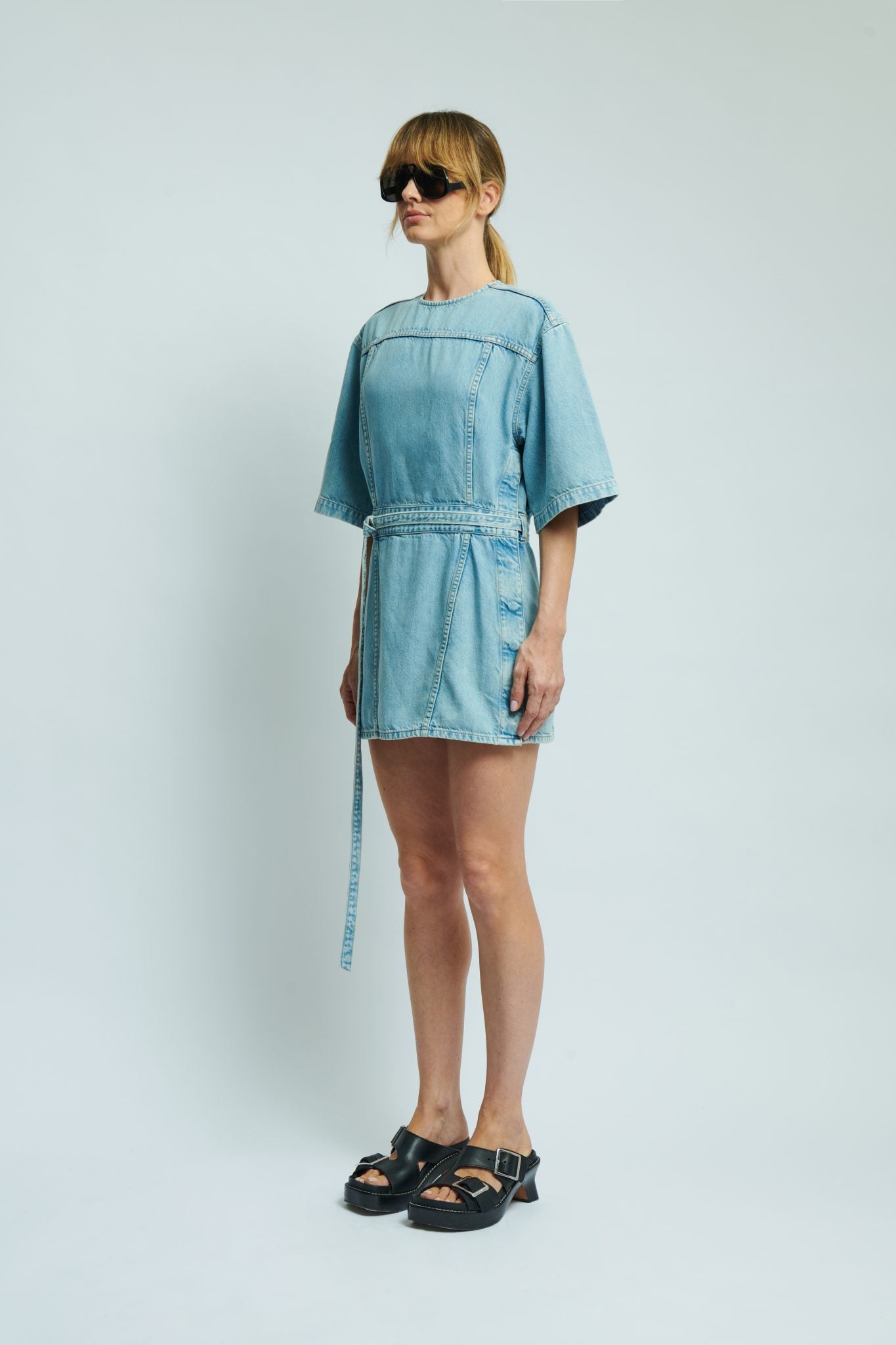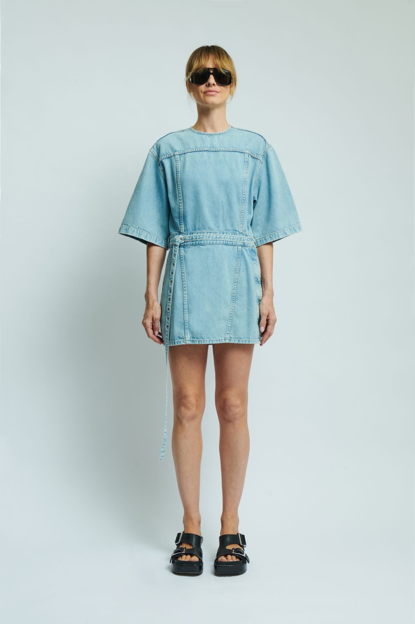 Emy dress er den moderne denimkjolen vi ønsker oss denne våren! En strukturert og firkantet minikjole med innsnevring i livet og store ermer- som skaper den perfekte balanse mellom femininitet og maskulinitet. Kjolen fullføres med en patchwork-stil i en lysvasket blåtone, knytebelte i livet og knapper i siden. Kjolens rygg har en dyp v-utringning, lukket med en knappespenne i nakken.