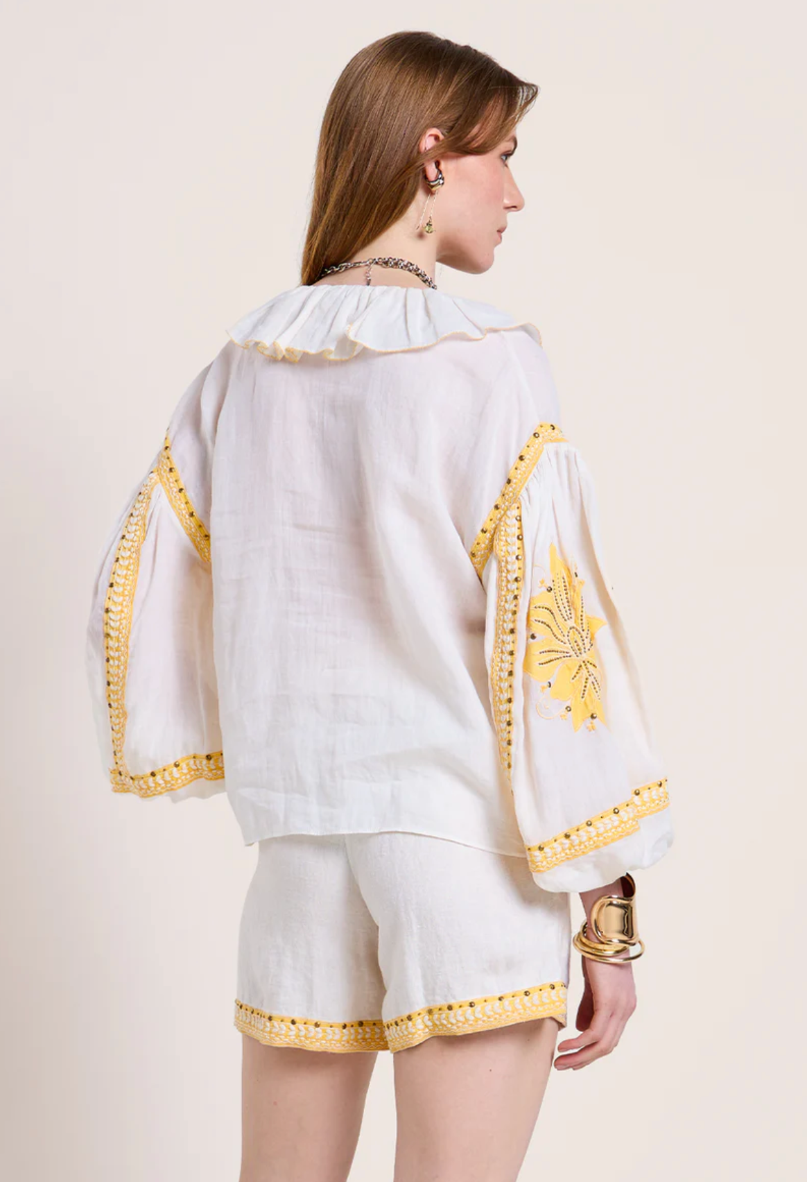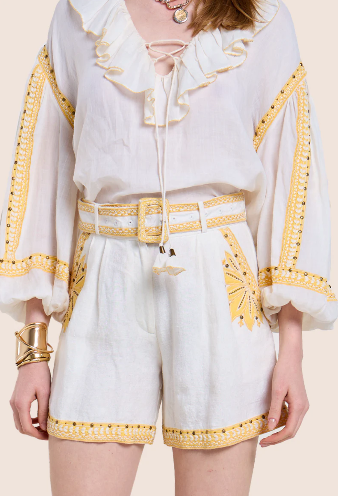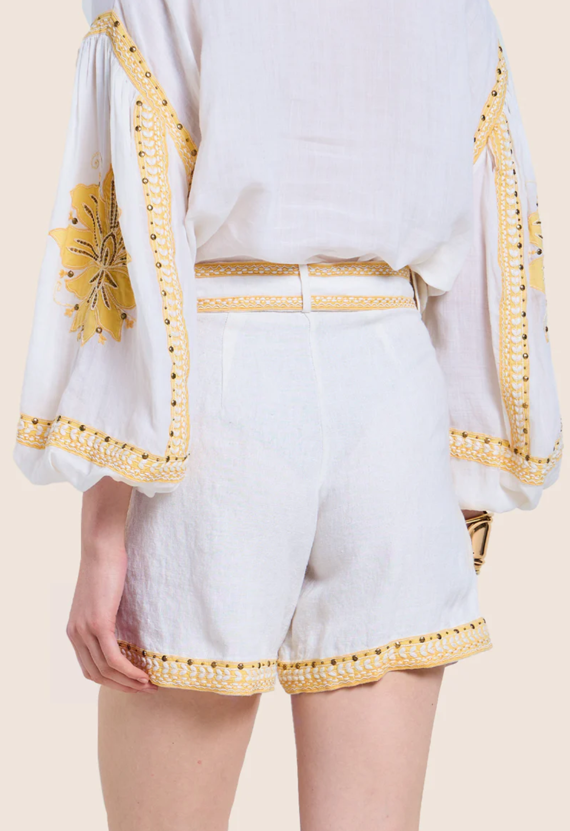 Utstrål tidløs sofistikasjon med Love the Moments Shorts. Dette plagget er laget av lin som faller tungt og delikat mot kroppen, med et buckram-fused stivt og avtagbart belte med dekorerte blondekanter for en chic og strukturert look. Kontrastbroderiet på shortsen er laget i en varm solgul farge, kombinert med antikke messingdetaljer i håndbroderte perler og paljetter som innrammer lommer og sømkant. Dekorerte blondekanter fullfører designet, og tilføyer et raffinert preg til plagget - passende til enhver garderobe. Kombiner med tilhørende Love the moment bluse for en komplett look.