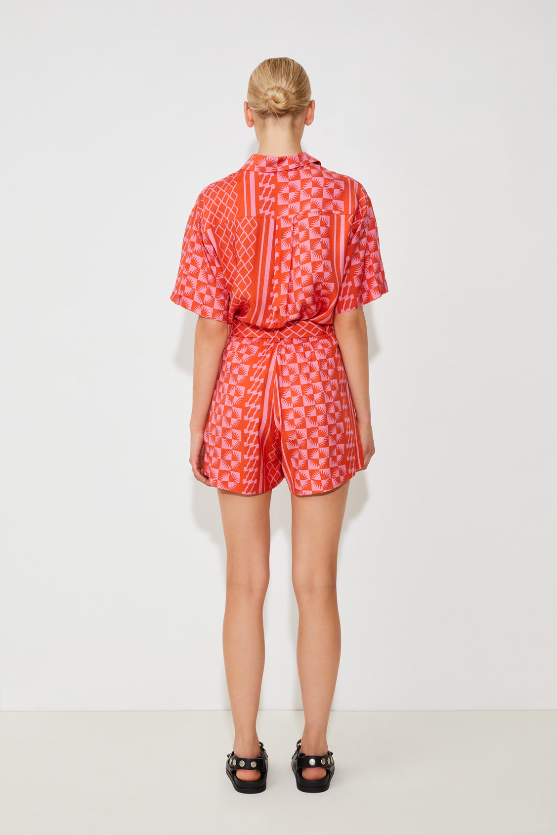 Denne lette og stilige shortsen er et perfekt valg for varme dager! Bobby shorts fra SUNCOO tilfører lekenhet og spriter opp garderoben med sitt fargerike oransje og rosa grafiske mønster. Shortsen har en avslappet passform og et knytebelte i livet som fremhever silhuetten på en flatterende måte.
