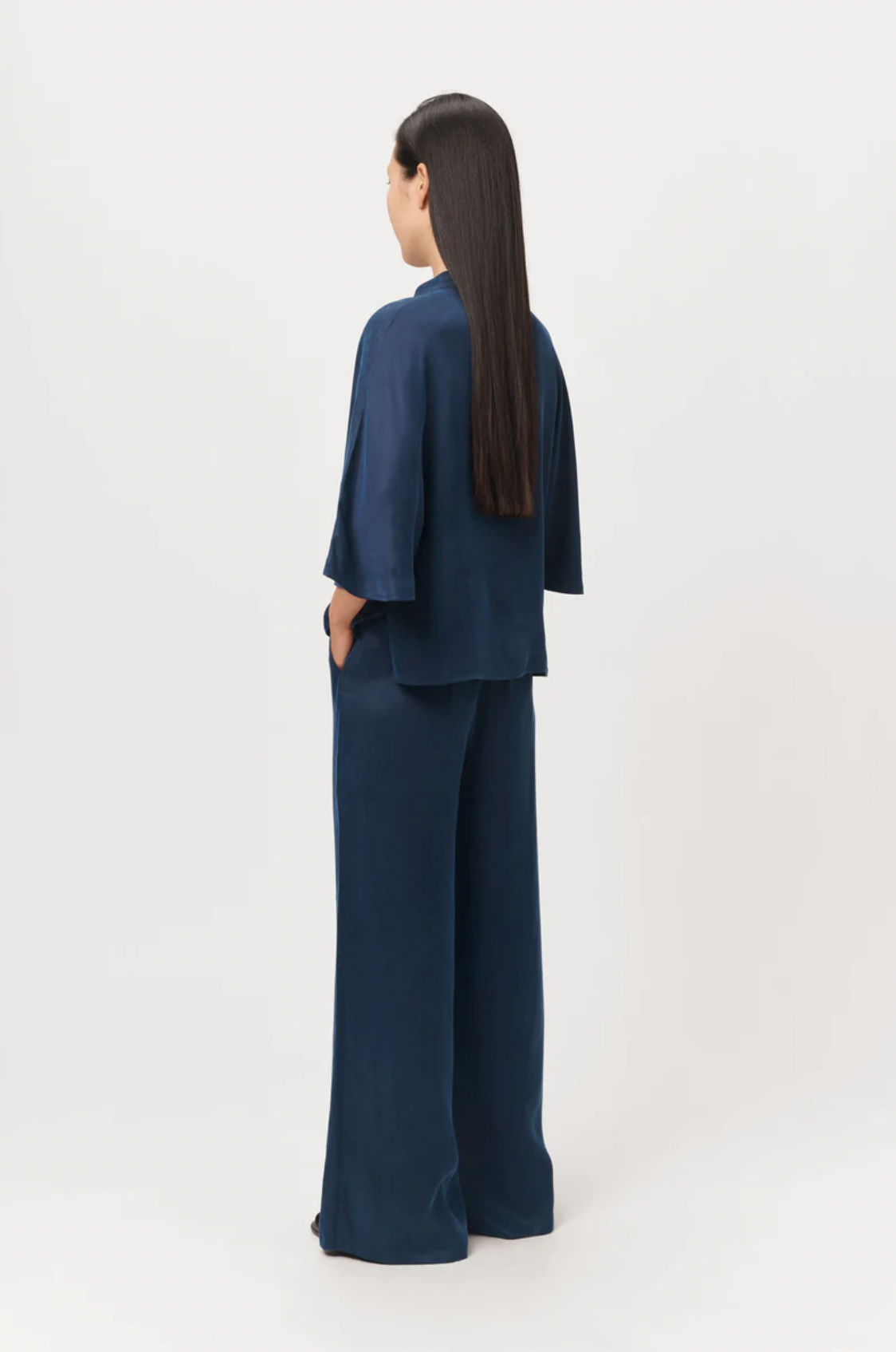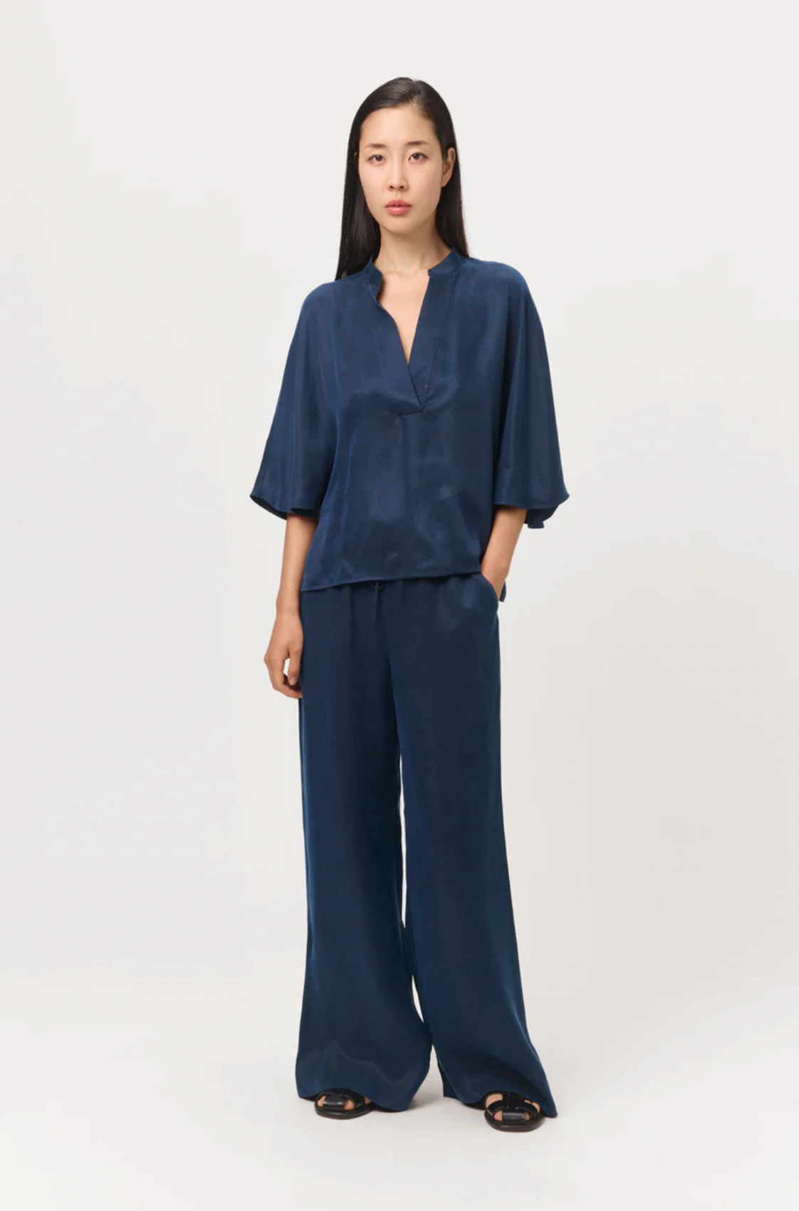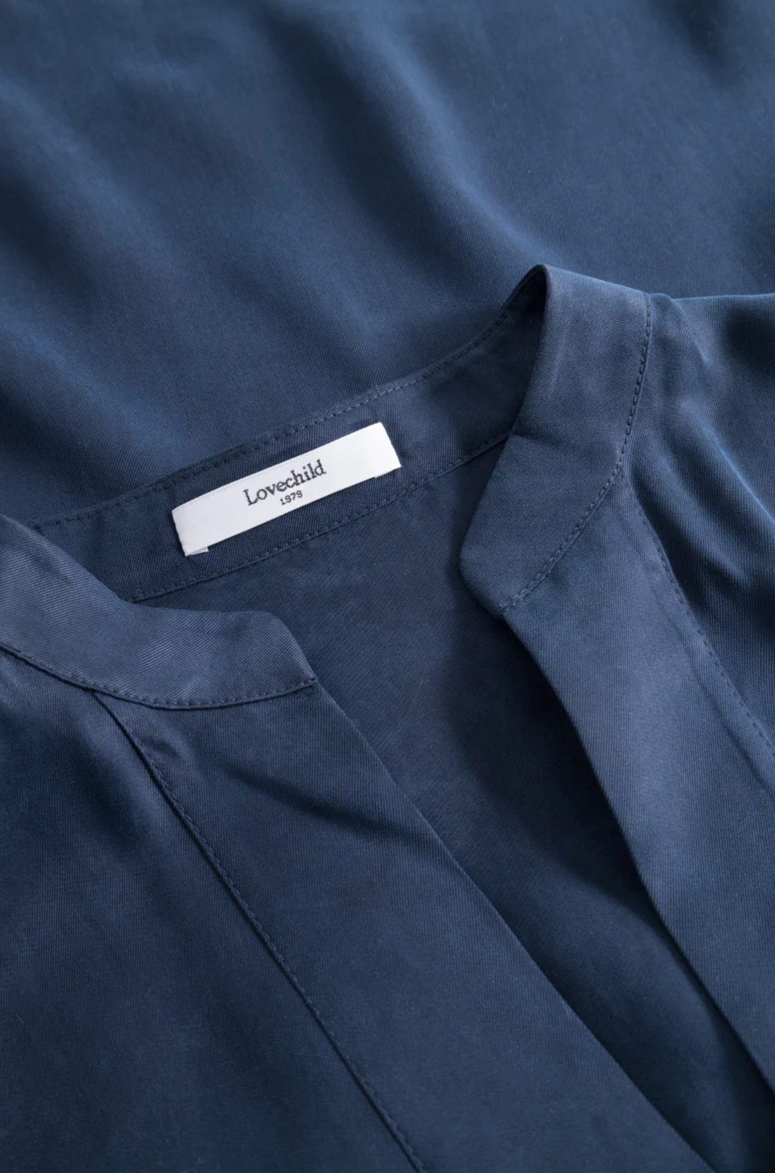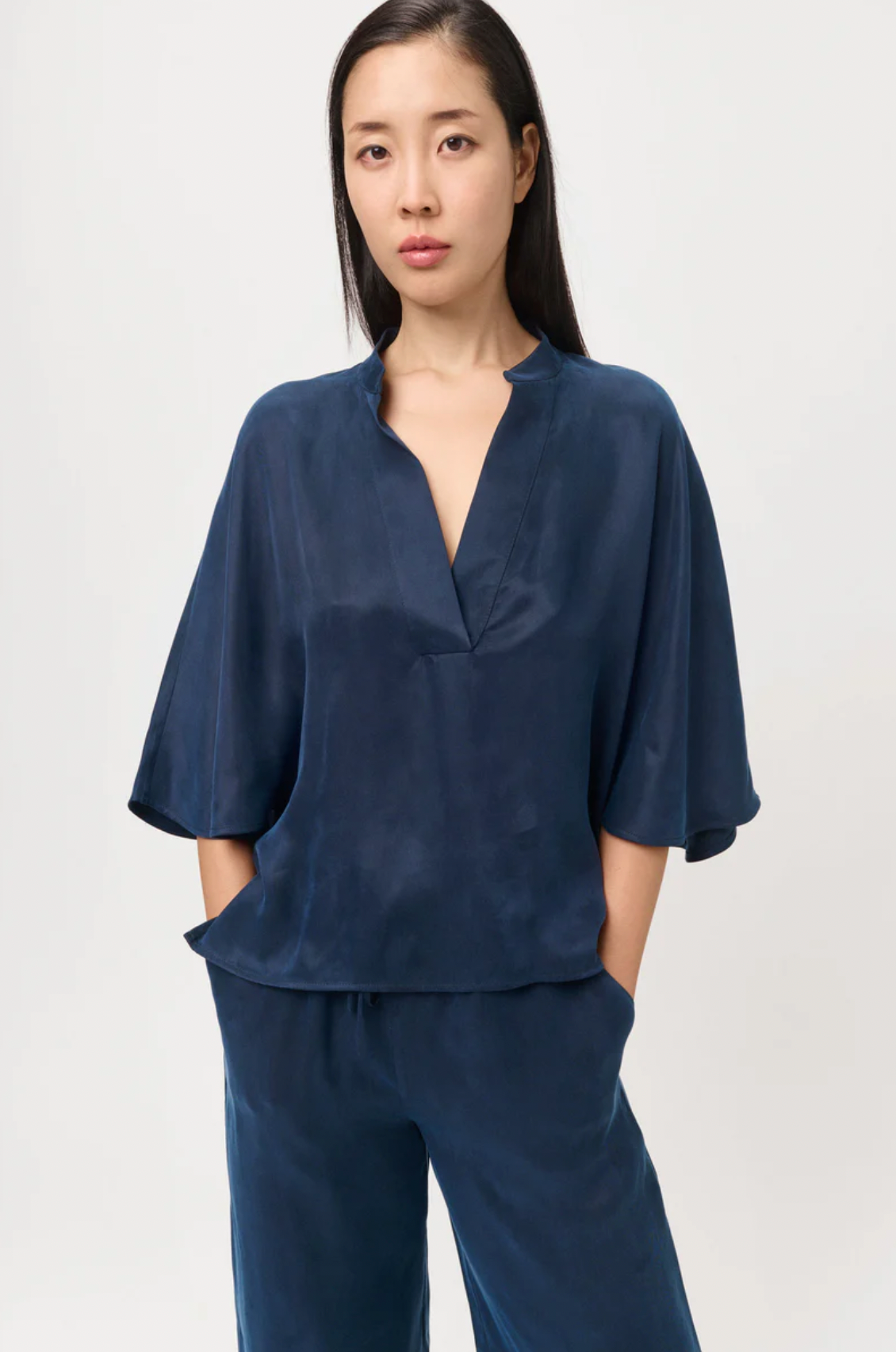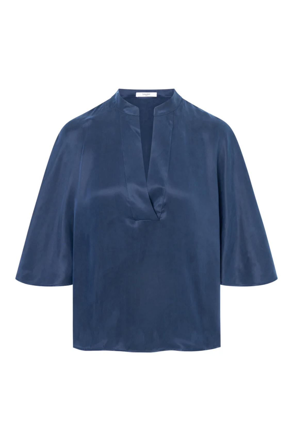 Liesel blouse er en lett og behagelig bluse laget av 100% Cupro, som gir et vakkert gjenskinn i den midnattsblå tekstilen. Blusen har en t-skjorte-fasong med V-hals og kragekant, med løse ermer i albuelengde, og en boxy fit.