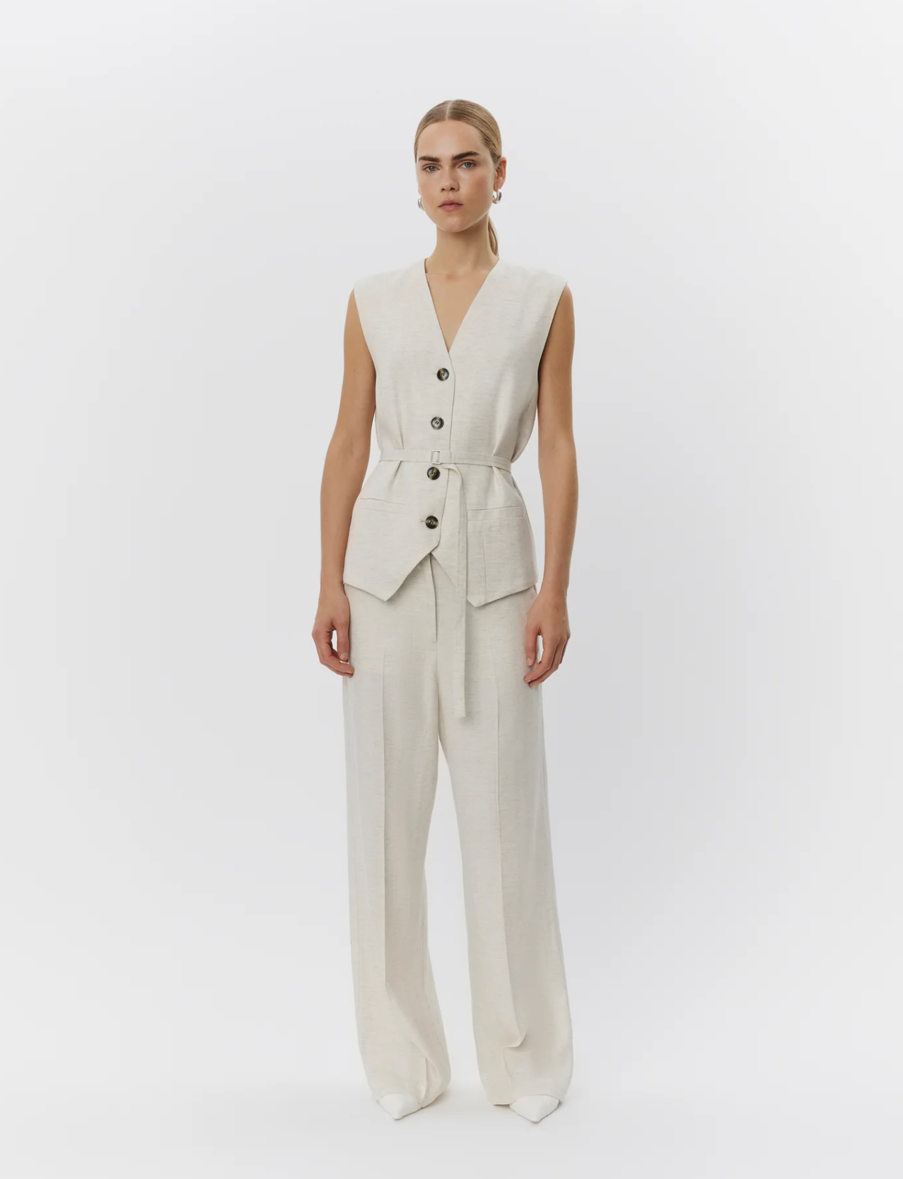 Palmer Summer Tweed Vest fra DAY er en klassisk vest i Tencel og lin, laget med mørkebrune knapper og sidelommer. Vesten har en rett passform, med mulighet for innsnevring i livet. I en nydelig beige farge, er denne perfekt for sommergarderoben.