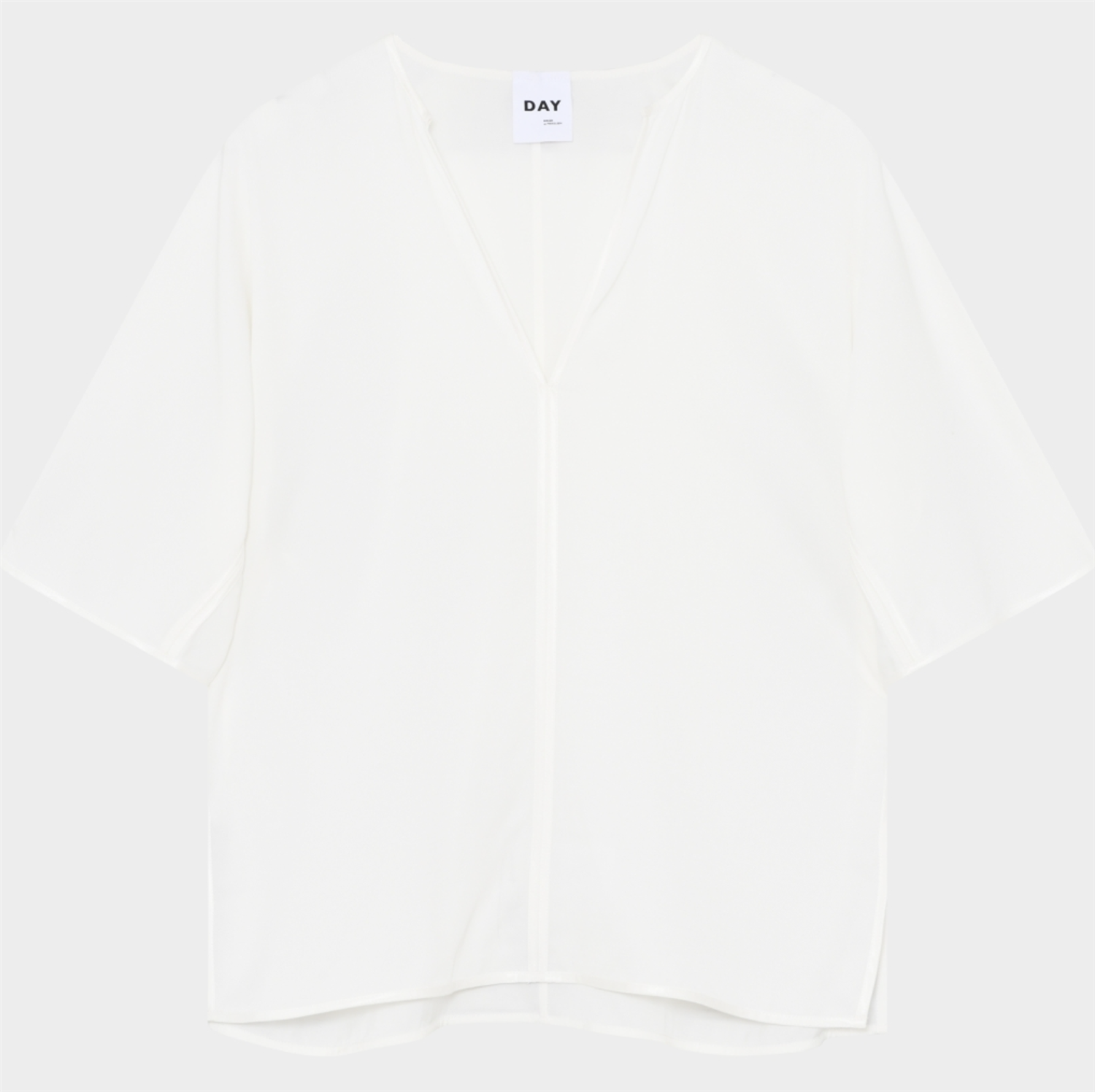 Rue - Light modern Twill fra DAY er en klassisk t-skjorte med V-hals og splitt i sidene. Toppen har korte ermer med splitt i endene, og en klassisk regulær passform. Et flott tilskudd til garderoben som et baseplagg med det lille ekstra, perfekt til en hverdagsjeans.