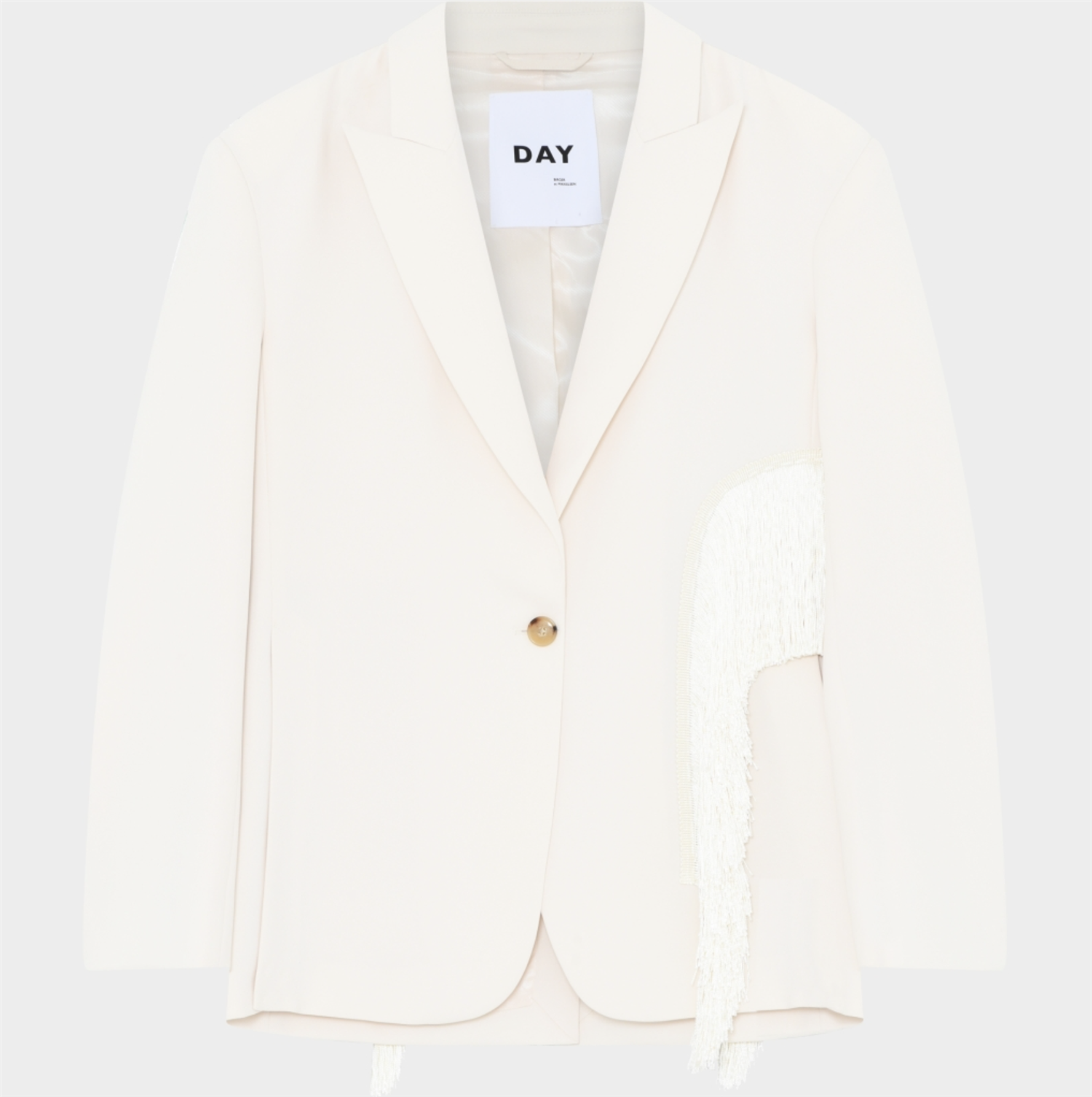 Havey blazer følger den klassiske silhuetten til den elskede Classic gabardine-serien til DAY, og tilfører moderne estetikk med sine frynsede detaljer. Jakken har et asymmetrisk mønster av frynser som strekker seg fra midjen og bakover ryggen, som gir en leken og spennende twist på den klassiske dressen. Jakken lukkes med en enkel knapp, har vatterte skuldre, splitt i front, og knapper ved håndleddet. Blazeren er fullt fôret og har en svakt oversized passform.