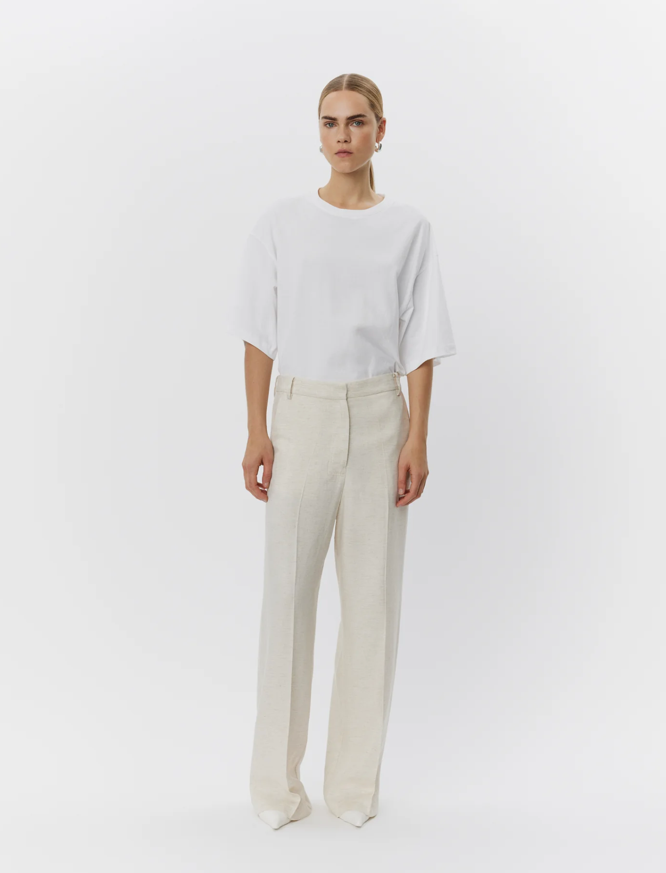 Jade Summer Tweed Pants fra Day er en mid-rise dressbukse med vide bein, side- og baklommer, i en strukturert blanding av Tencel og lin. En elegant og deilig bukse for det varme sommerværet, som sikrer stil på kontoret selv i sommervarmen.