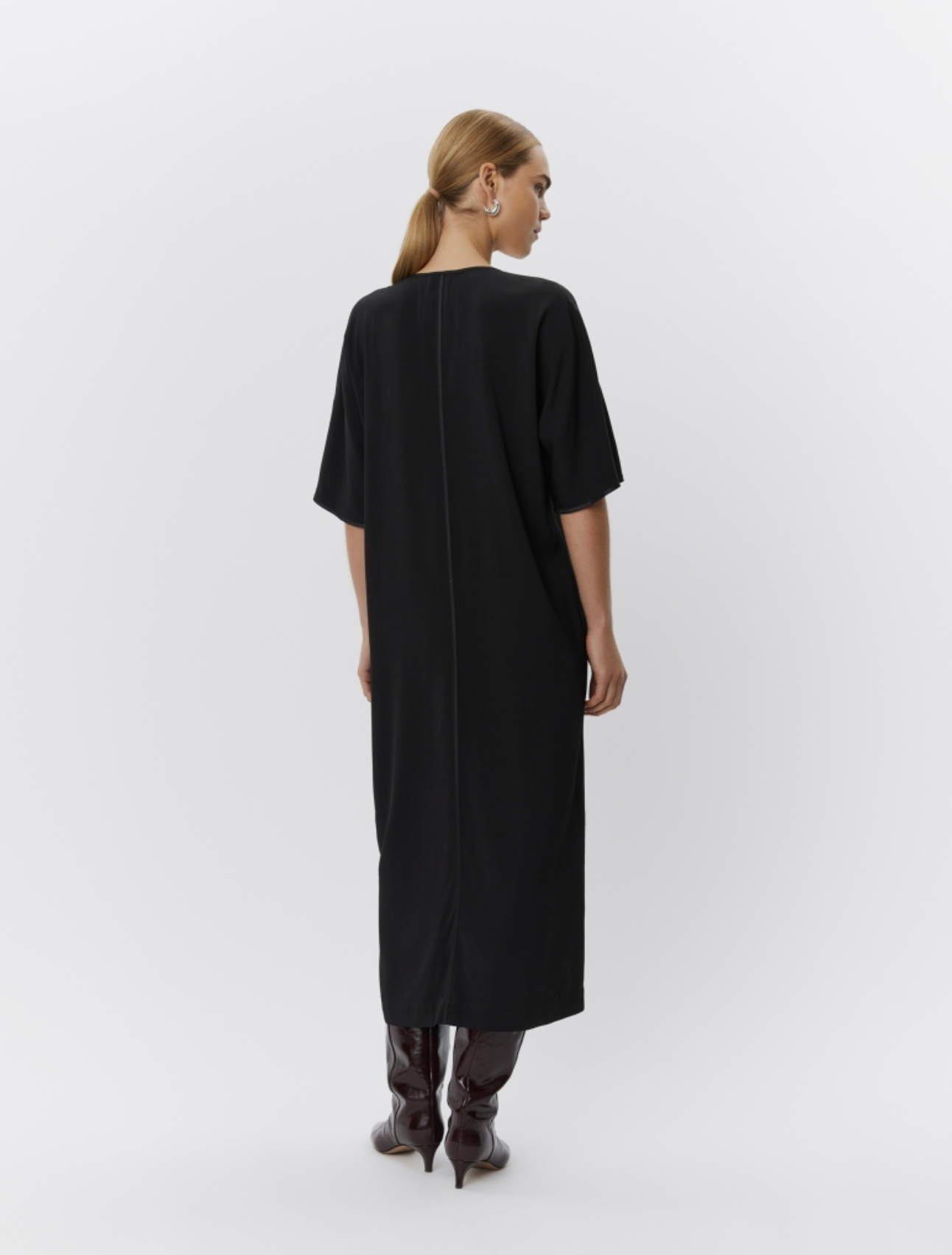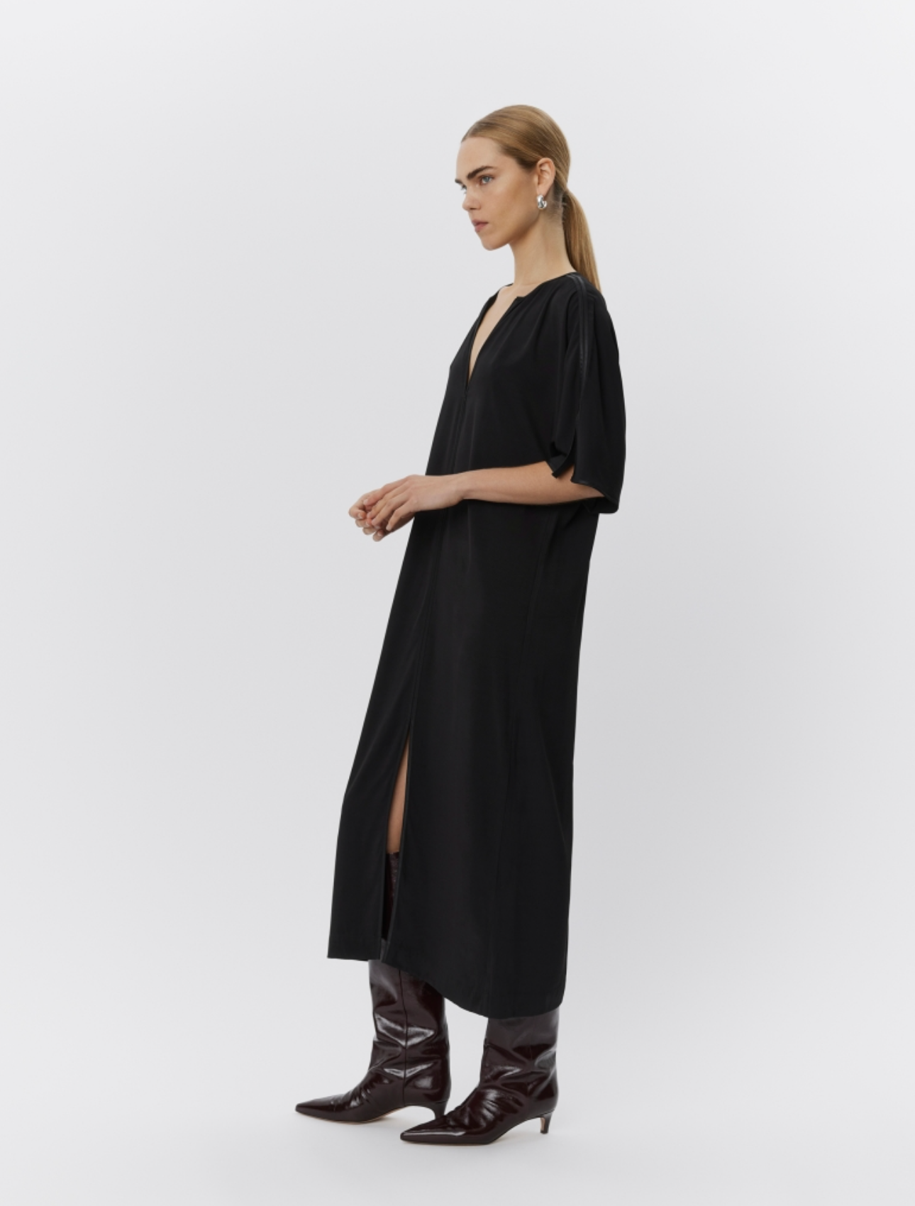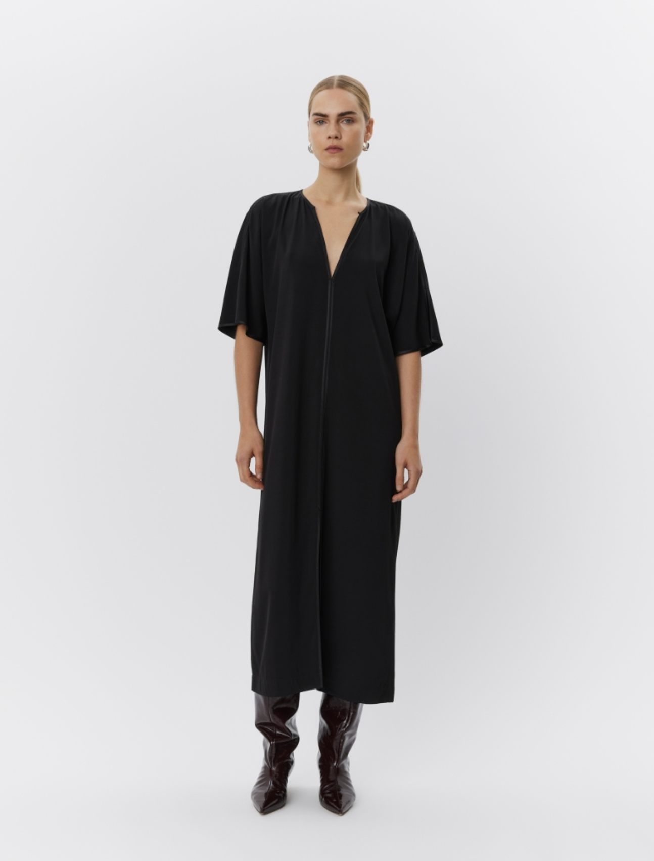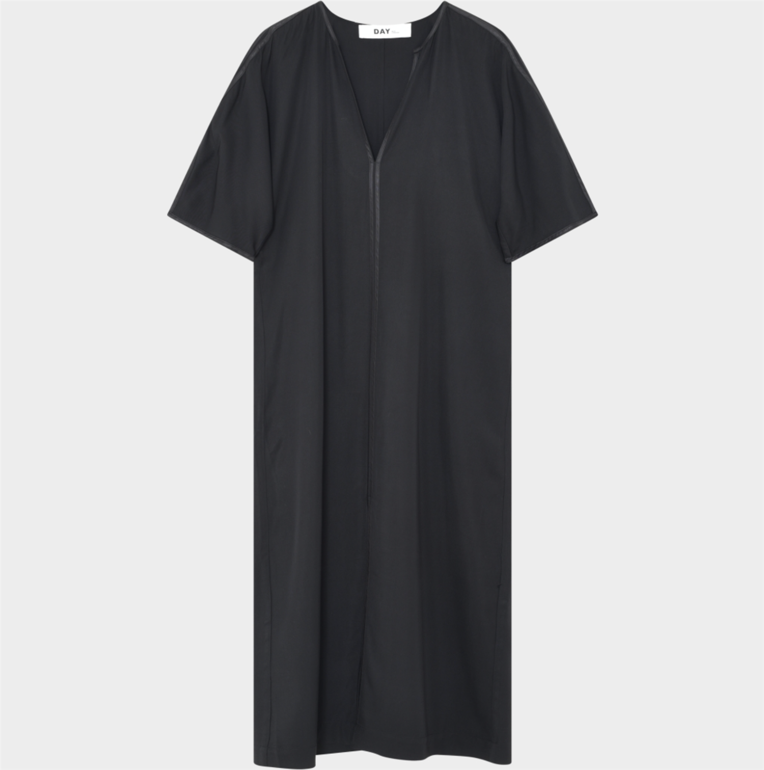 Hill Light Modern Twill fra DAY er en kaftan-preget kjole med V-hals, korte ermer og splitt i front. Kjolen har albuelange ermer med splitt i sidene, og en løs og ledig passform. En god kjole for å lounge rundt i mot sommeren, perfekt å trekke over bikinien for en finere middag på ferieturen.