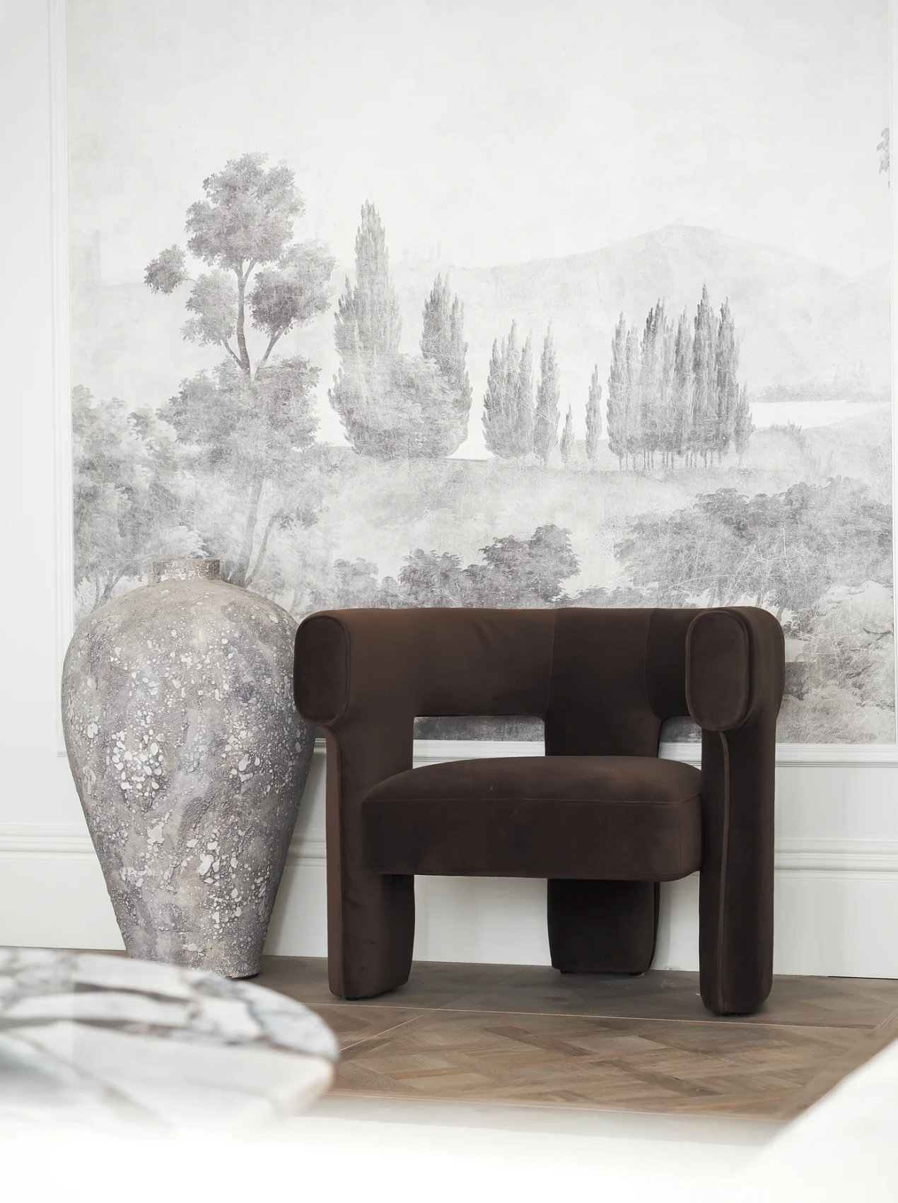 Gigi chair har et formspråk som kombinerer skulpturell eleganse med funksjonell komfort. Stolen har en organisk, men strukturert silhuett som gir et kunstnerisk og arkitektonisk preg - trukket i en rik sjokoladebrun Velur. Stoffet gir stolen en sann lounge-vibe, perfekt for å skape en avslappet tone i ditt hjem.