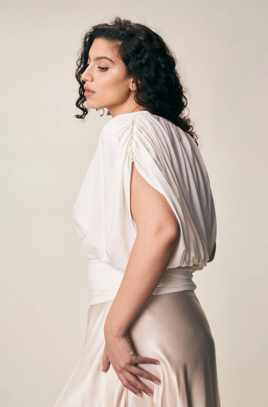 Conus Top Coconut milk fra Viveh. Conus-toppen er laget av deres signaturmateriale Ecovero viskosejersey, og blander komfort med stil. Conus har en løs øvre passform og en tettsittende midje, den har utvidede skuldersømmer som skaper et fallende hettehylse. De rynkede skuldersømmene faller elegant inn i vertikale gardiner foran og bak. V-halsen er formet av overlappende frontpaneler, mens et separat midjepanel med sidesømmerynkning introduserer stilige horisontale rynker. Toppen blir raskt en favoritt i garderoben og kan styles opp eller ned etter anledning.