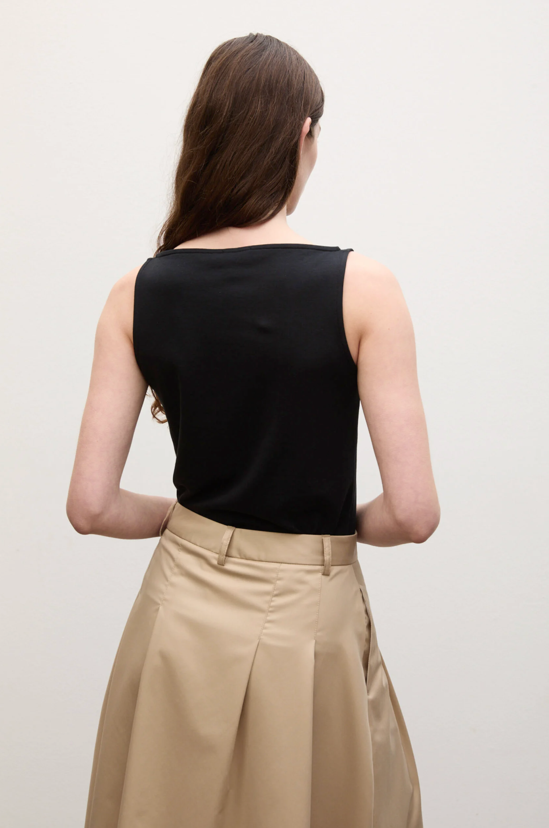 Beatris top fra Julie Josephine er et allsidig baseplagg med en vid båthals-utringning , med tonal topstitching og en rett passform. Toppen er laget av en myk italiensk bomull- og polyamidblandet jersey. Bruk din boatneck top til en flatterende og luftig linbukse for en behagelig sommerlook, eller pynt den opp med skjørt og blazer som en fin base til antrekket.