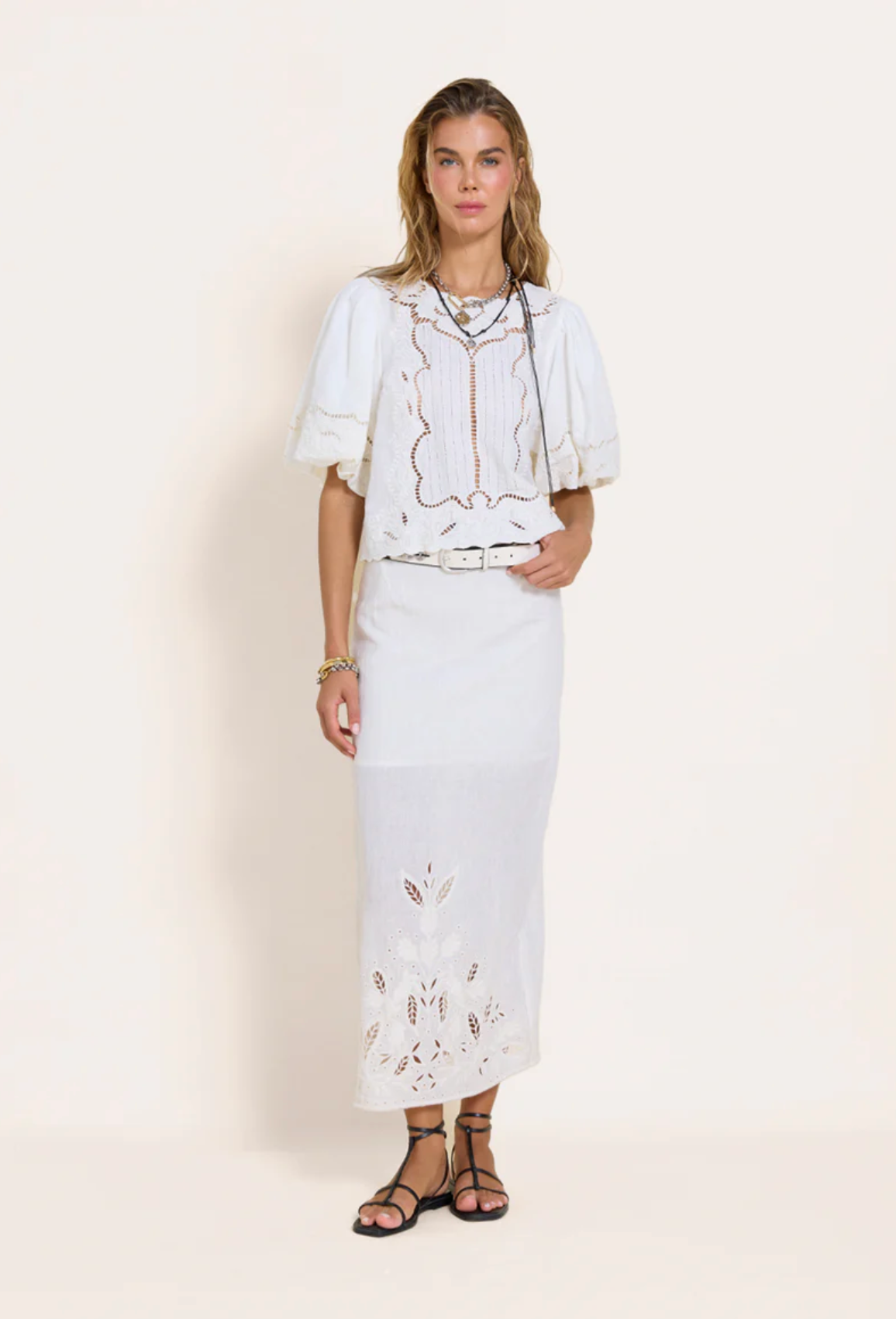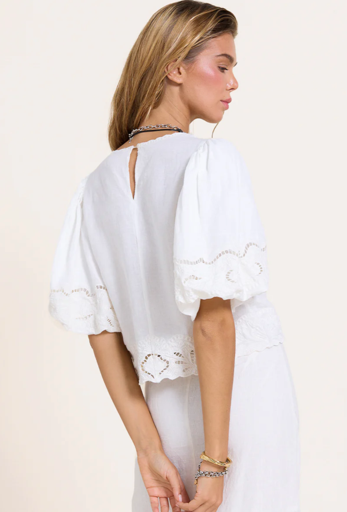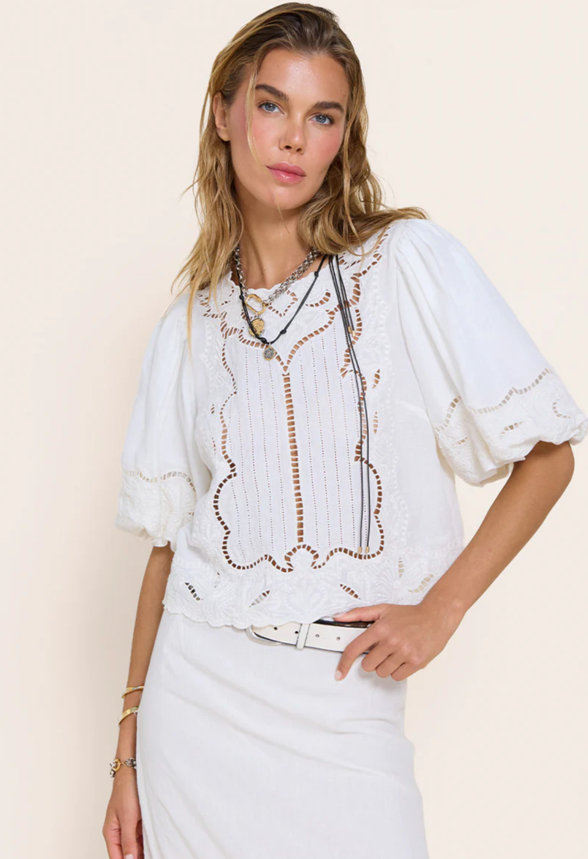 Zenith Top i Vanilje fra Scarlett Poppies er en ny sesongfavoritt med sin firkantete form og ballongermer. Toppen har intrikate cutwork broderier og detaljer nedover brystet, mens den runde utringningen gir et raffinert touch.