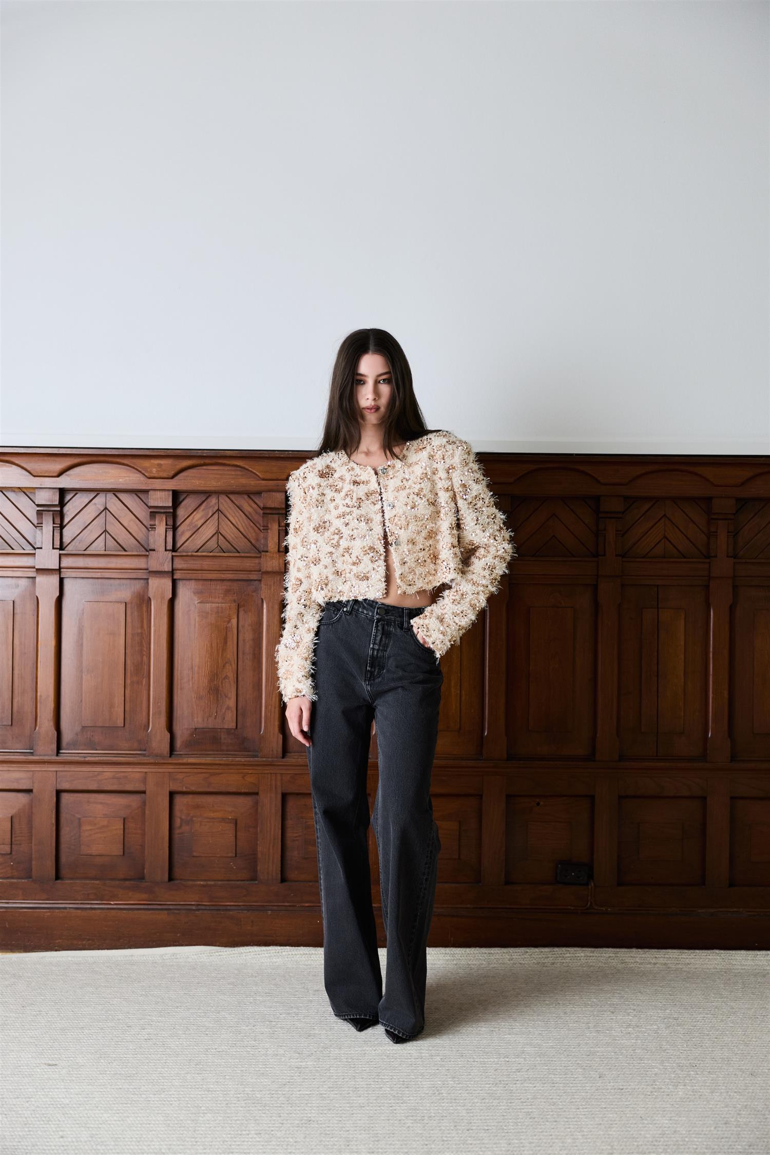 Glitz Jacket Cream fra Iben. Sesongens statement plagg. En cropped jakke med glitterdetaljer. Jakken kan brukes både åpen og lukket. Den har skulderputer og lukkes med knapper. Bruk den over en enkel kjole eller dressbukse, eller så kan du tone den ned med en jeans.