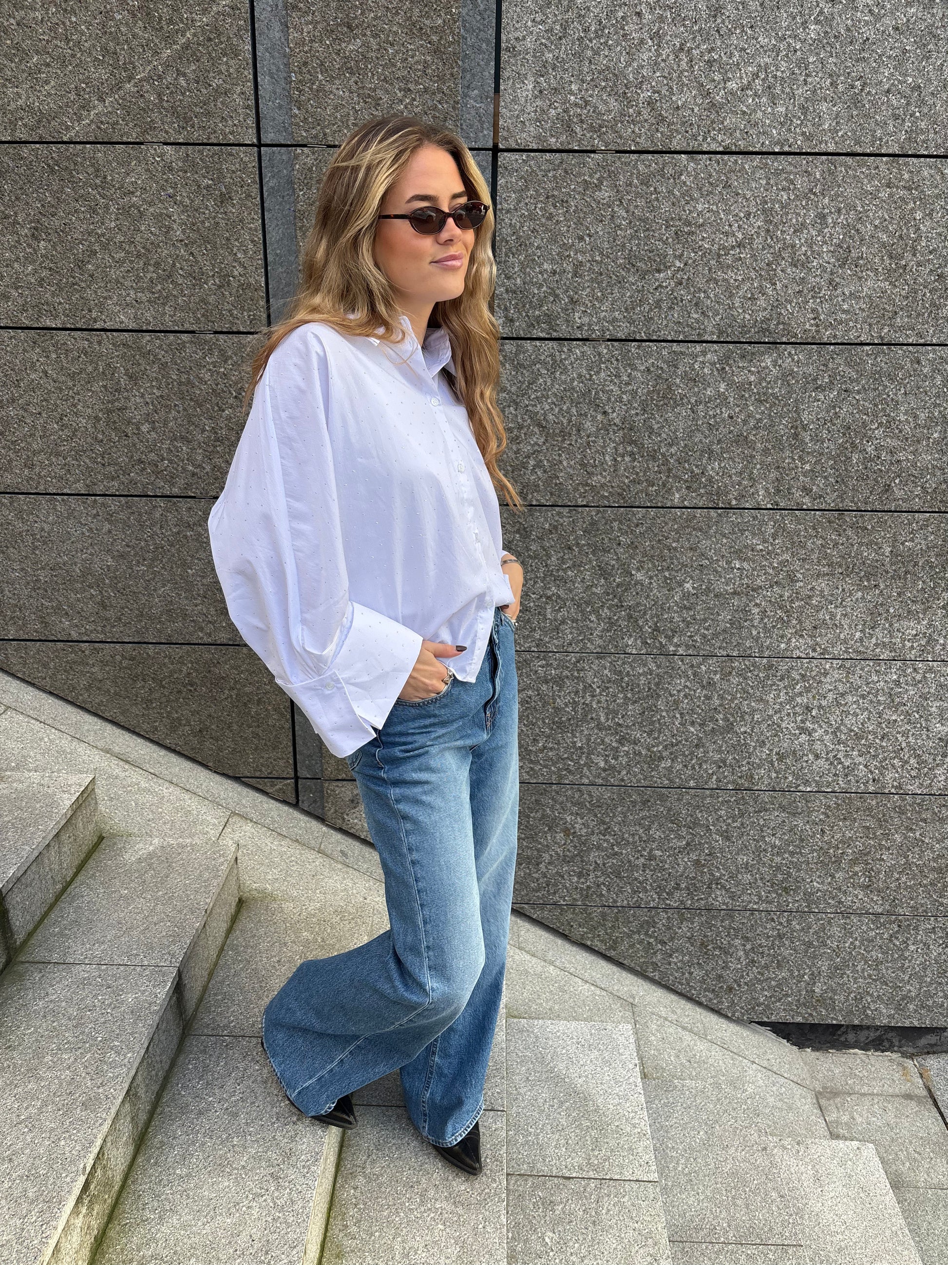 Atari Shirt Embellish fra Iben - den klassiske skjorten med det lille ekstra. Skjorten har en løs, firkantet passform med vide ermer og brede mansjetter med splitt. Atari shirt har klassiske skjortedetaljer med knepping i front og krage, og er en showstopper med sine vide ermer og trendy passform. Skjorten kommer nå i en nydelig hvit base med rhinestones, som hever skjorten fra hverdagsantrekket til formelle kveldsanledninger! Den ultimate skjorte for å lyse opp hverdagen.
