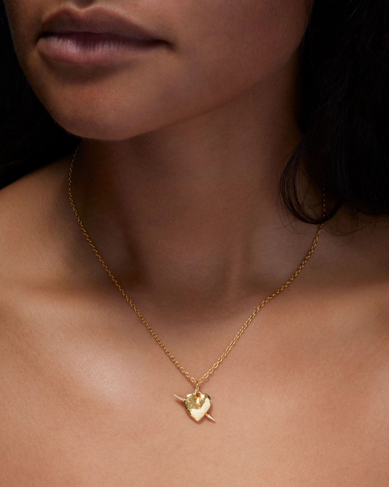 Smykket er laget i sterling silver belagt med 18K gull, med et anheng av et hjerte med spyd som gjennomtrenger det. Et tidløst smykke som tåler bruk.