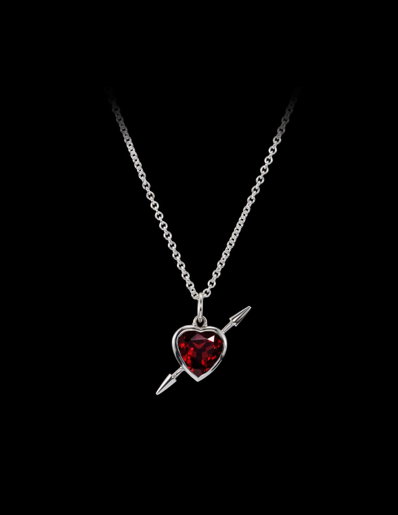 Smykket er laget av 925 sterling silver, med Mosambikkgranat som edelsten som pryder det spiddede hjertet.