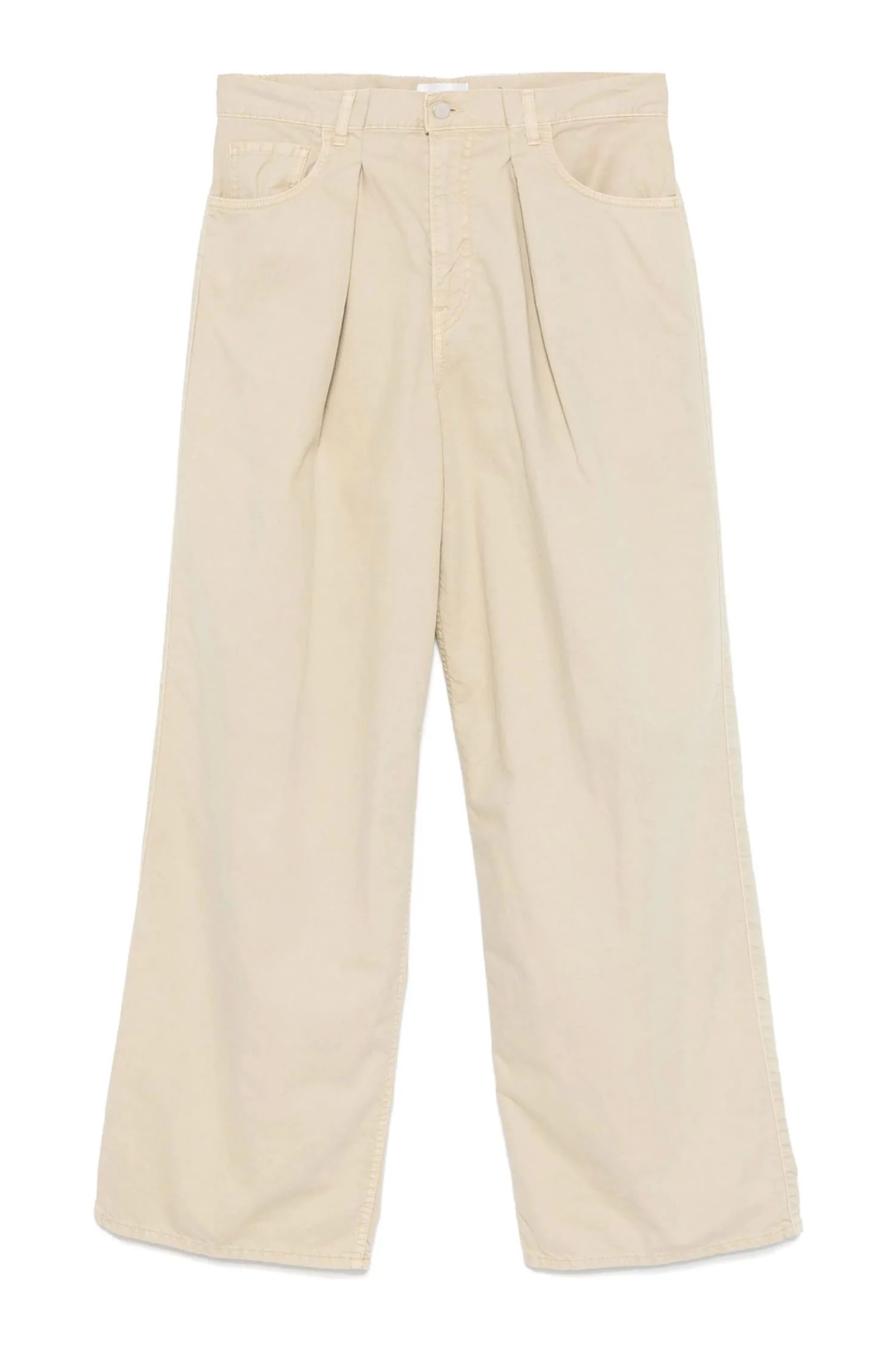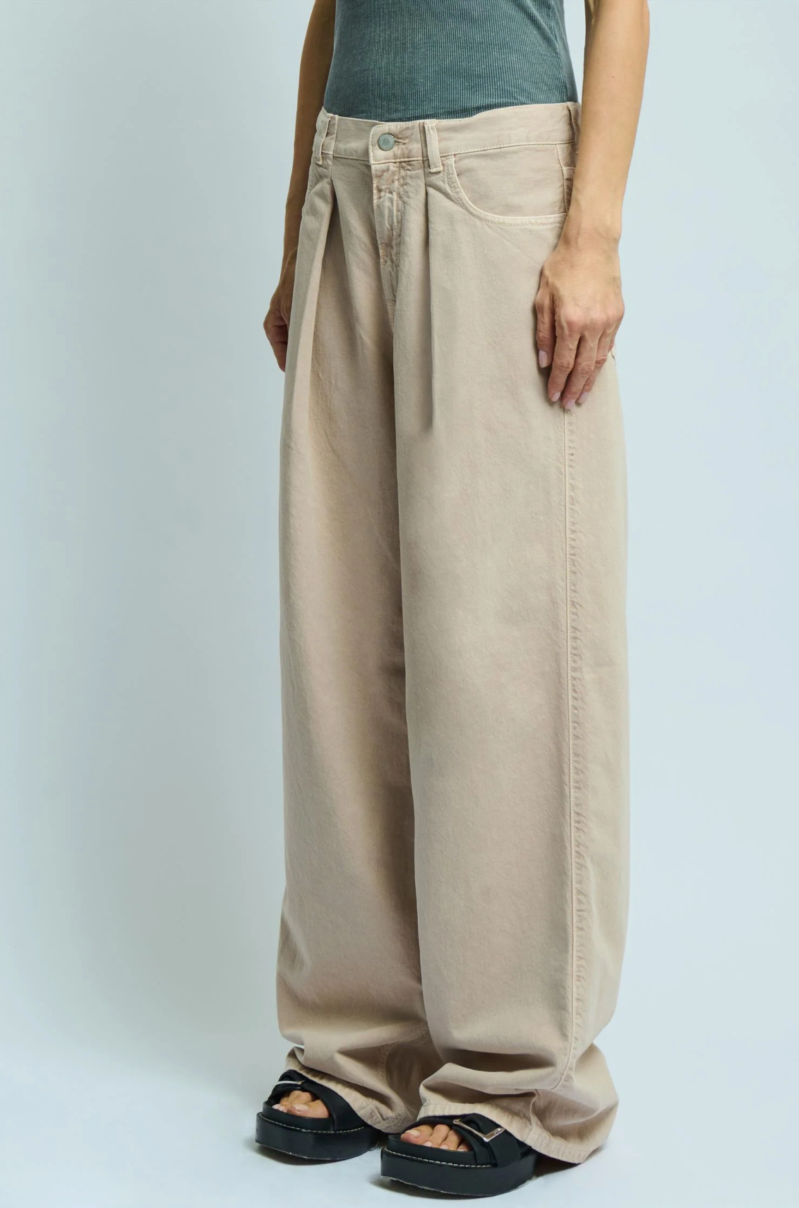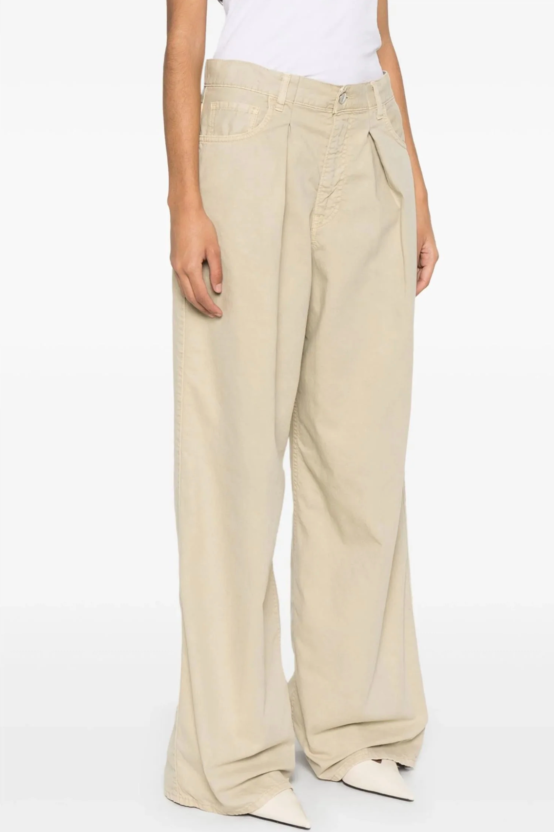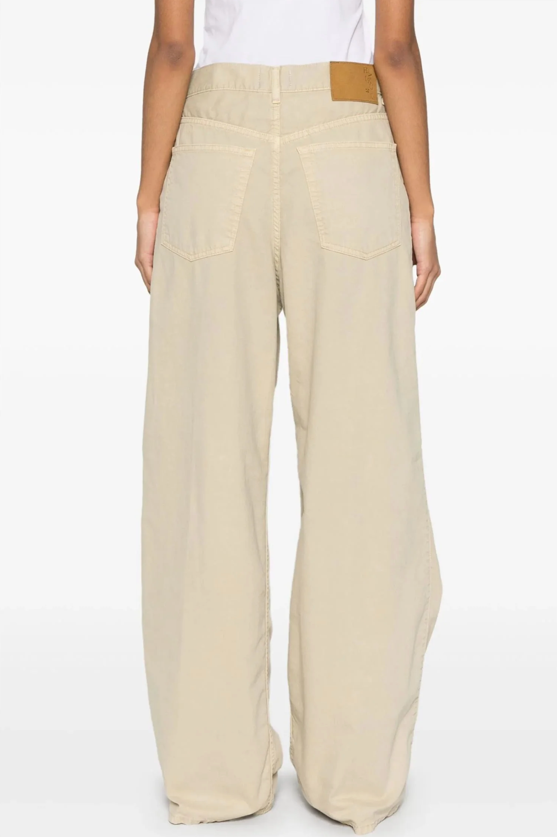 Candy Ecru fra Haikure er en kraftig denimbukse laget av 82% bomull og 18% Lyocell. Buksen har en løs og vid passform med pressede rynker i front, designet for å sitte lavt på hoftene. Buksen har et avslappet uttrykk i en sandfarget ecru-farge.