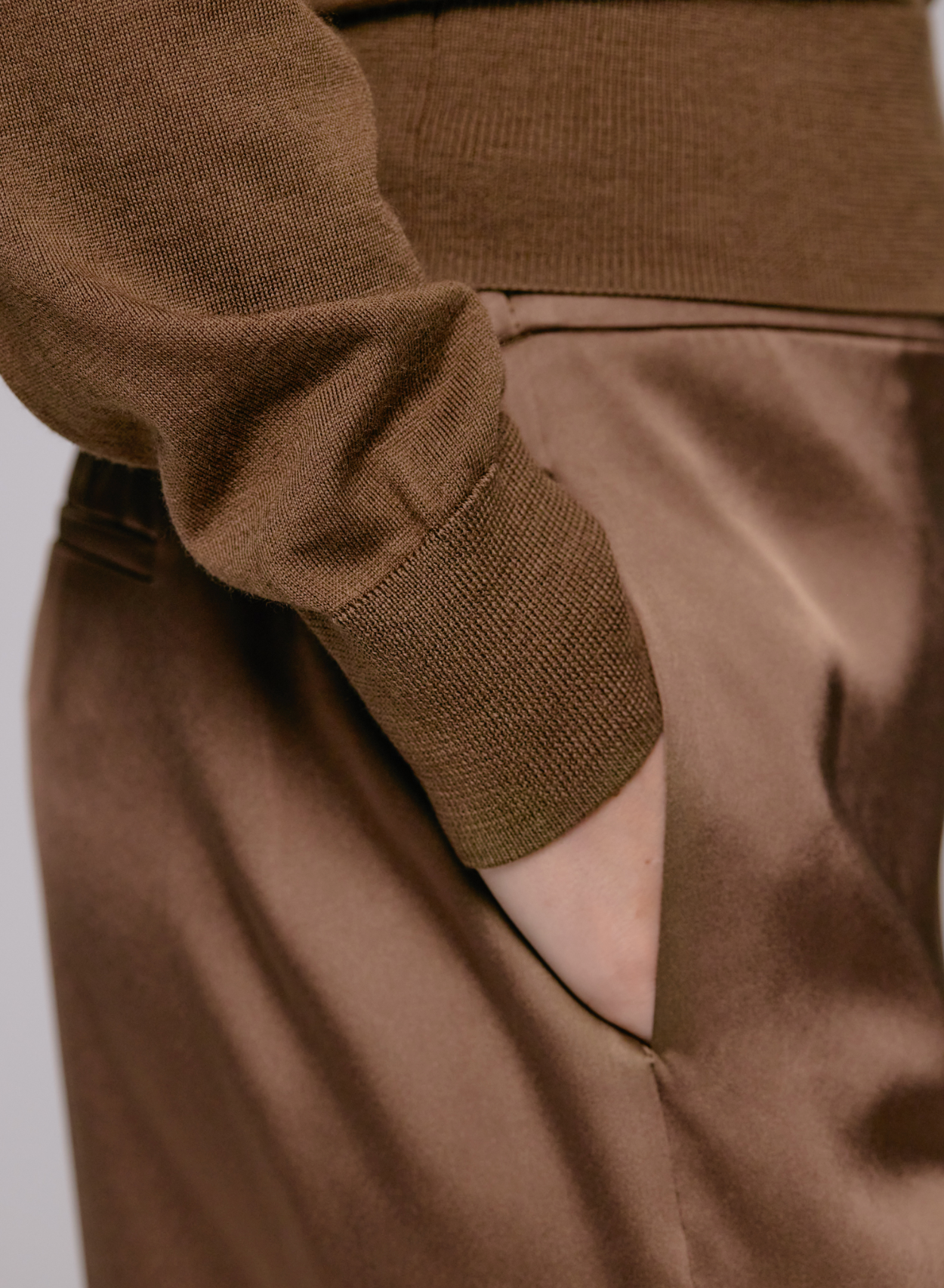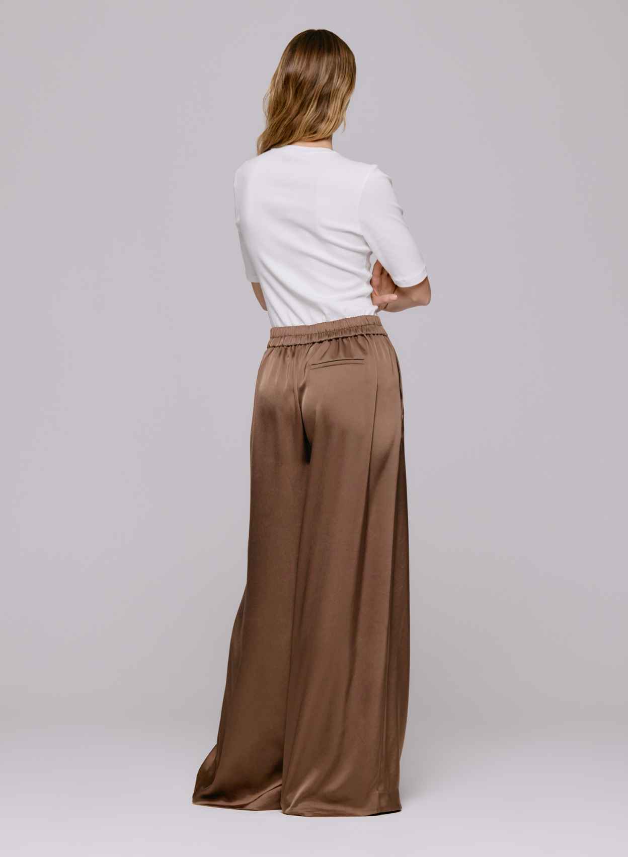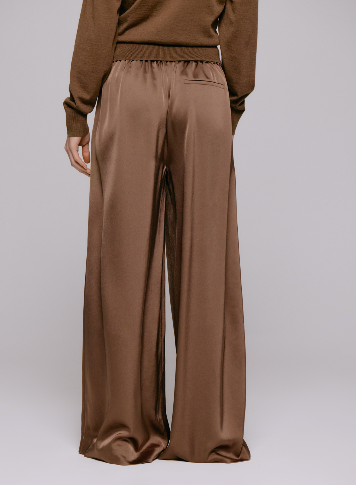 Celia Trousers fra Julie Josephine er en elegant, flytende og flatterende bukse - designet for å bevege seg vakkert med kroppen. Laget av luksuriøs sateng med en svak skinnende effekt, draperer buksen seg avslappet nedover til en vid silhuett. En allsidig bukse å balansere mellom dag og kveld i.