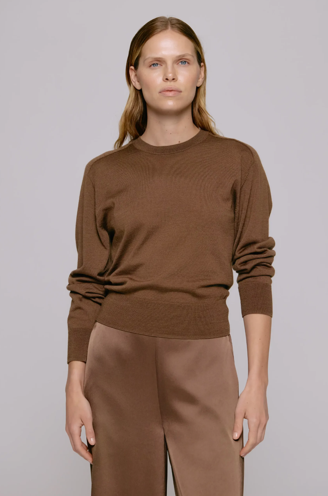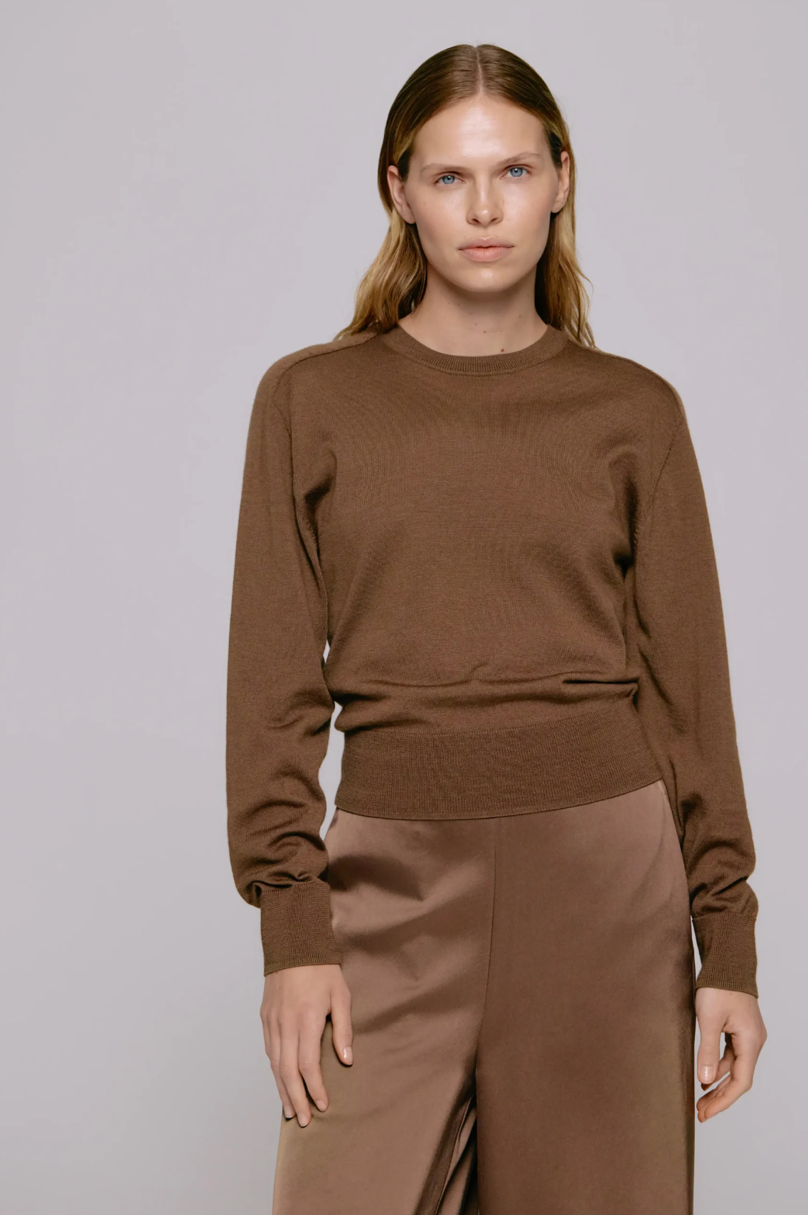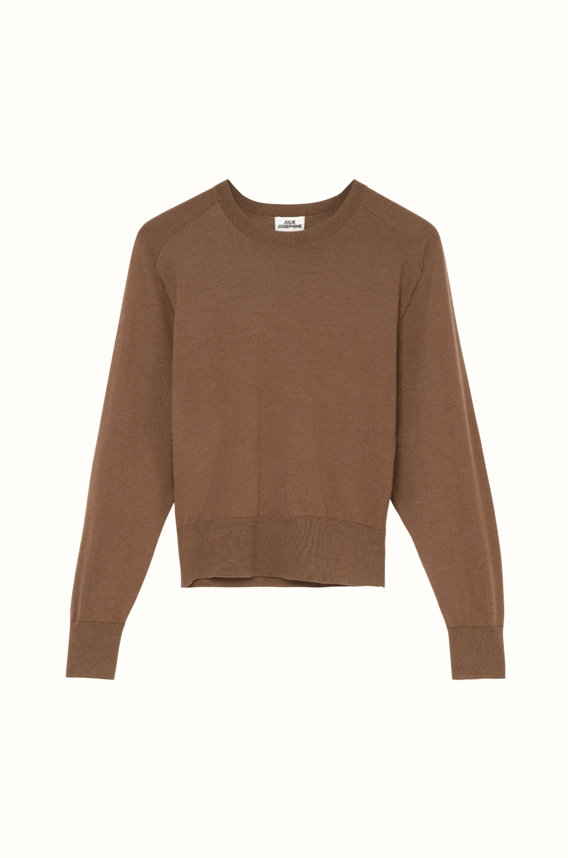 Hanne Sweater fra Julie Josephine kommer i en nydelig kamelfarget bruntone, perfekt for høstsesongen. Genseren har en klassisk ettersittende silhuett med crewneck utringning, laget i en deilig merinoull. Det ultimate tilskudd til basegarderoben, stylet med en enkel hvit skjorte og jeans.