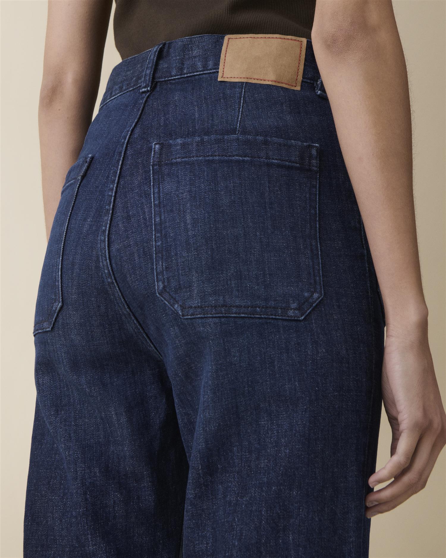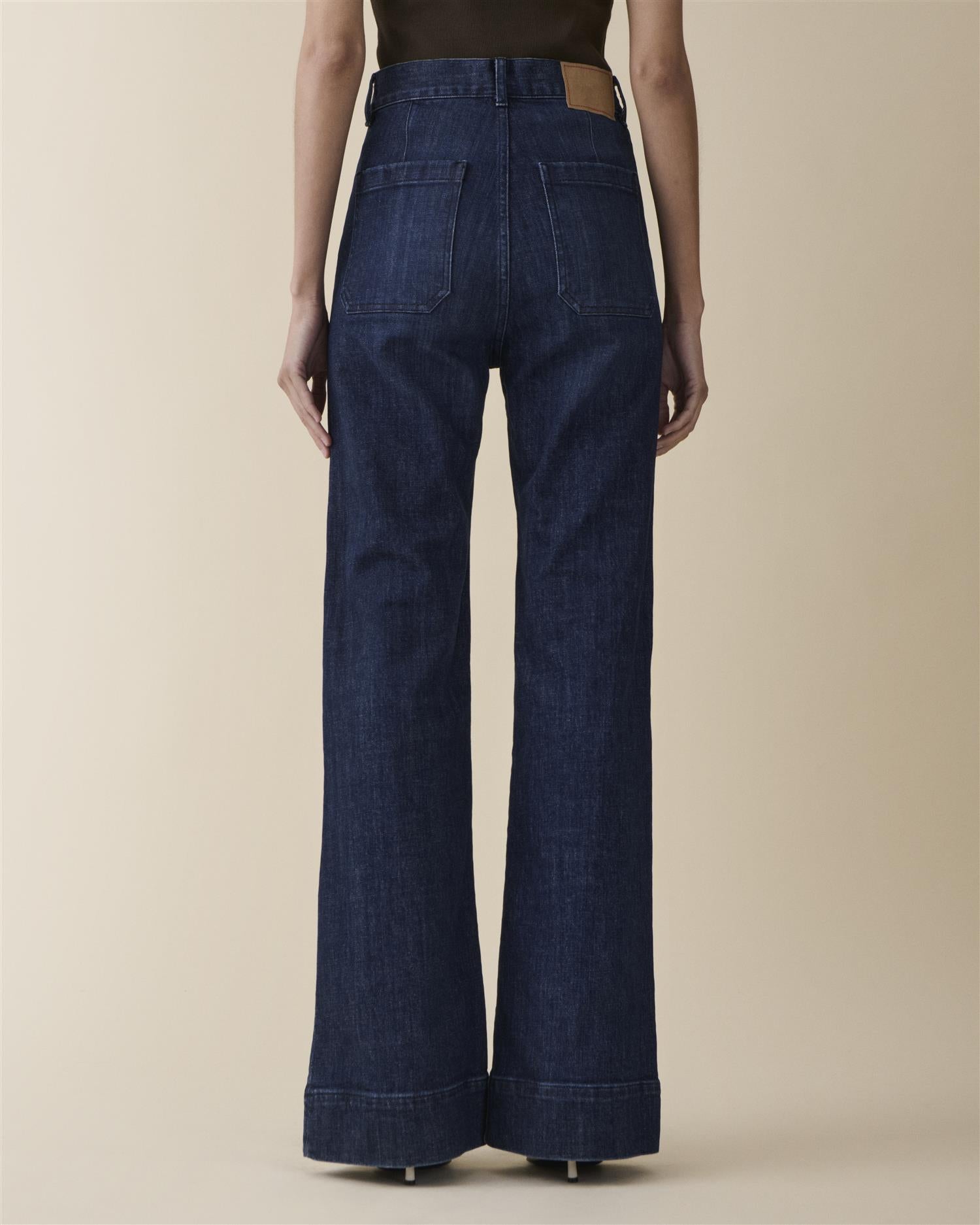 St Monica Jeans Midnight vintage fra Jeanerica. Jeansen er inspirert fra sjømannsarkiver fra slutten av 1960-tallet med sine lappede lommer, flare og brede kantlinjer.