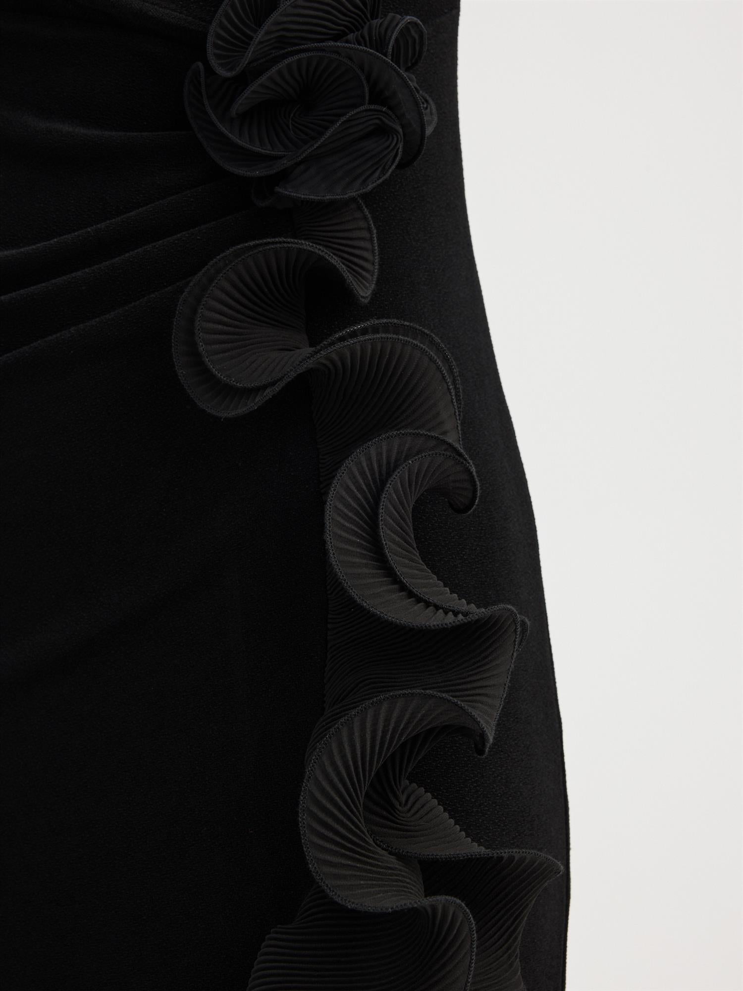 Dion Dress Black fra Ravn Ravn er en elegant og lang kjole, prydet av volanger og tynn chiffon. Kjolen har en ettersittende passform med V-hals og lange ermer,med draperinger som samles i nydelige volanger på venstre side av kjolen. Dion er svaret på den klassiske og allsidige kjole, med livlige detaljer som hever kjolen til neste nivå.