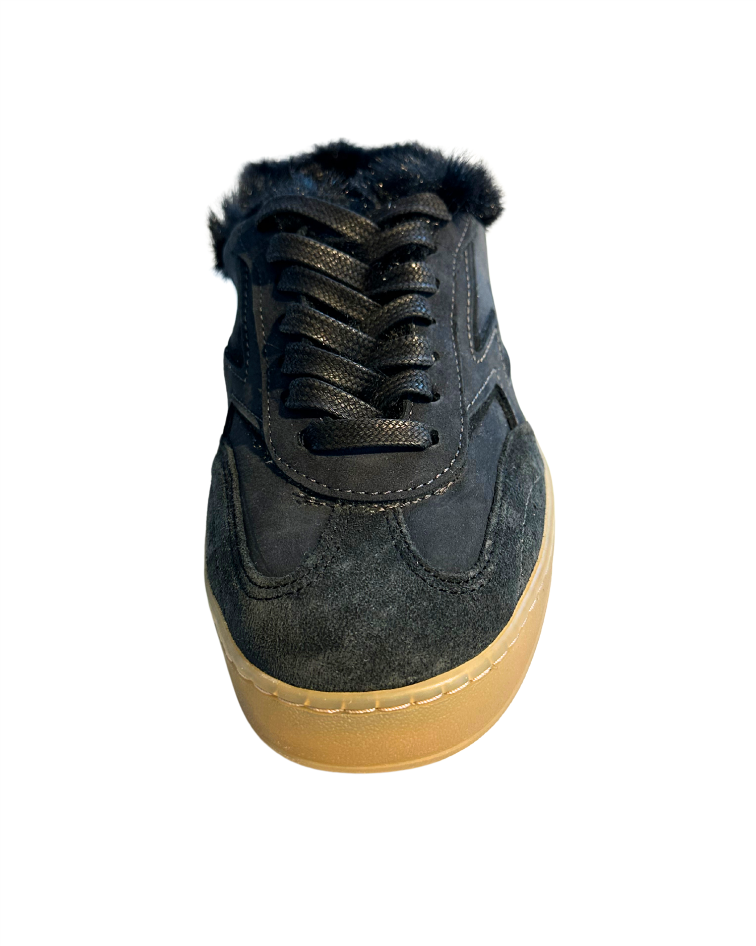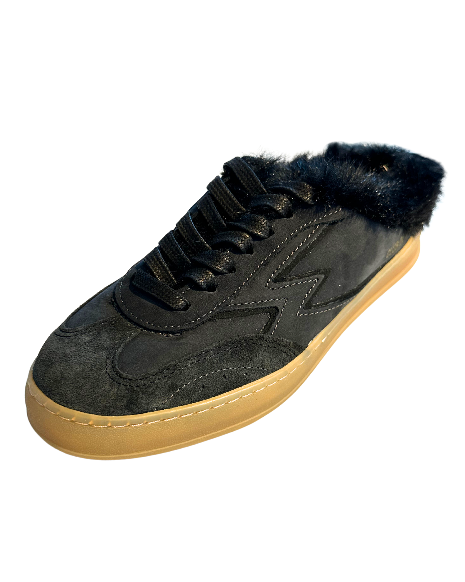 Club Deluxe fra Moa Concept er en lav sabot sneaker i mørk semsket skinn, laget i Italia av skinn. Skoene har en beigefarget gummisåle på 3,4 cm, gråsorte bomullslisser, og topper av med brun fuskepels rundt hele skoens øvre søm. Club Deluxe har en normal passform, perfekt for daglig bruk.