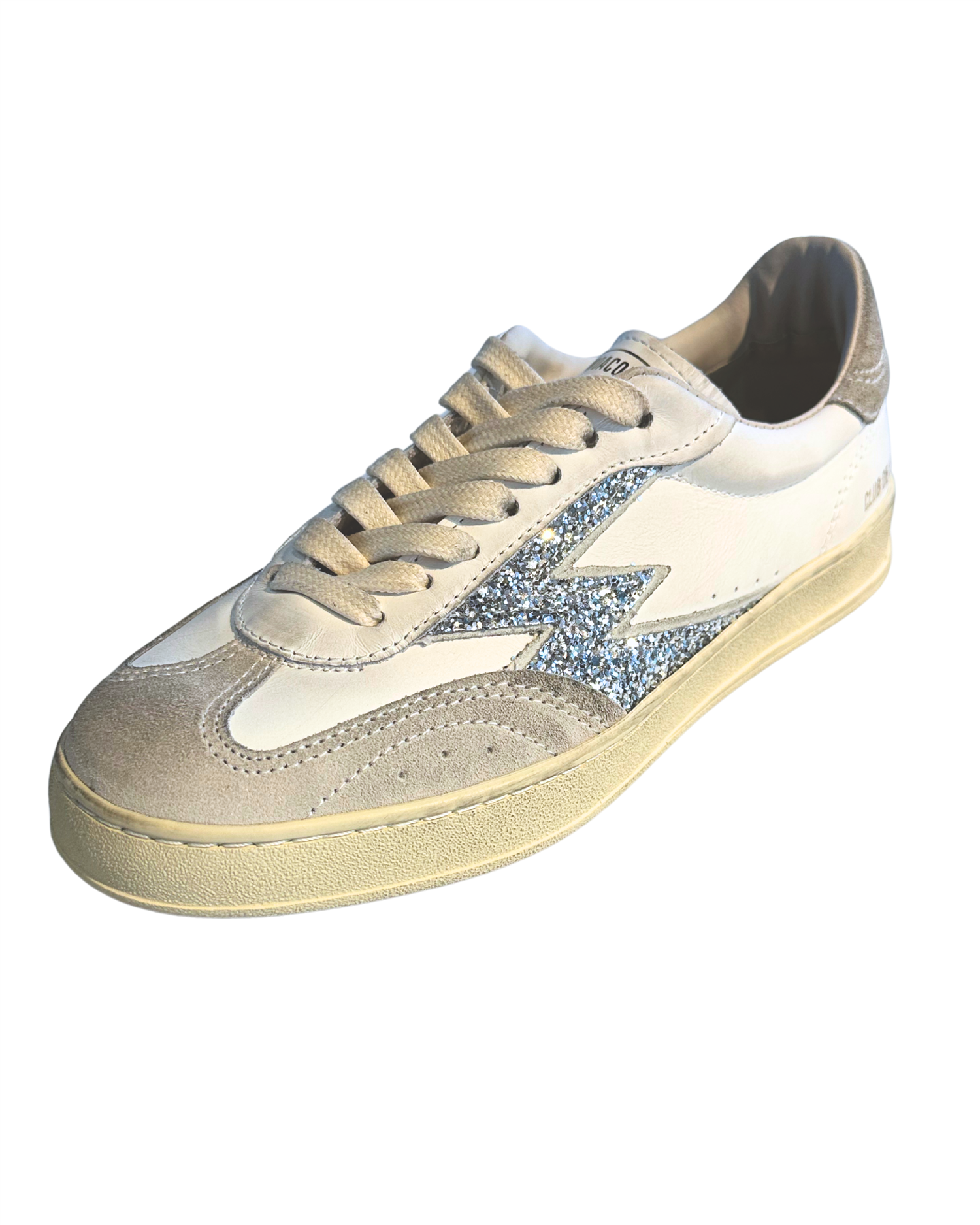 Iconic Mule fra Moa Concept er en lav hvit sneaker laget i Italia, detaljert med off-white semskete detaljer og glitterlogo. Skoene er ikoniske med sin glitterlogo i sølv, off-white semskete tunge, smørfargede såle med "skitten effekt" og lisser. Skoen er laget for å bære et preg av bruk.