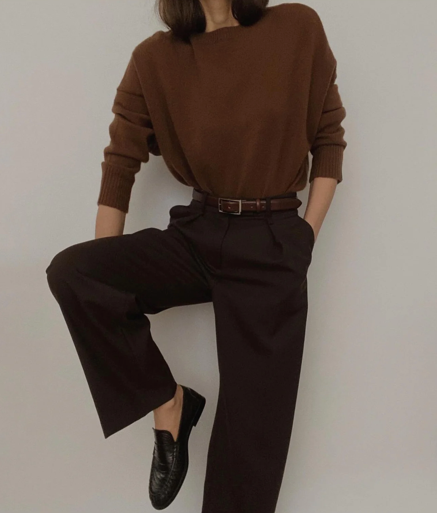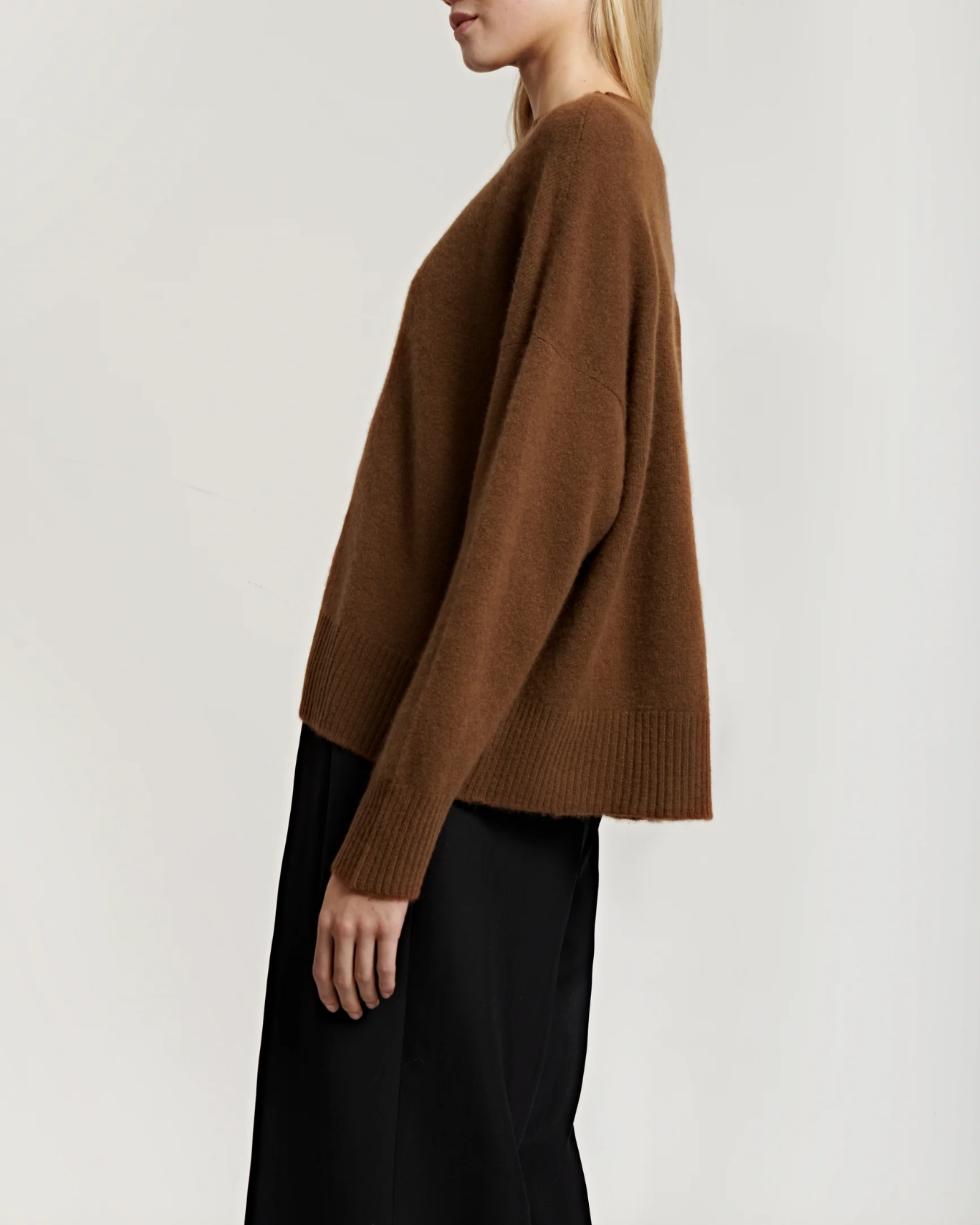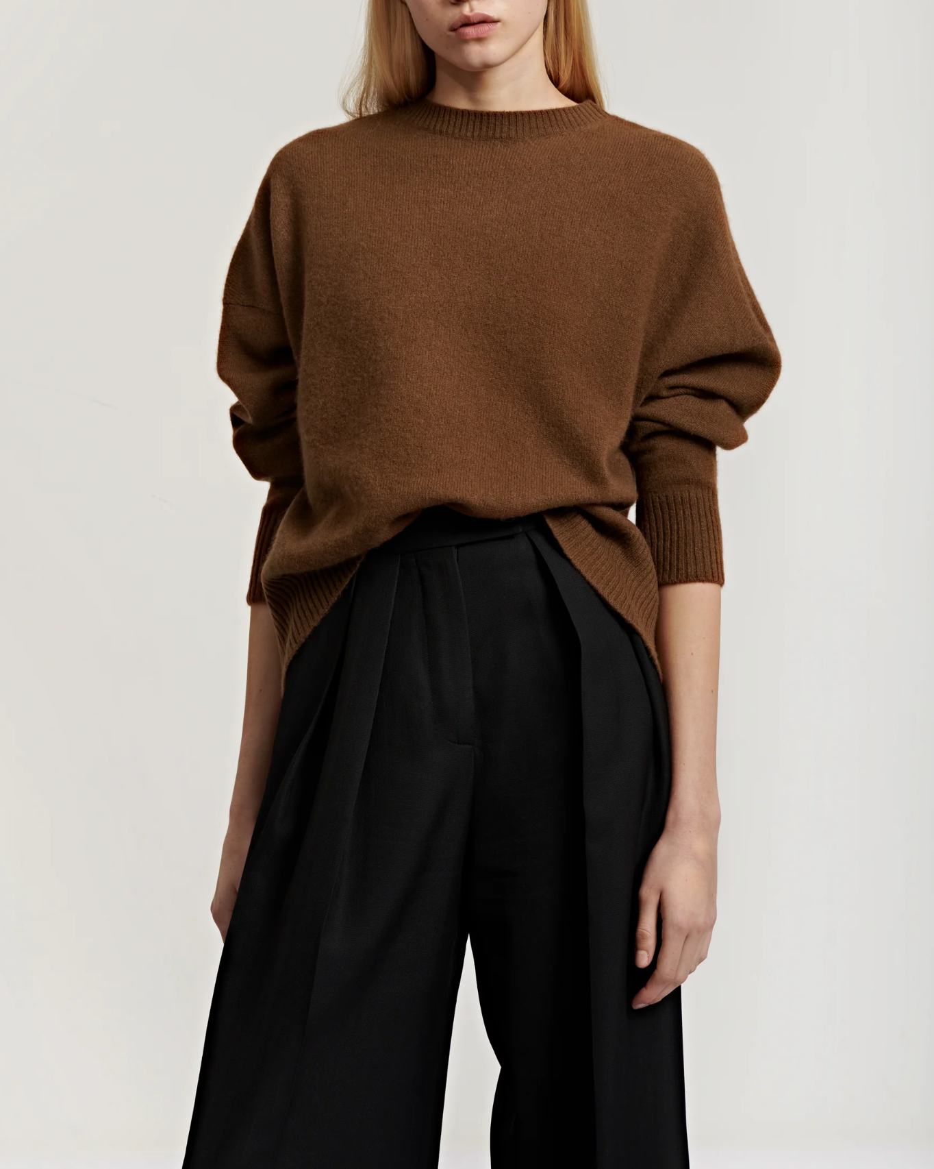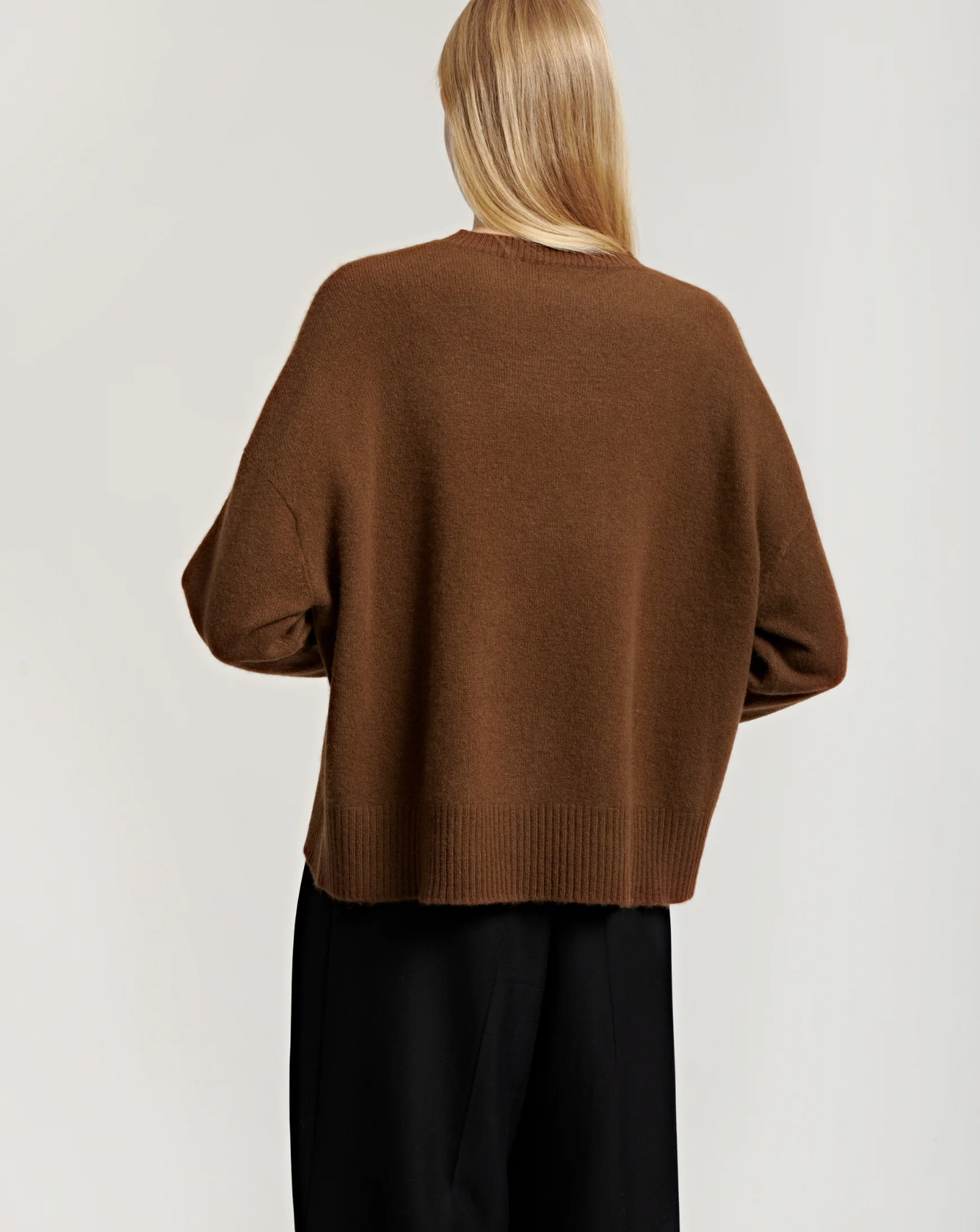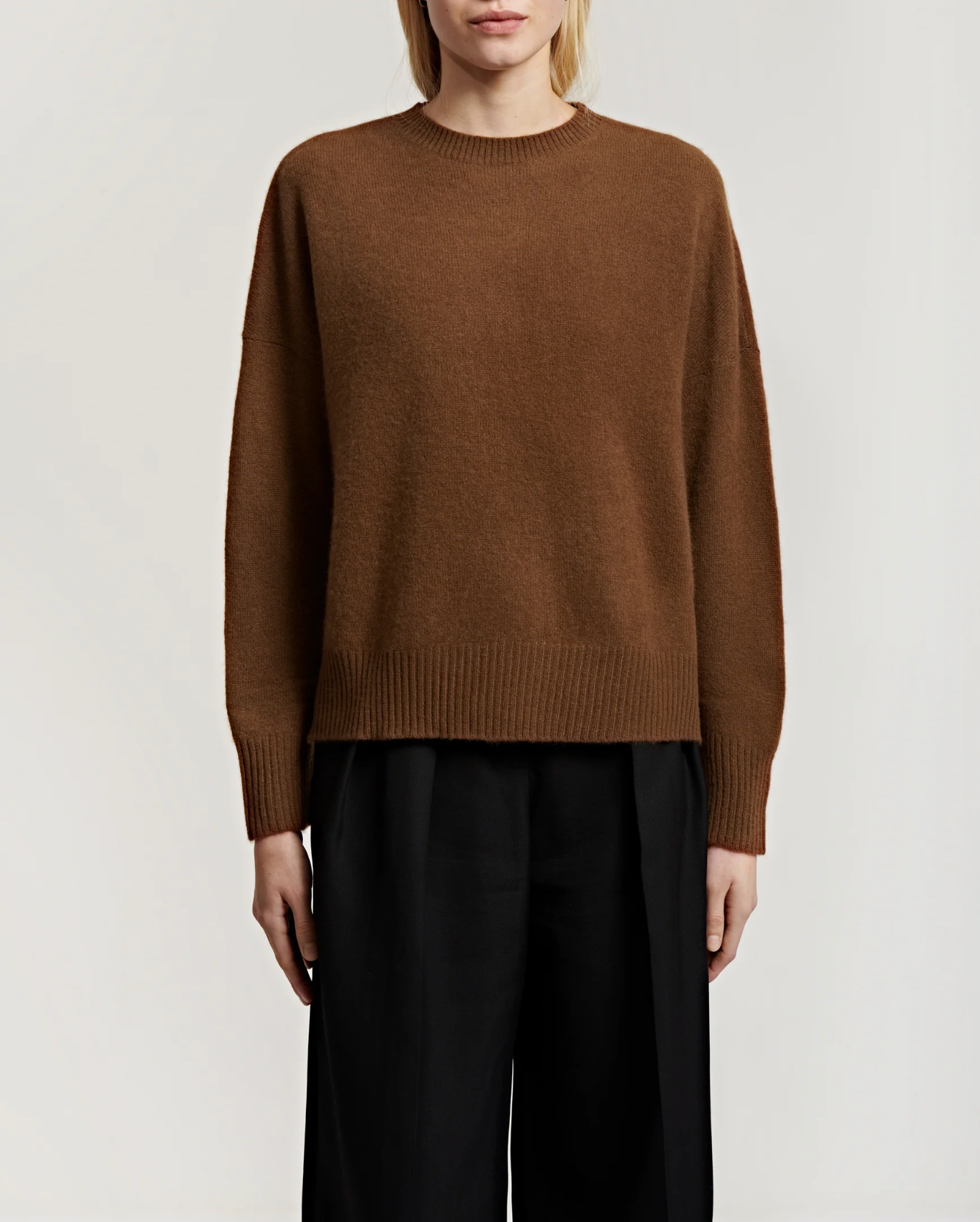 India Sweater Autumn Brown fra Santosh er idealet av nordisk design, laget av deilig mongolsk kasjmir. India er en luftig og avslappet genser med senkede skuldre og en klassisk crew neck. Bruk den delvis brettet inn i jeansen for en mer tilpasset look - eller løs og luftig til noen vide jeans, for å sikre det baggy og sjarmerende preget.