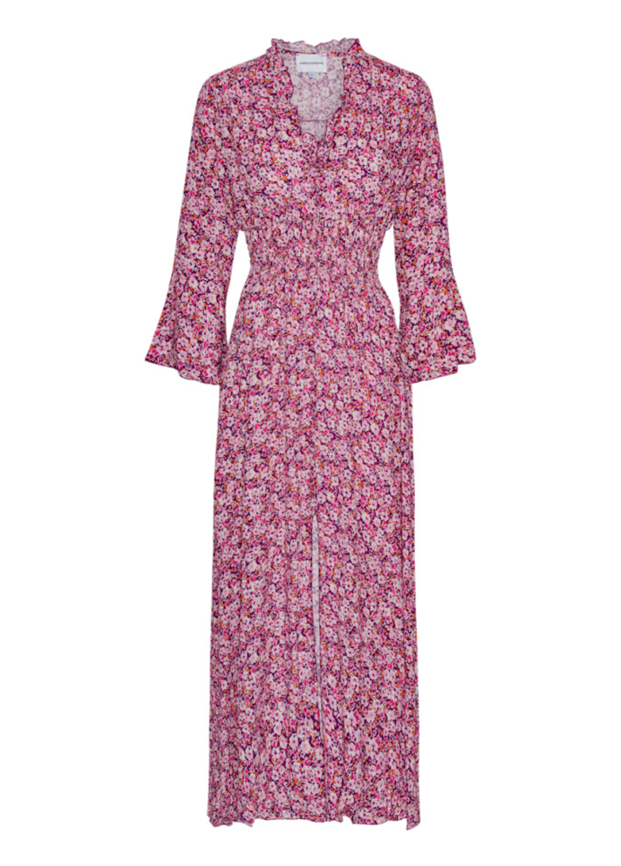 Sally Long Dress fra American Dreams er den ideelle kjole til både formelle anledninger og sommerens happenings. Kjolen har et smocket liv og utringning i front med knappestolpe. Ermene på kjolen er trekvart lange, med en utsvinget volangkant ved enden. Kjolen er laget av deilig viskose, i et nydelig blomstermønstret motiv, med eksklusive knappedetaljer og en frynset krage. Vi anbefaler å bruke kjolen med tights og boots for å style den mot kaldere tider, eller til et par søte heler eller flip flops i sommervarmen.