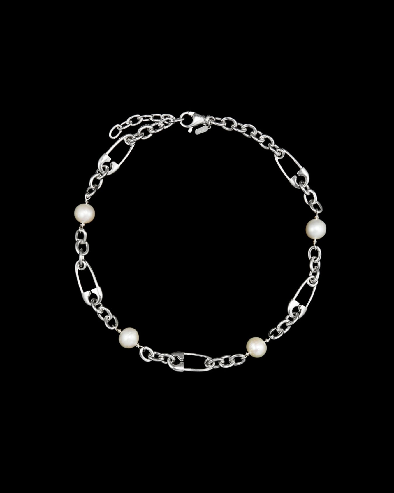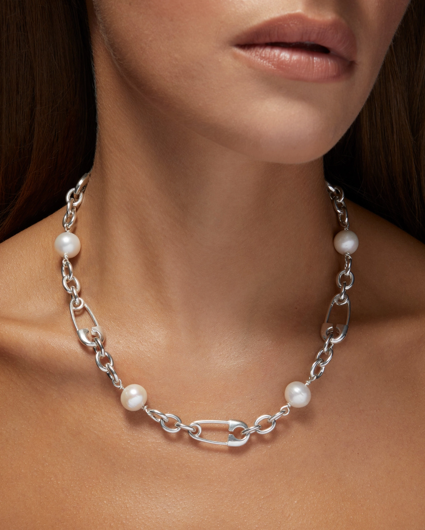 Rebel Rebel Necklace er en forsterket versjon av Maria Nilsdotters "Rebel" design - med ytterligere sikkerhetsnåler og røffe detaljer som kontrasterer mot de myke ferskvannsperlene. Smykket danner en punket og klassisk look, et iøyenfallende smykke som krever oppmerksomhet.