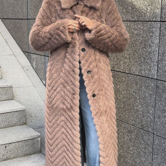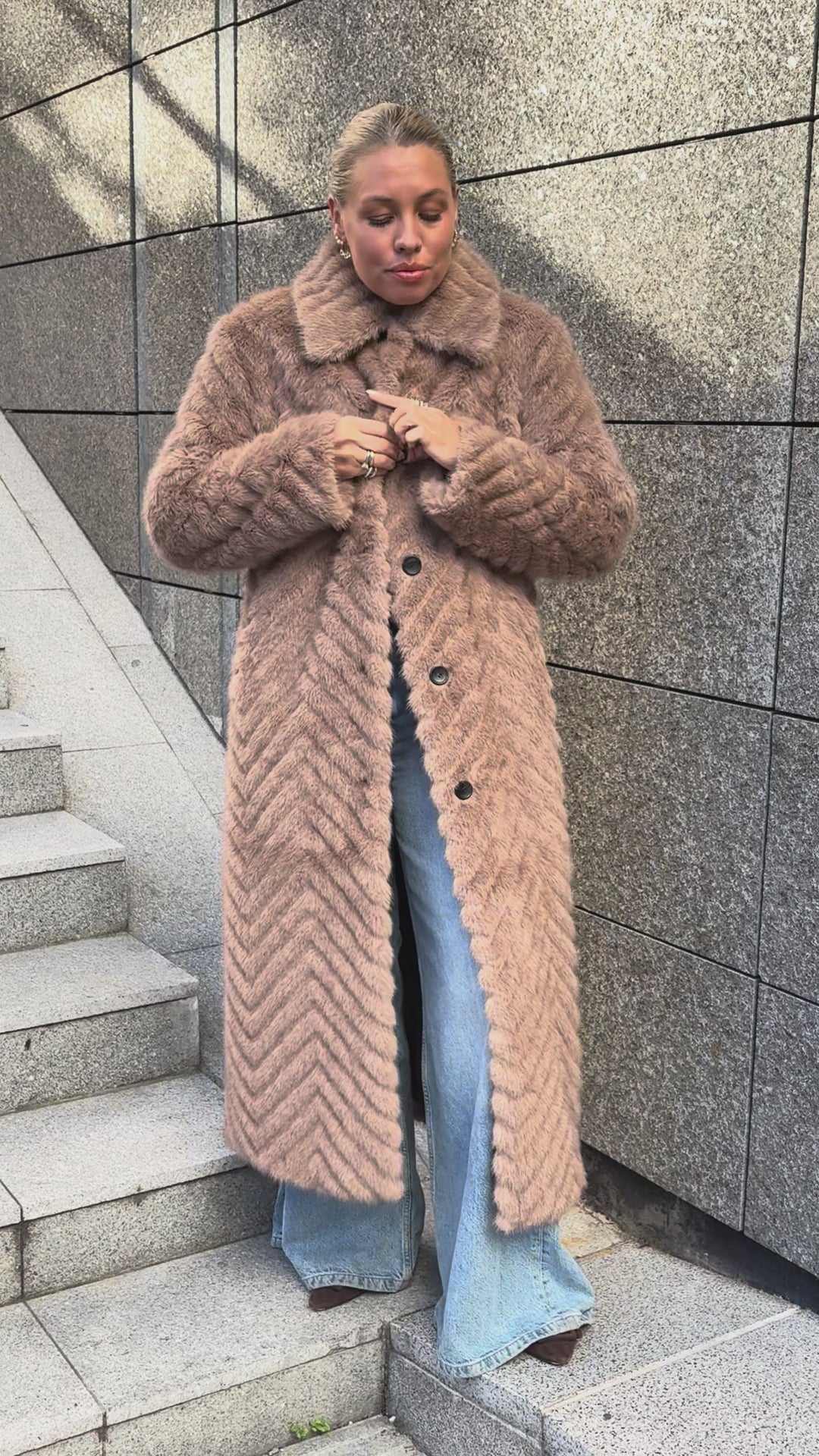 Scarlet Faux mink coat fra Studio AR er svaret på årets trendjakke - fuskepels, chevronstripet mønster, og en deilig kameltone. Scarlet har en avslappet og løs passform, med lekre brune knappedetaljer og innfelte striper i fuskepelsen, samt en bred og elegant krage. Denne kåpen er det perfekte tilskudd til årets høst- og vintergarderobe - tidløs, elegant og fremtredende på samme tid.